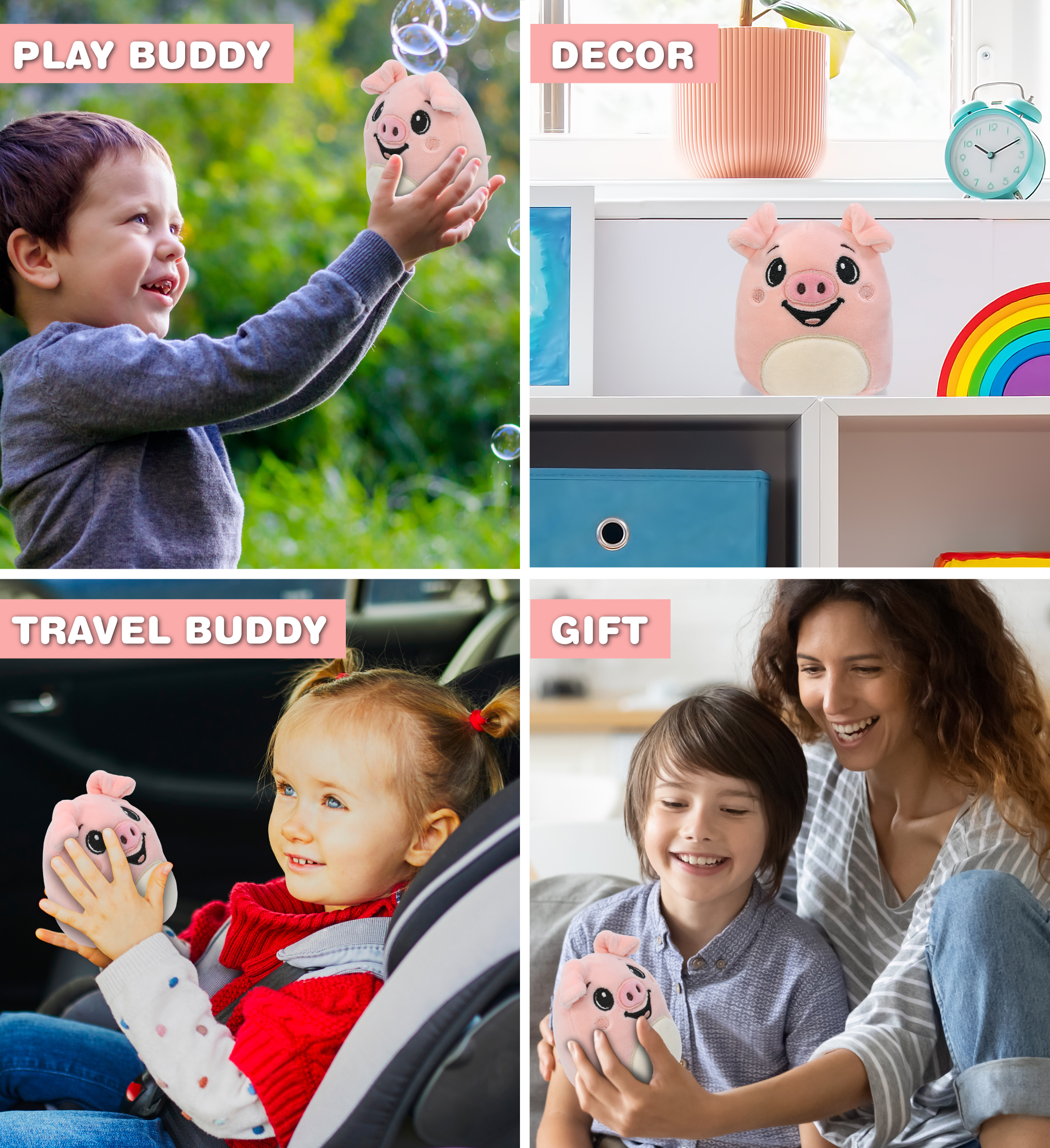 - The Soft Plush Pig Toy Is For Everyone Who Loves Squishy Stuffed Animals – Every animal lover will be thrilled to hug, cuddle, and squeeze the Snug-Mooshies pig. Whether you are looking for a cute animal plush friend for yourself or to gift, this stuffed animal pig is perfect. The small squishy stuffed animal makes an excellent cuddly plush toy stuffed animal for all ages as a comforting, stress-releasing stuffed animal for kids and adults.