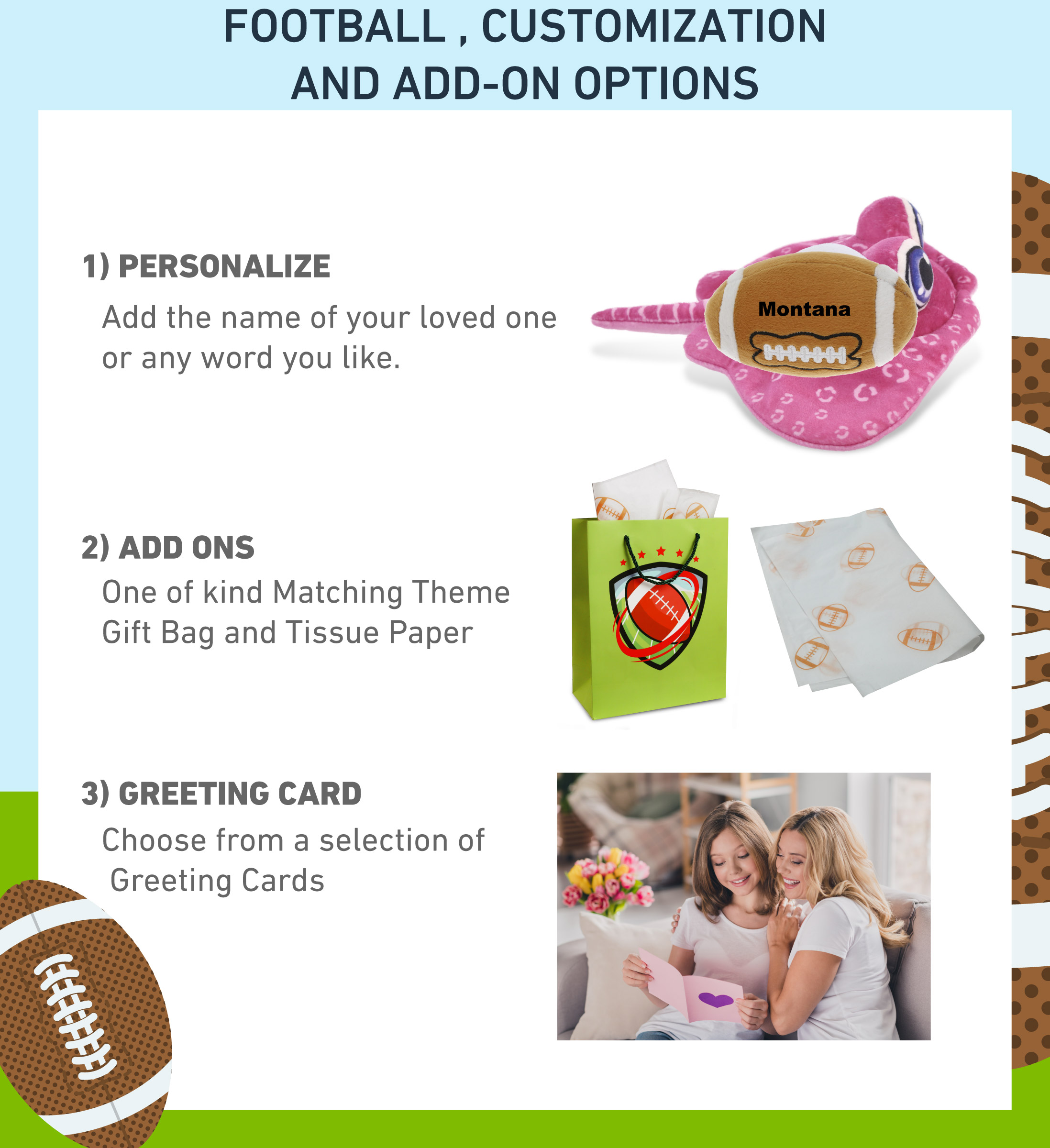 • Personalization, Customization, and Add-On Options – Super Soft Sports Stuffed Animal Plush Buddies Pink Stingray comes customized with a football plush. You can personalize it with the name of your loved one imprinted on the item. You also have the option to add some or all of the cool add-ons to make your gift extra special: 1) Gift Bag; 2) Tissue Paper; 3) Greeting Card.