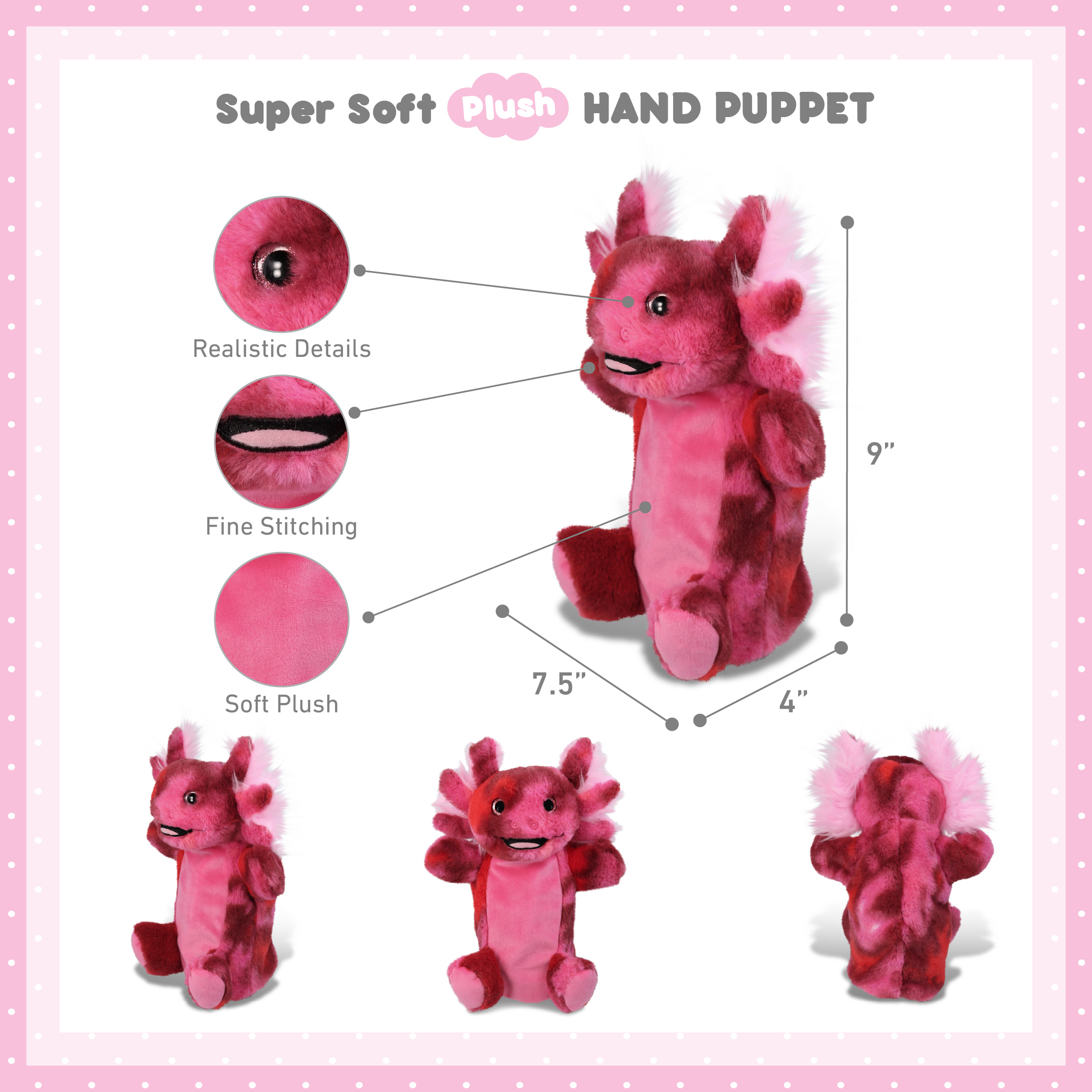 • Includes 1 DolliBu Pink Tie-Dye Axolotl Stuffed Animal Plush Hand Puppet – The plush axolotl animal hand puppets are designed with realistic details of a wild creature axolotl animal, like its characteristic gills. The opening of this axolotl plush kids hand puppet is just enough to allow finger flexibility for expressive movement. Makes great axolotl gifts for kids and for collectors of wild animal puppets or cute plush toys for kids.
