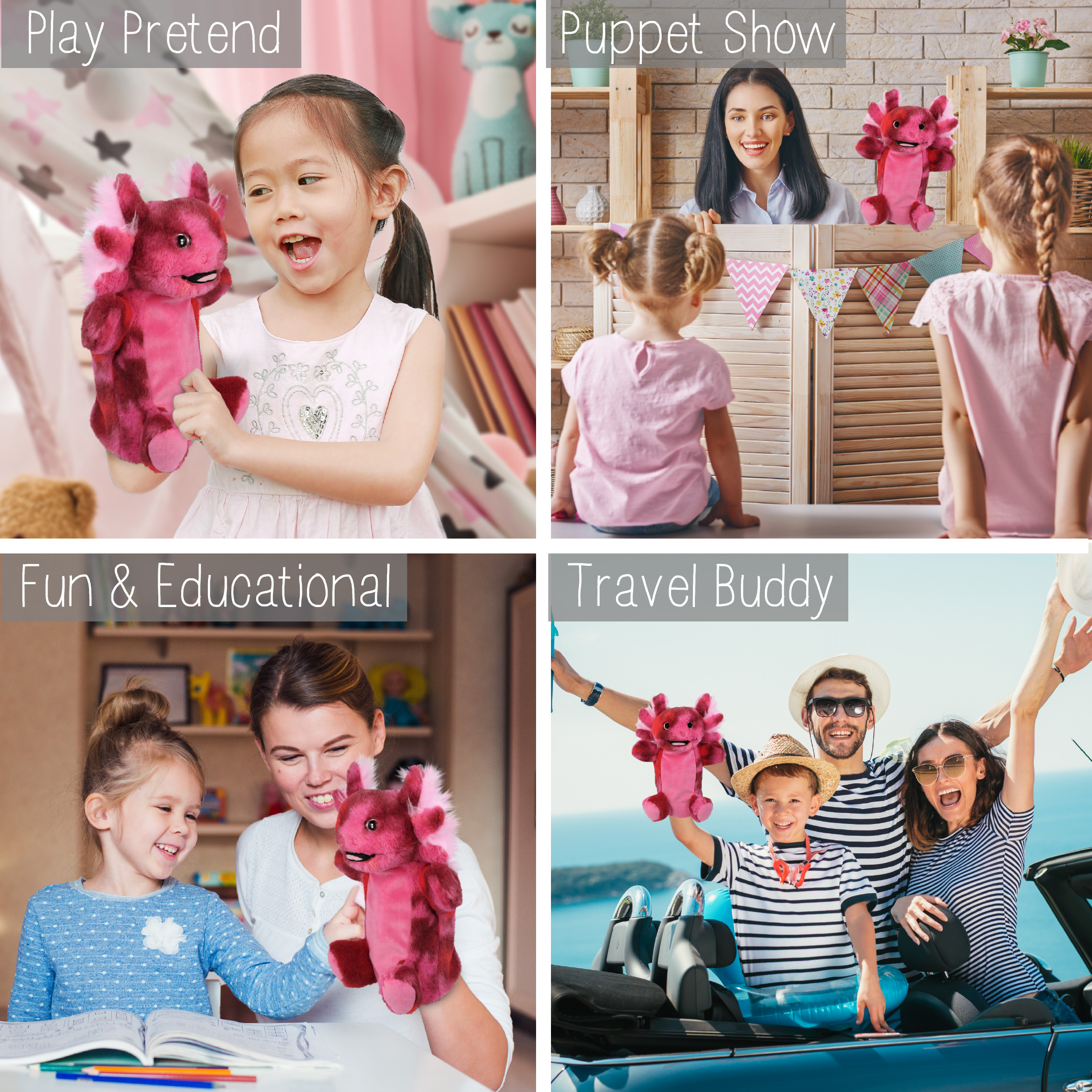 • Perfect Animal Hand Puppets for Kids – This friendly Axolotl animal puppets for toddlers 1-3 and up makes a great companion for learning and pretend play. Hand puppet for kids helpa parents and teachers create fun learning environment for kids. Collectors of hand puppets for adults and kids and axolotl toys will love to add the cute axolotl plush to their collections, and they make great axolotl gifts for boys and girls who love puppet animals.