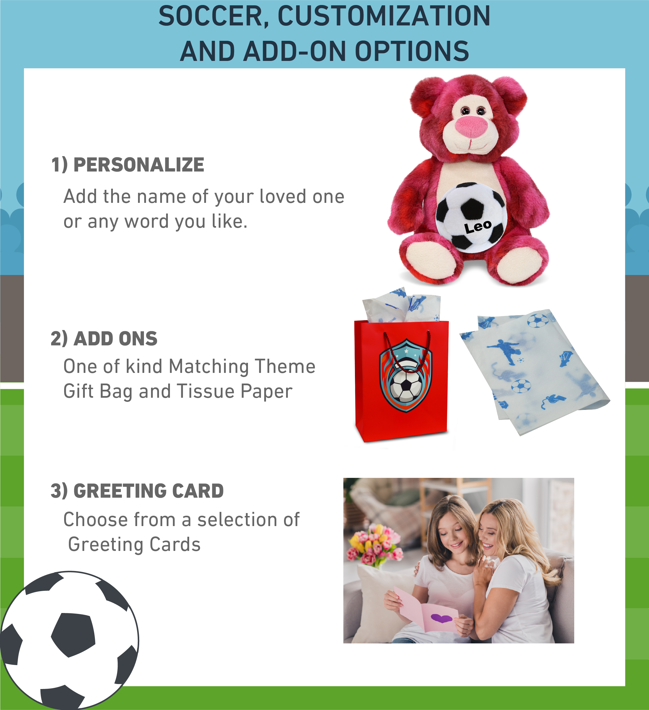 - Personalization, Customization, and Add-On Options – This Super Soft Stuffed Animal Pink Tie-Dye Bear Plush comes customized with a Soccer Ball Plush. You can personalize it with the name of your loved one imprinted on the item. You also have the option to add some or all of the cool add-ons to make your gift extra special: 1) Gift Bag; 2) Tissue Paper; 3) Greeting Card.