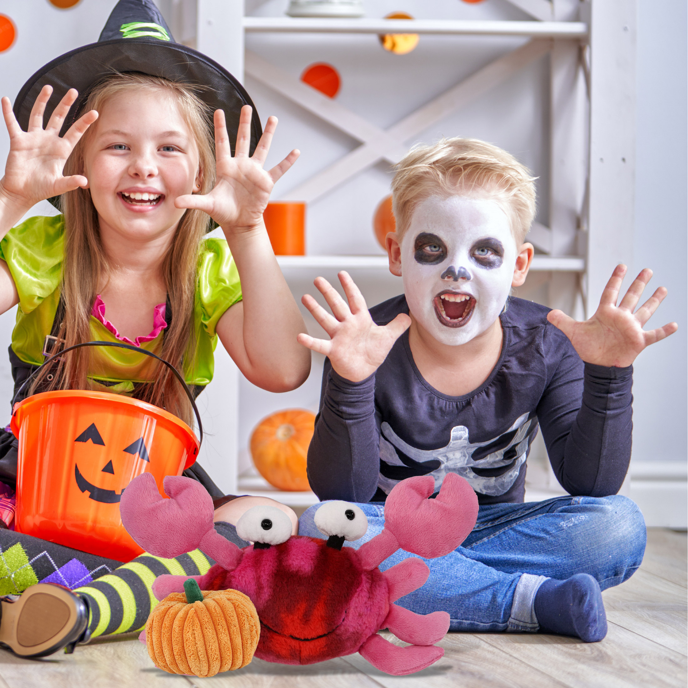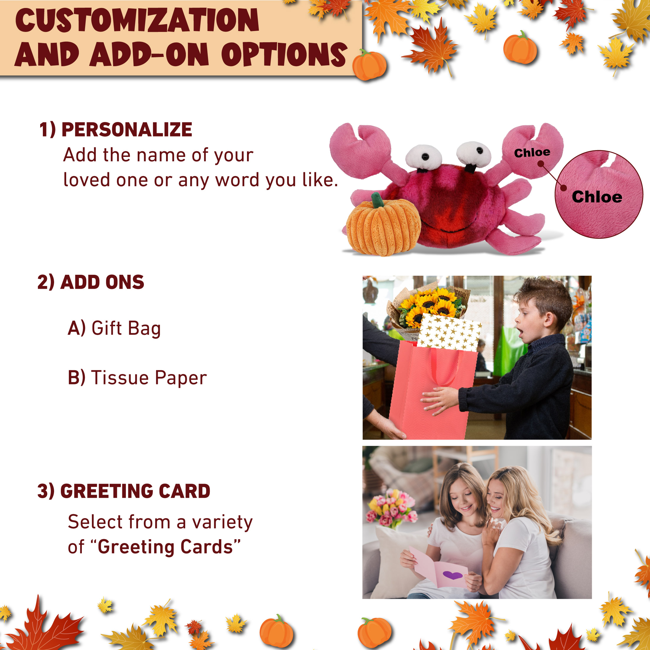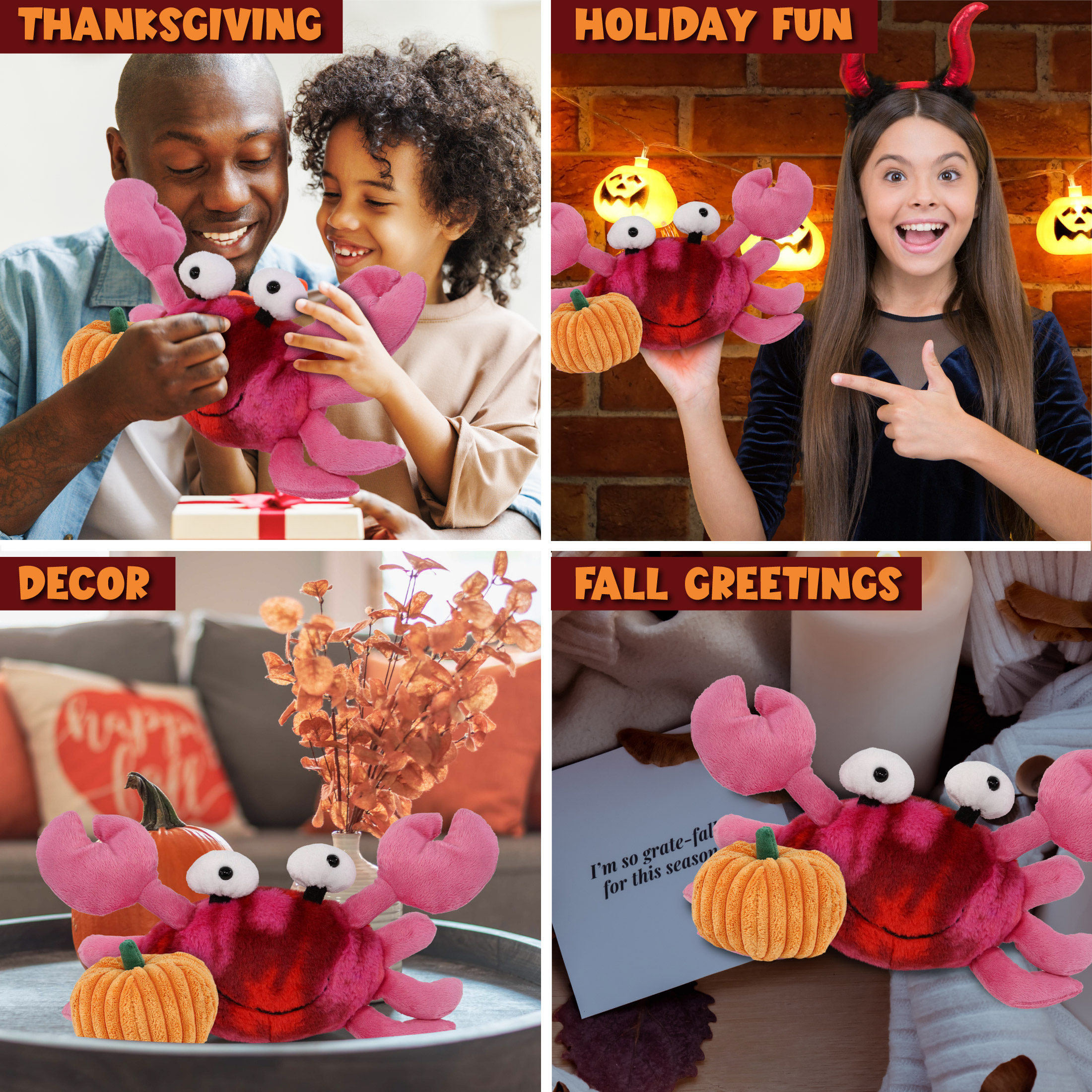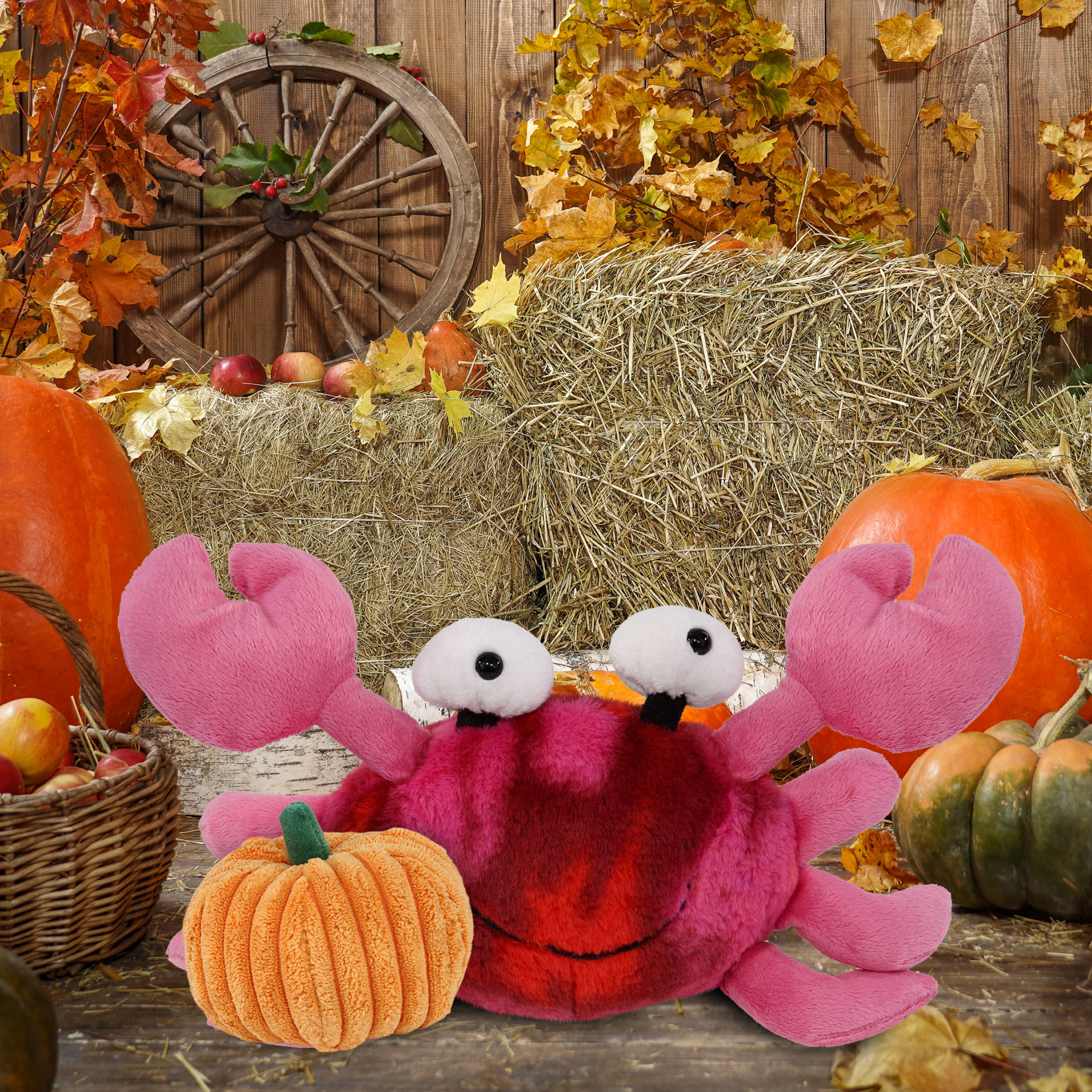 - The Crab Plush Pumpkin Stuffed Animal Is for Everyone Who Loves Halloween Toys – The Super Soft Crab stuffed animal pumpkin plush toy designed with fall plush theme makes for sweet Halloween kids gifts, babys first Halloween gift and Thanksgiving gifts for friends and family. Welcome spooky month and share the fun of trick-or-treating with loved ones by gifting them a cute custom stuffed animal crab plush doll with a pumpkin soft toy.