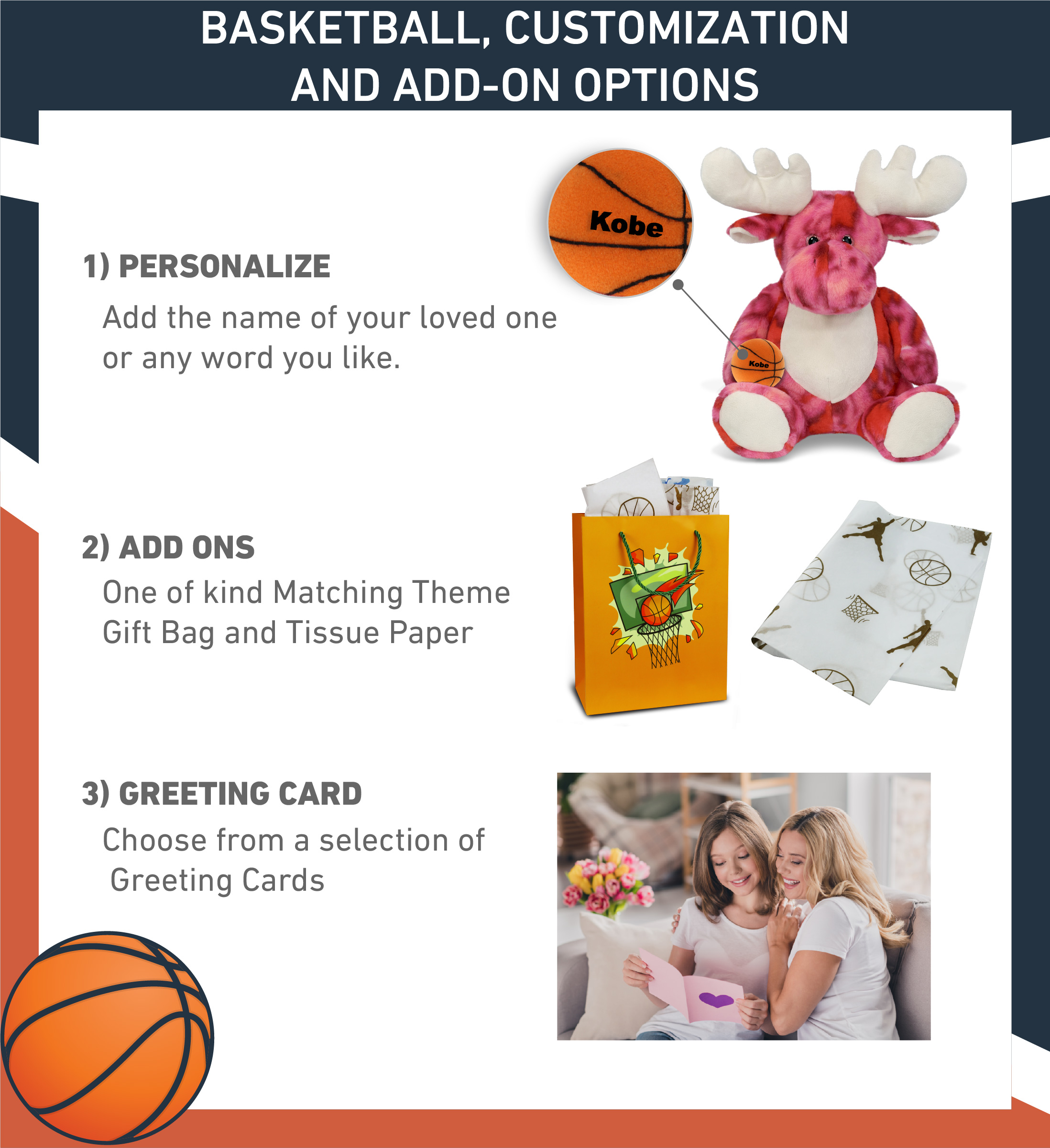 - Personalization, Customization, and Add-On Options – The Super Soft Sports Stuffed Animal Pink Tie-Dye XL Moose comes customized with a Basketball Plush. You can personalize your moose plush toy with the name of your loved one, which we will imprint on the item. You also have the option to add some or all of the cool add-ons to make your plush gift extra special: 1) Gift Bag; 2) Tissue Paper; 3) Greeting Card.