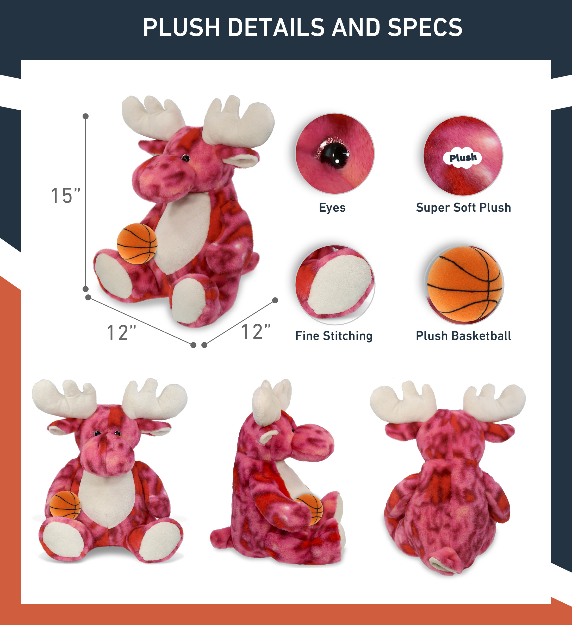 - Included with the Purchase of Adorable Cute Moose Plush – Includes 1 DolliBu Pink Tie-Dye XL Moose Super Soft Plush with a basketball plush, decorated with realistic features of a cute plush animal. The moose’s body with a sports gift ball plush makes the plush perfect for cuddles. The moose plush toy features details like its characteristic antlers. The moose’s eyes make the critter so charming. The plush toy buddy measures 12Lx12Wx15H inches.