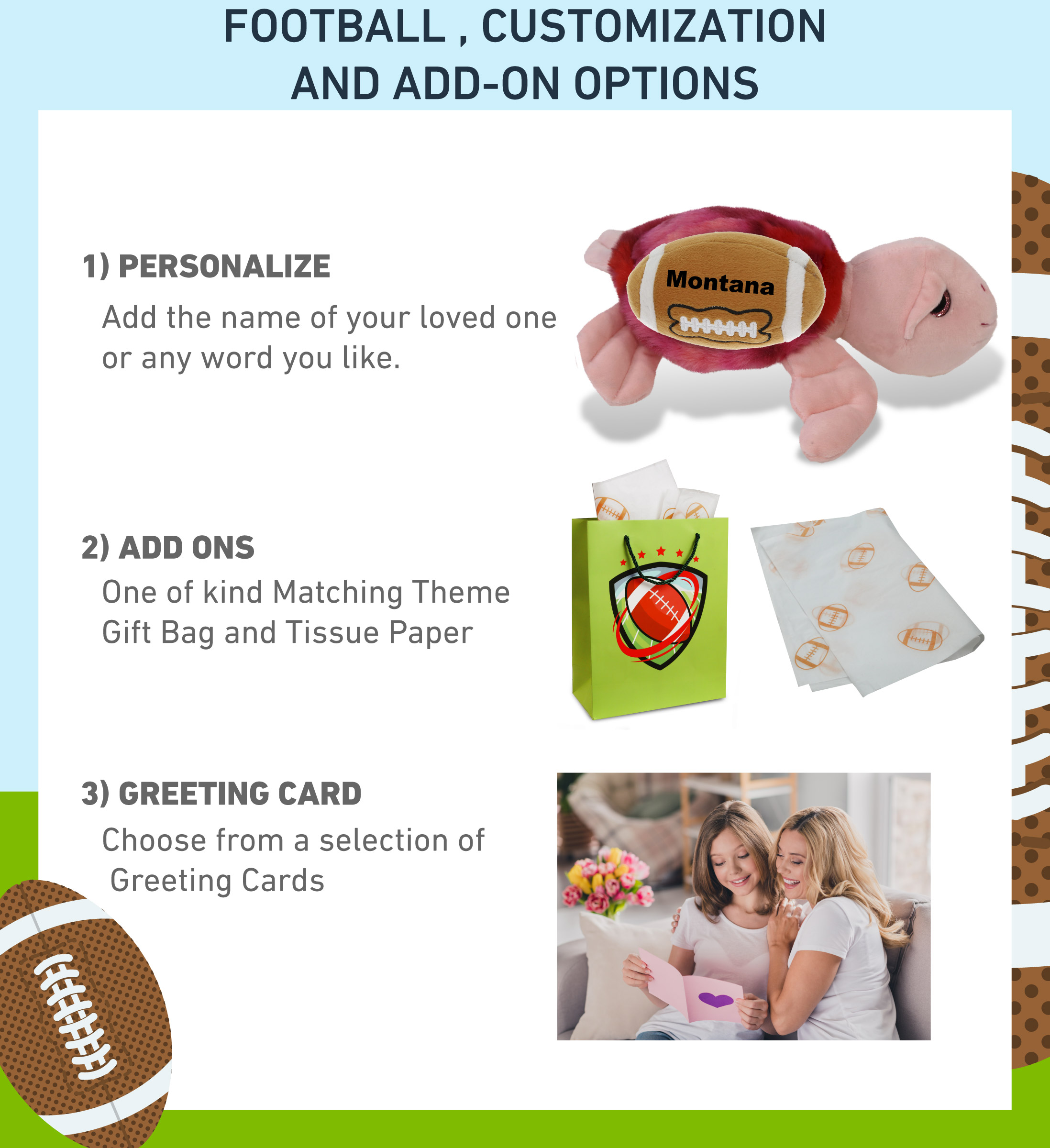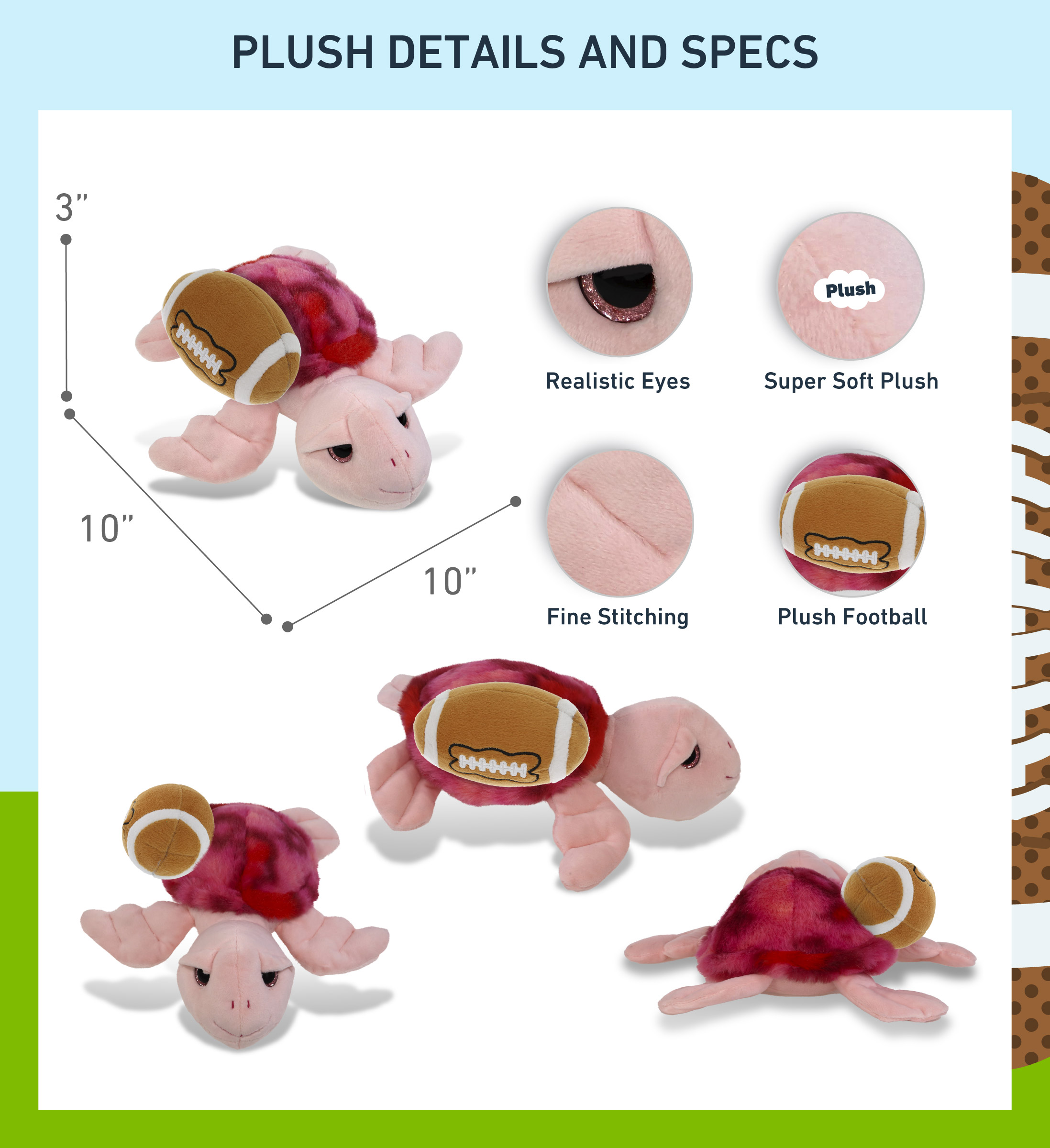 - Personalization, Customization, and Add-On Options – This Super Soft Sports Stuffed Animal Pink Tie-Dye Sea Turtle Plush comes customized with a football plush. You can personalize it with the name of your loved one imprinted on the item. You also have the option to add some or all of the cool add-ons to make your gift extra special: 1) Gift Bag; 2) Tissue Paper; 3) Greeting Card.