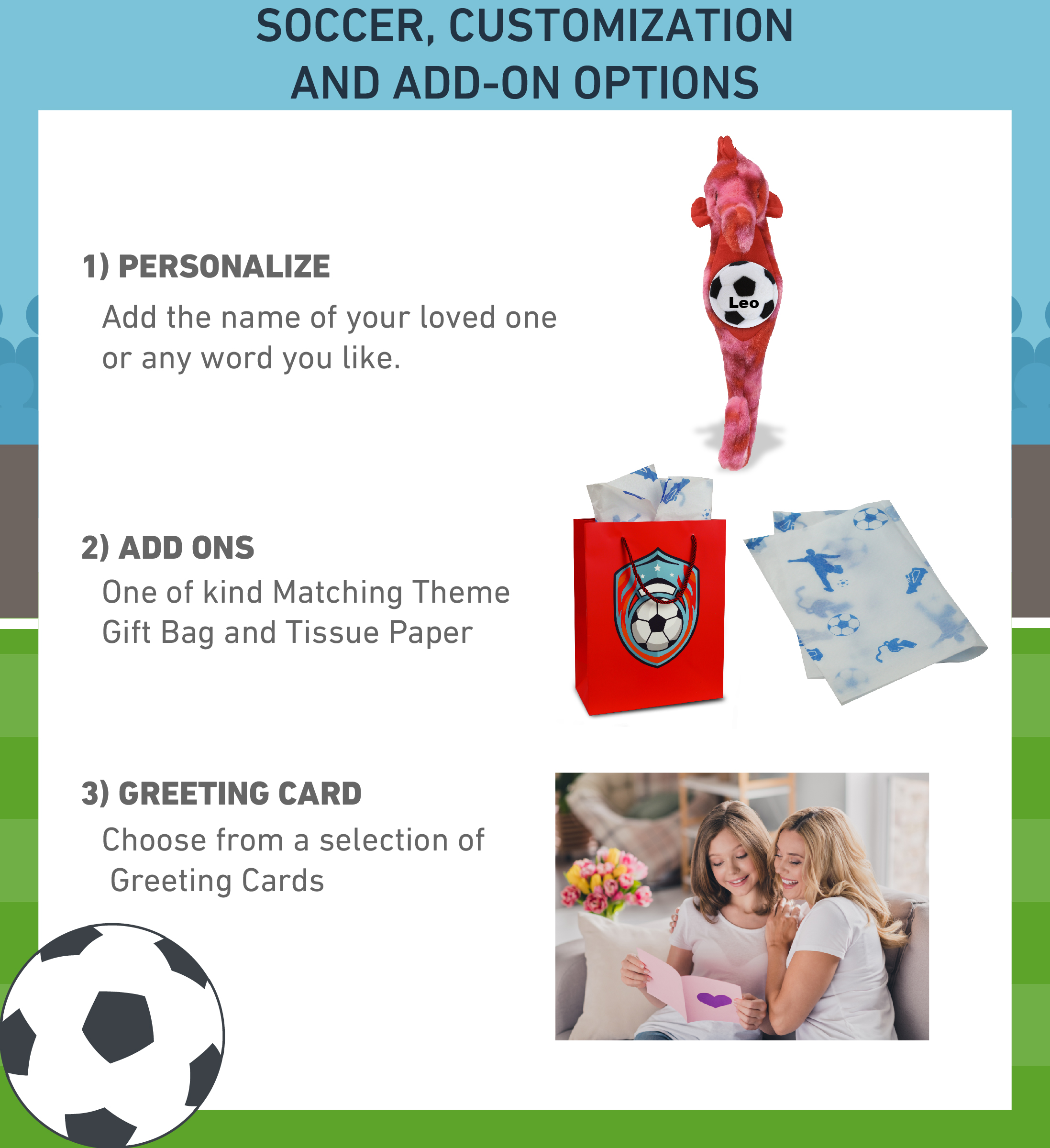 - Personalization, Customization, and Add-On Options – This Super Soft Pink Tie-Dye Seahorse sports stuffed animal comes customized with a Soccer Ball Plush. You can personalize your seahorse plush with the name of your loved one imprinted on the item. You also have the option to add some or all of the cool add-ons to make your gift extra special: 1) Gift Bag; 2) Tissue Paper; 3) Greeting Card.