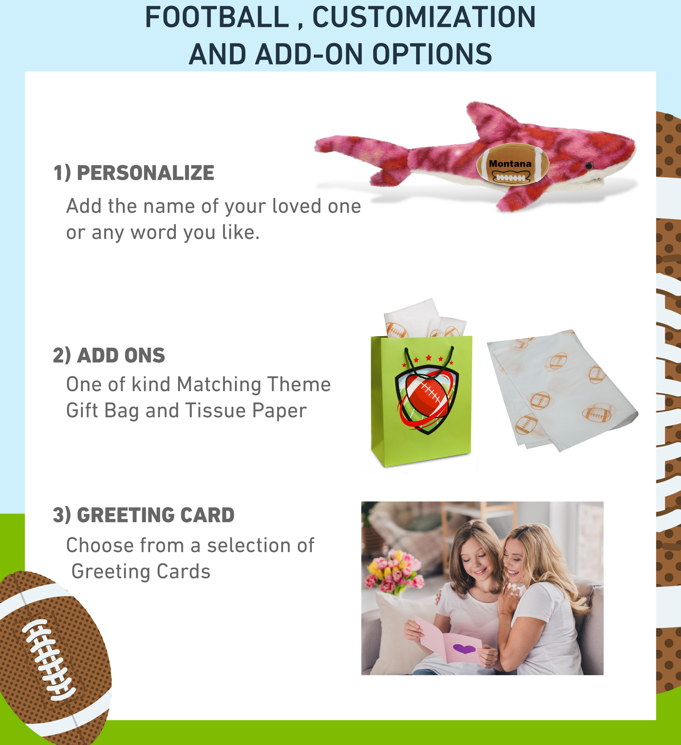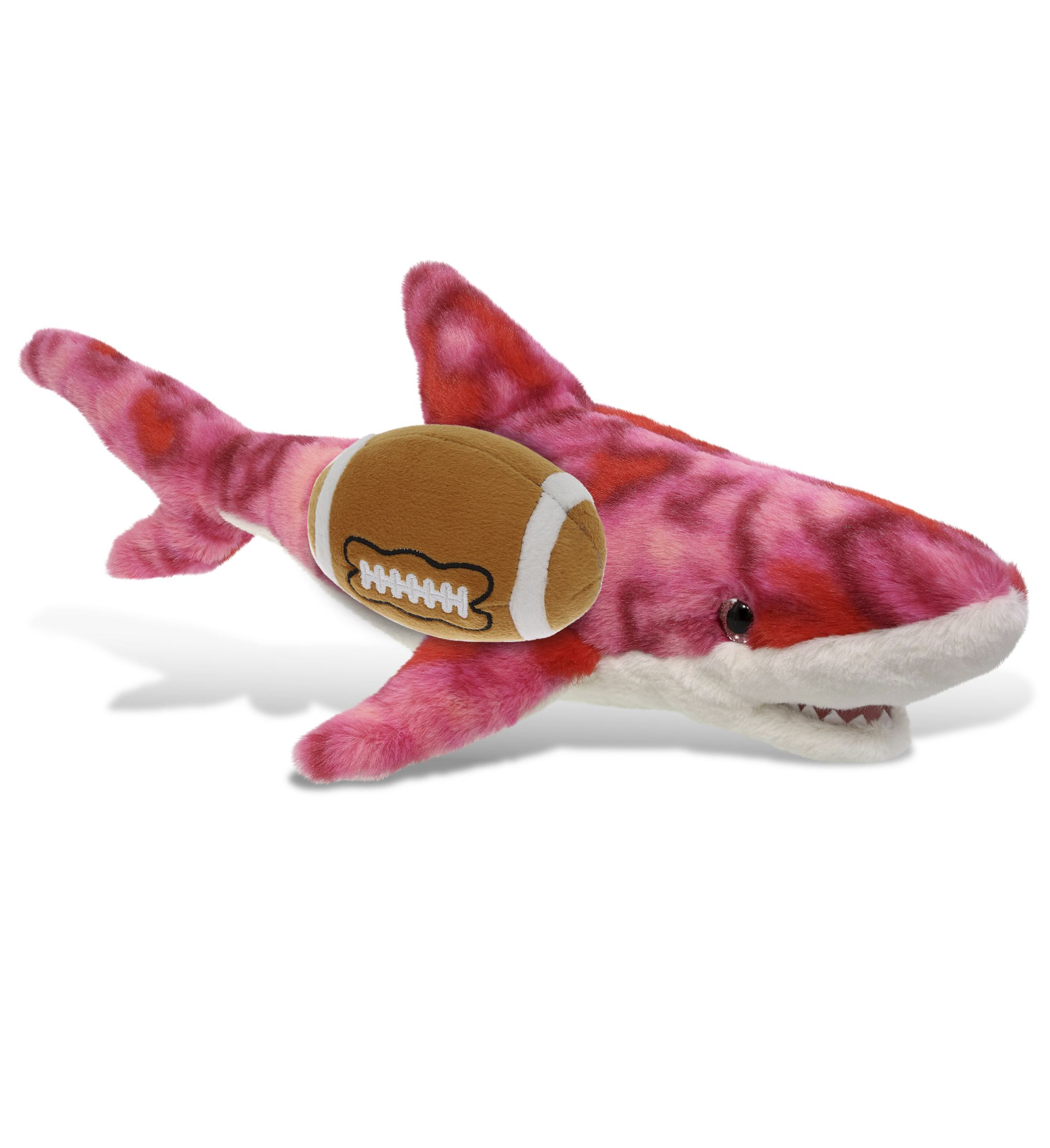 - Personalization, Customization, and Add-On Options – This Super Soft Sports Stuffed Animal Pink Tie-Dye Shark Plush comes customized with a football plush. You can personalize it with the name of your loved one imprinted on the item. You also have the option to add some or all of the cool add-ons to make your gift extra special: 1) Gift Bag; 2) Tissue Paper; 3) Greeting Card.