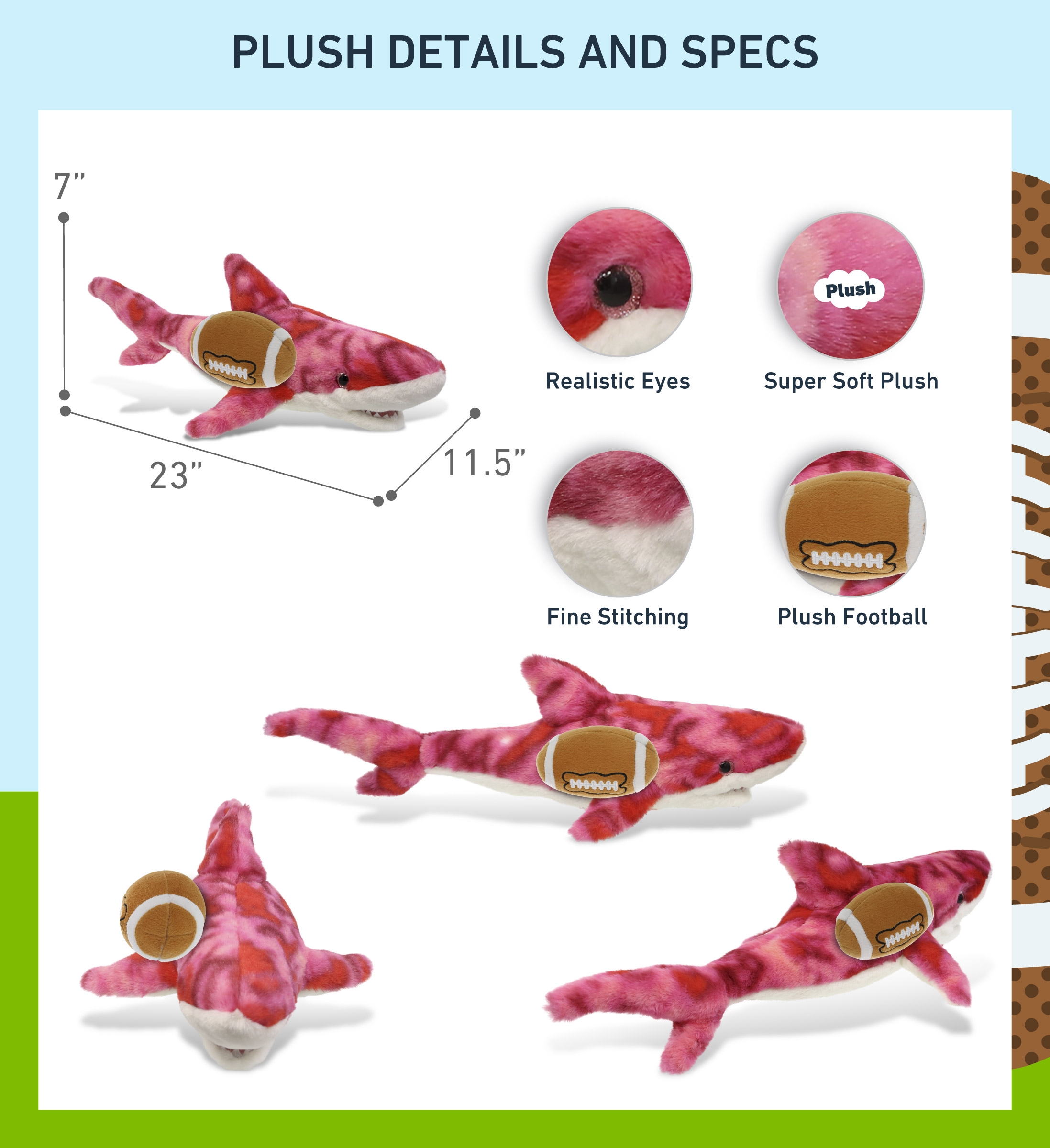 - Included with the Purchase of Adorable Cute Shark Plush – Includes 1 DolliBu Super Soft Pink Tie-Dye Shark with a football plush, decorated with realistic features of a cute shark. The body with a sports gift ball plush makes the plush perfect for cuddles. The shark plush toy features its iconic fins. The shark’s eyes make the critter so charming. The cute shark plush toy buddy measures 23Lx11.5Wx7H inches.