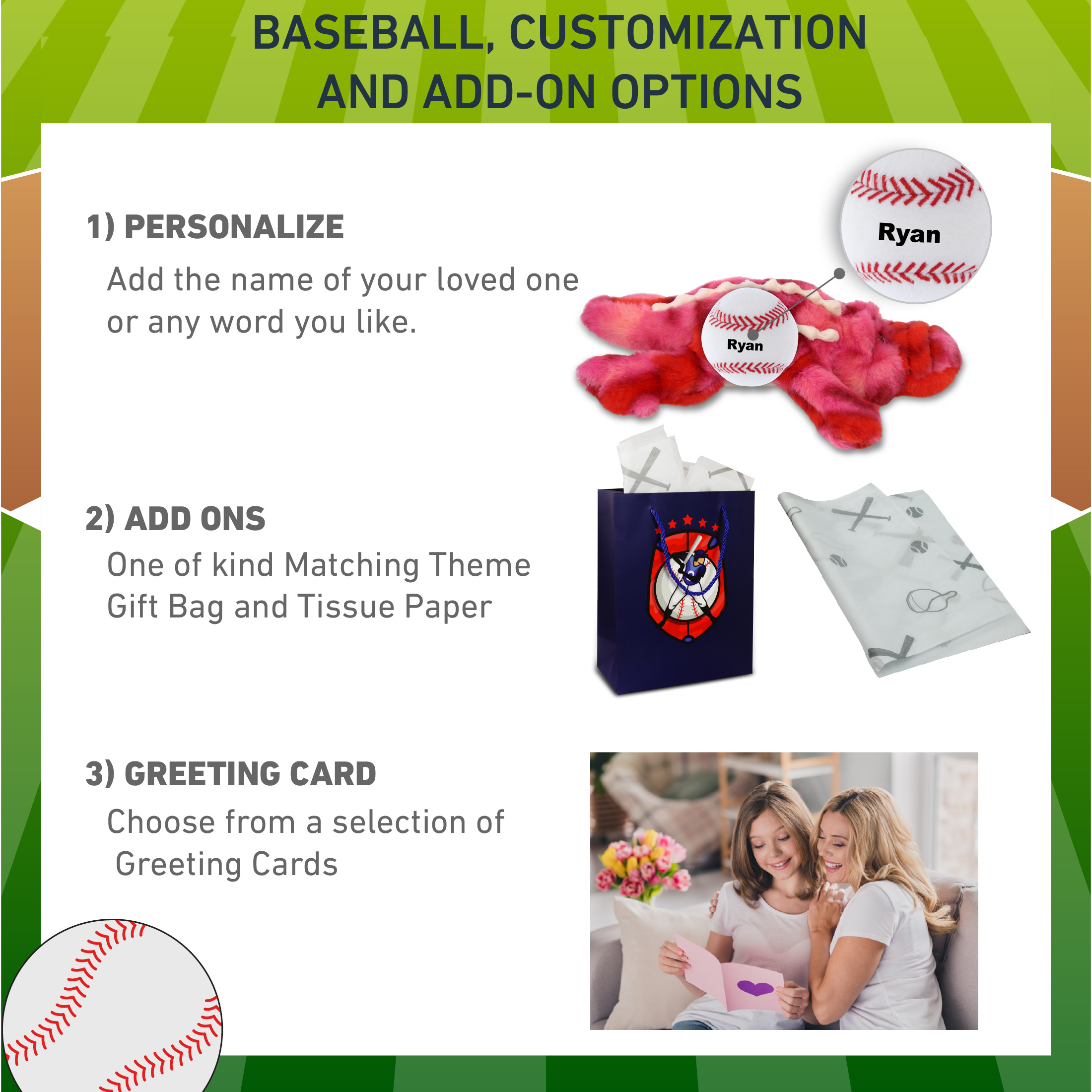 - Personalization, Customization, and Add-On Options – The Super Soft Sports Stuffed Animal Pink Tie-Dye Sitting Alligator comes customized with a small baseball plush. You can personalize your stuffed animal alligator with the name of your loved one which we will imprint on the item. You also have the option to add some or all of the cool add-ons to make your gift extra special: 1) Gift Bag; 2) Tissue Paper; 3) Greeting Card.