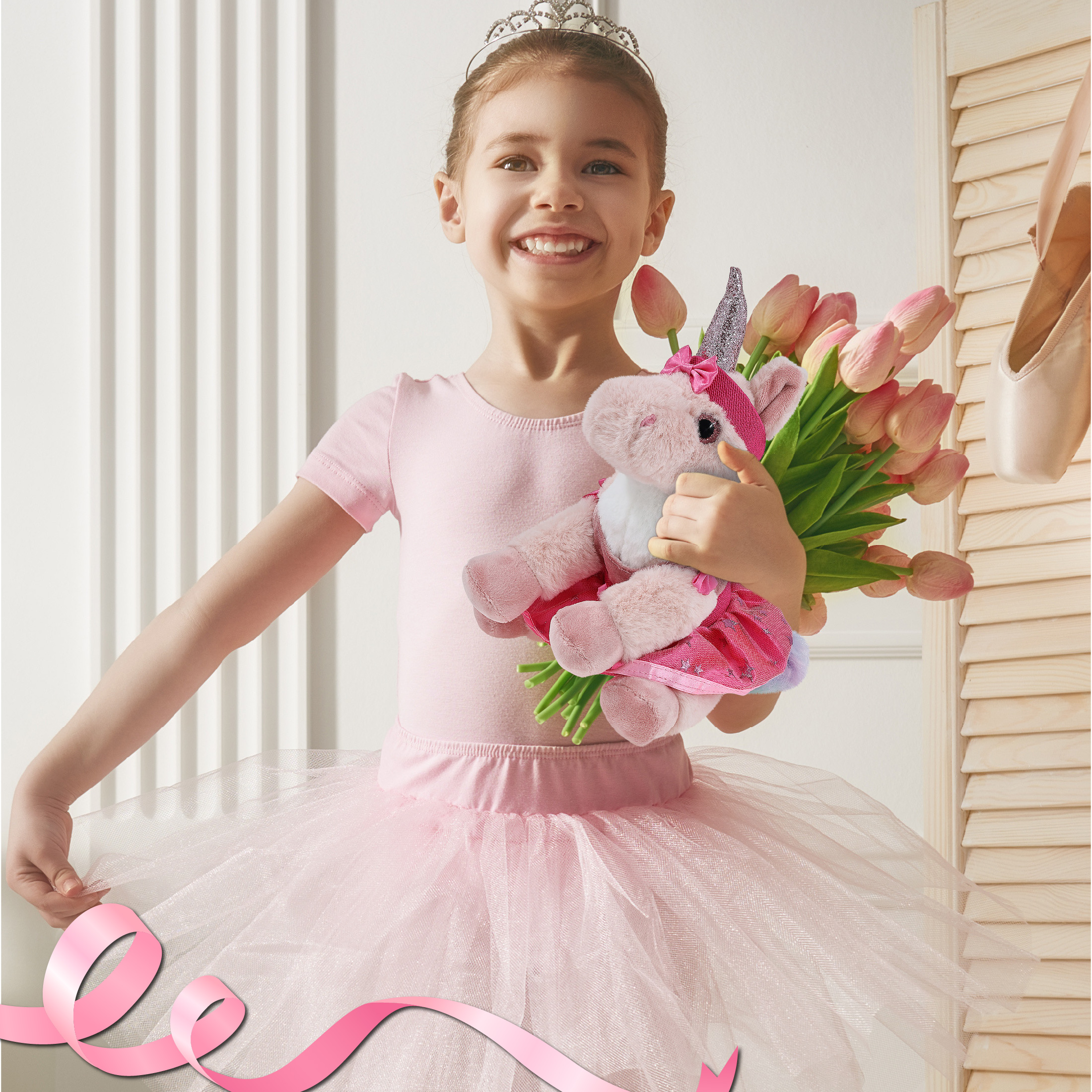 - Ballerina-Themed Stuffed Animal Pink Unicorn Doll Features a Unique Combination of Animals and Ballet – It features a cute unicorn plush with adorable pink ballerina clothes. The stuffed animal unicorn plush toy features a soft plush all over and a set of pink ballerina dress complete with a pink ribbon headband, tutu skirt, and a sleeveless top, making it a cute ballerina stuffy doll little dancers will enjoy to play and collect.