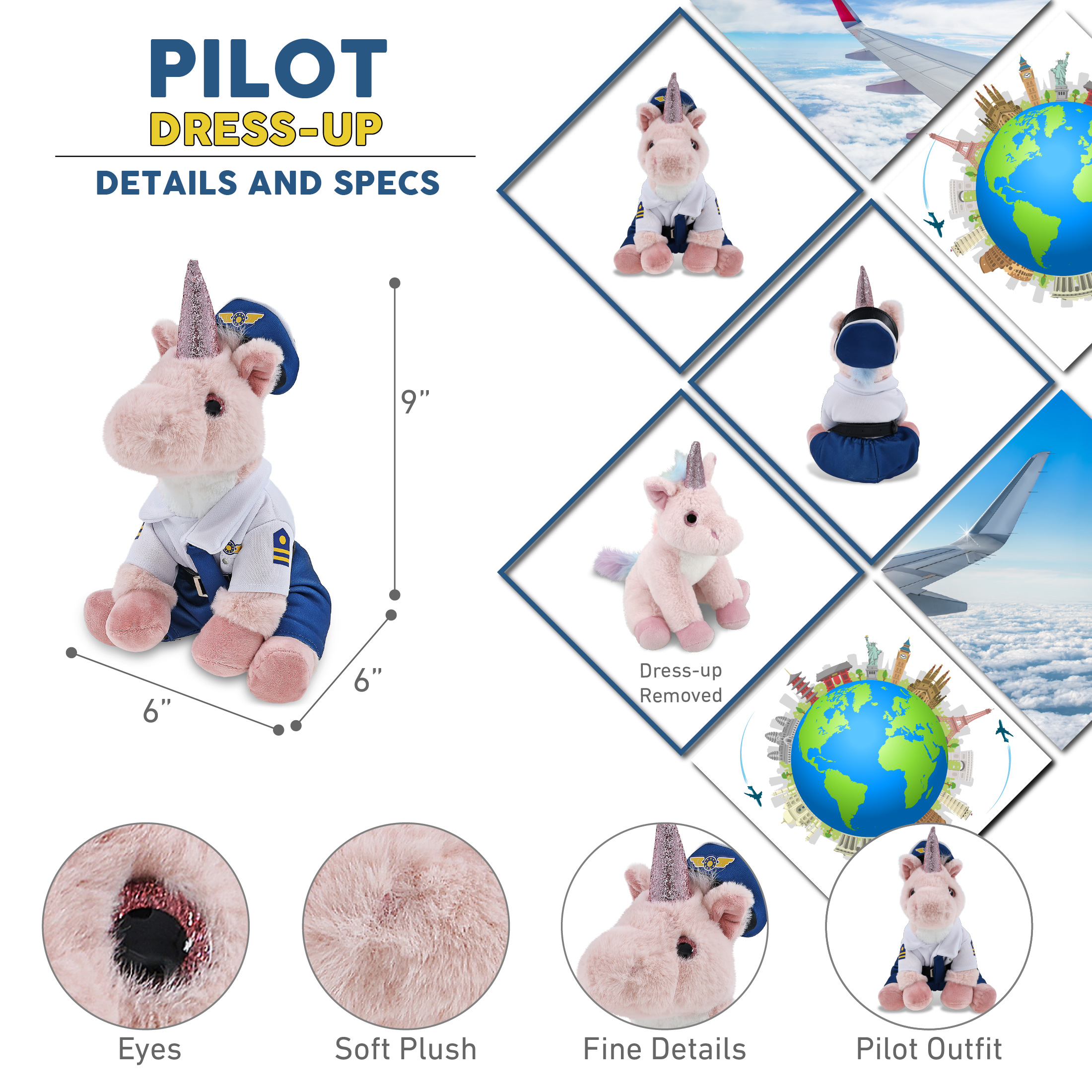- Includes 1 DolliBu Pink Unicorn Toy with Pilot Stuffed Animal Clothes – This pink unicorn plush animal arrives in an airline pilot costume. Dressed in a white shirt, pants, belt, tie, and captain hat costume, perfect for dress up, travel themes, or playtime flight adventures. Great Halloween pilot costume for your plush toys or as aviation lover gifts. This cute unicorn wearing pilot clothes for stuffed animals measures 6Lx6Wx9H inches.