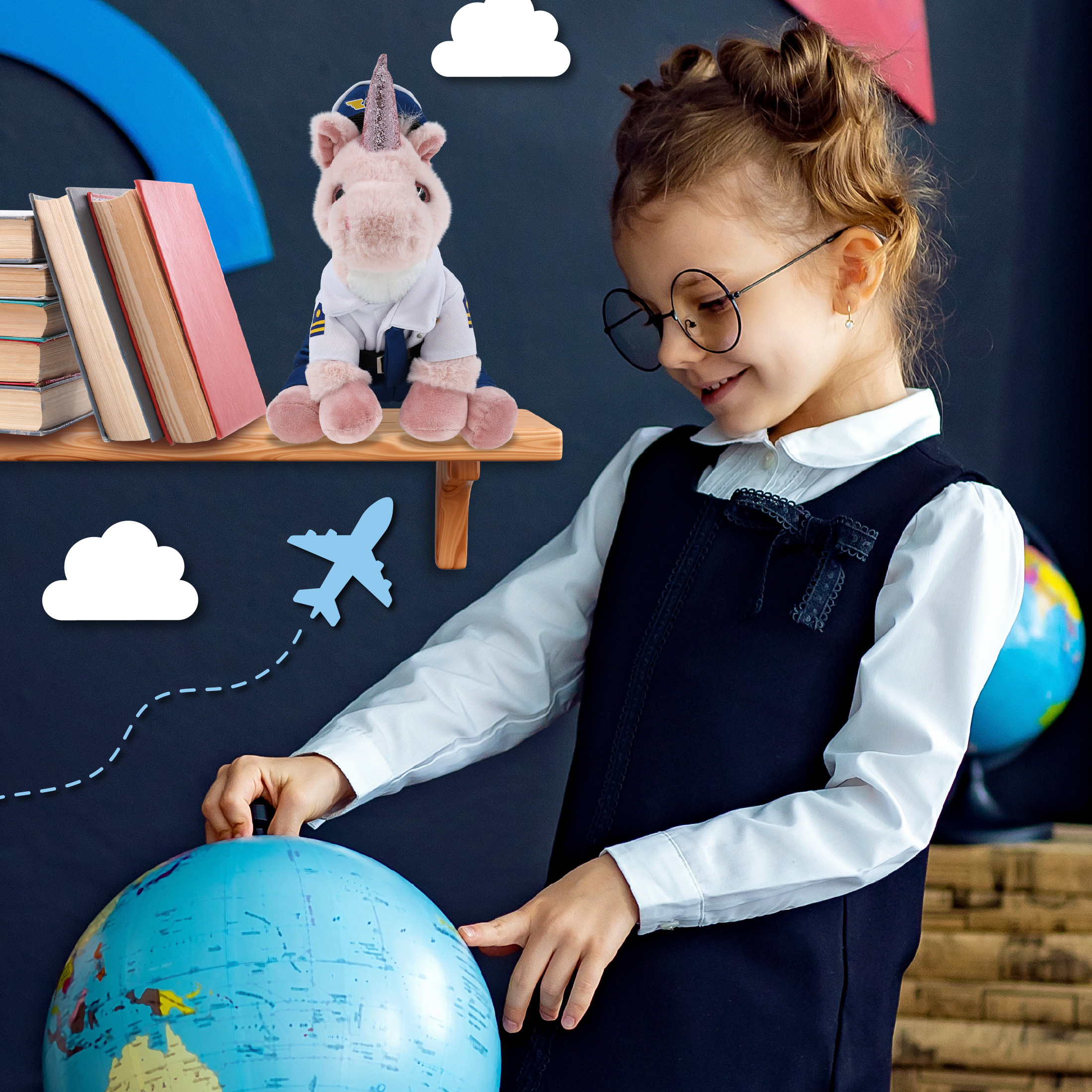 Everyone who loves fluffy toys will be thrilled to have a pilot stuffed toy, whether it’s a classic teddy bear gift or a cute unicorn plush for an aviation-themed collection. Perfect pilot fluffy stuffed animal for pretend play and as a pilot unicorn toy gifts for kids who love stuffed teddy bear with pilot stuff. Recommended for ages 3 and up. This pink unicorn doll features ready-to-fly pilot clothes for teddy bears. The pink unicorn plush features cool details and a realistic design, while the pilot dress up set features a white button-up aviation uniform shirt with printed pilot wings and sleeve stripes, blue pants with an elastic waistband, a black belt, a matching blue tie, and a classic pilot aviation hat. The pink unicorn stuffed animal plush comes dressed in a full pilot bear outfit set, with a white pilot shirt, airline captain hat, belt, and pants. Make your pilot stuffed unicorn special by adding a personalized name, which we will imprint onto the plush. You can customize your plush pilot toy by adding any of our add-ons to create the perfect gift: 1) Gift Bag 2) Tissue Paper 3) Greeting Card. The unicorn plush pilot toy is made with super-soft, premium-quality polyester materials. The teddy bear stuffed animal is designed for everyday hugs and dress up fun. The pilot plush unicorn is fun for kids who love imaginative play and aviation toys. It is a perfect addition to your collection of pilot doll accessories for stuffed toys, airline cool stuffed animal costume sets, and plush captain accessories. Includes 1 DolliBu Pink Unicorn Toy with Pilot Stuffed Animal Clothes. This pink unicorn plush animal arrives in a cute dress, an airline pilot costume. It is dressed in a white pilot uniform shirt, pants, belt, tie, and airline pilot hat, perfect for dress up, travel themes, or imaginative airline party play. Great Halloween pilot costume for your plush toys or as aviation lover gifts. This cute unicorn wearing pilot costume measures 6Lx6Wx9H inches.