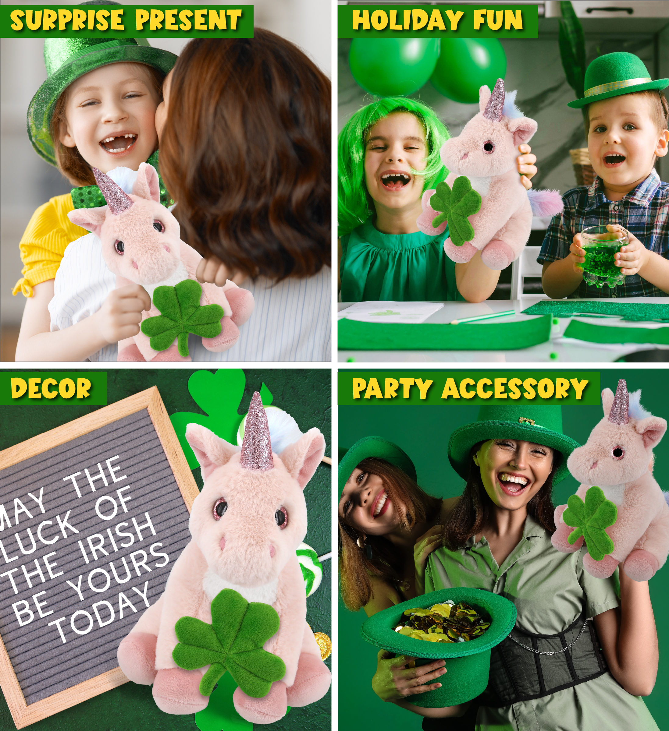 - THE SHAMROCK PLUSH UNICORN IS FOR EVERYONE WHO LOVES STUFFED ANIMALS – The soft plush stuffed animal pink unicorn toy with an Irish shamrock is for everyone looking for cute stuffed animals to celebrate St Patricks Day. Perfect for Saint Patricks Day decor or cool prizes on St Patricks Day Games. Let the good and fun times roll with this unicorn with a green plush shamrock; cute green St Patricks Day Gift to give this festive season.