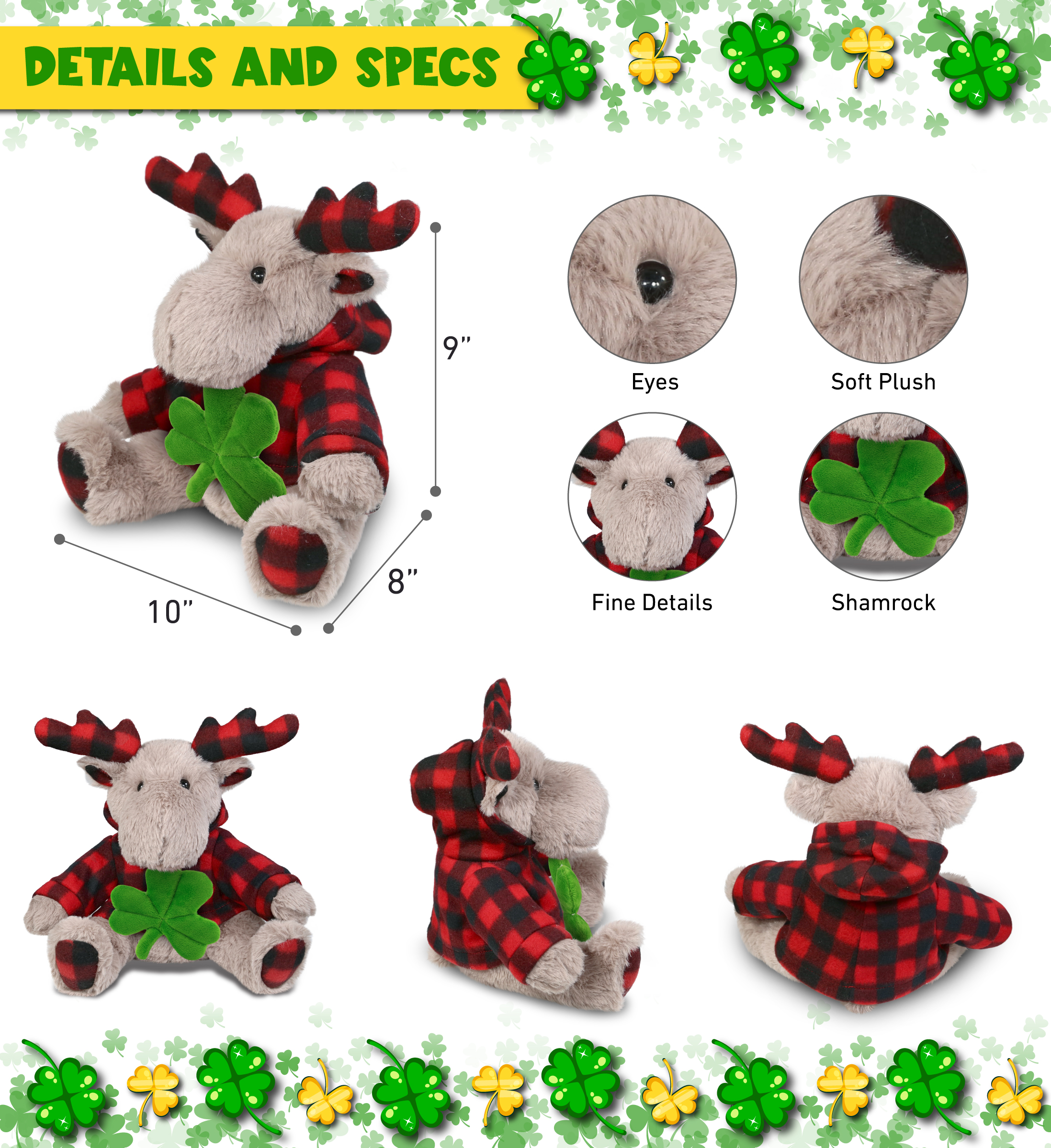 - THE SHAMROCK PLUSH MOOSE IS FOR EVERYONE WHO LOVES STUFFED ANIMALS – The Plaid Beige Moose with Red Plaid Hoodie toy with an Irish shamrock is for everyone looking for cute stuffed animals to celebrate St Patricks Day. Perfect for Saint Patricks Day decor or cool prizes on St Patricks Day Games. Let the good and fun times roll with this moose with a green plush shamrock; cute green St Patricks Day Gift to give this festive season.