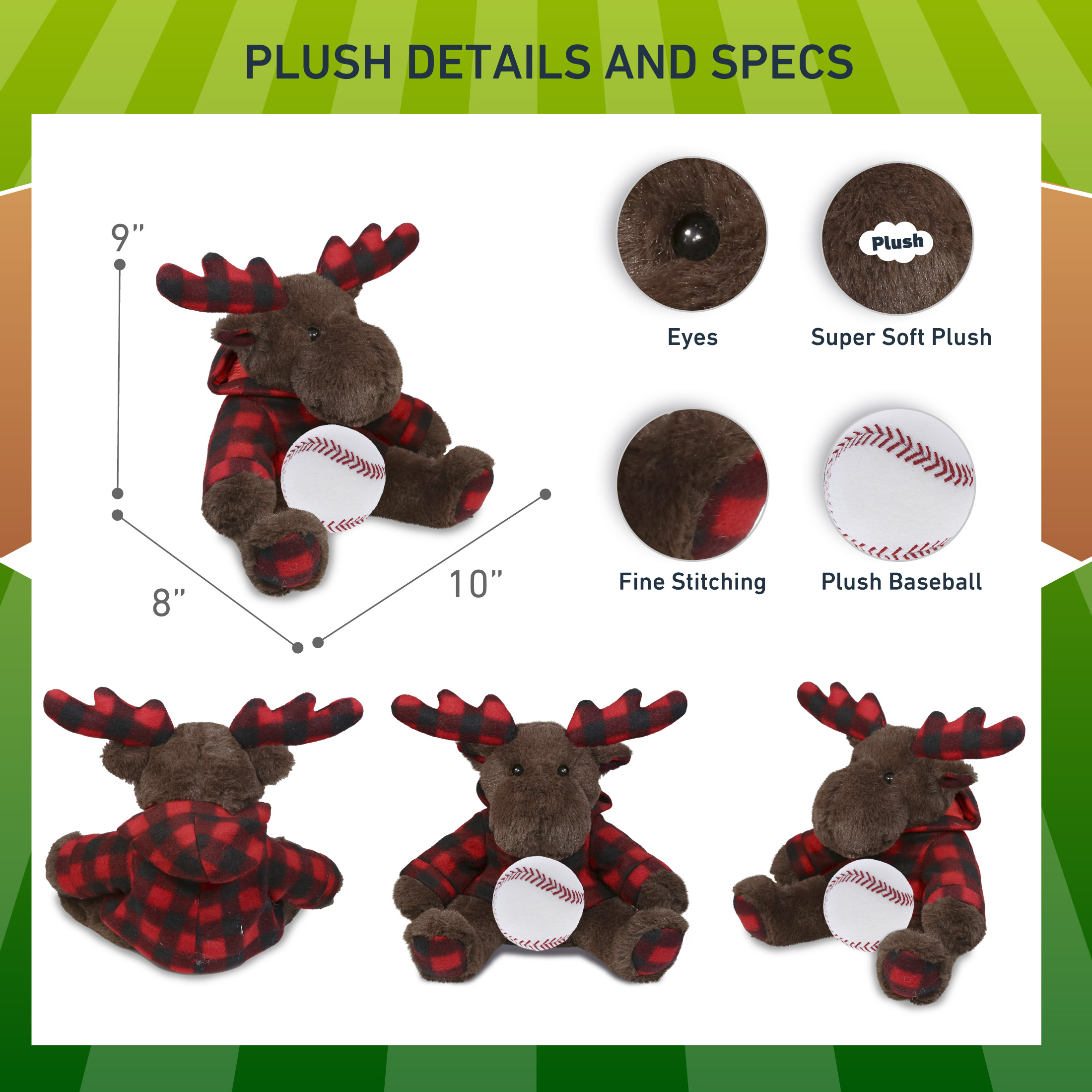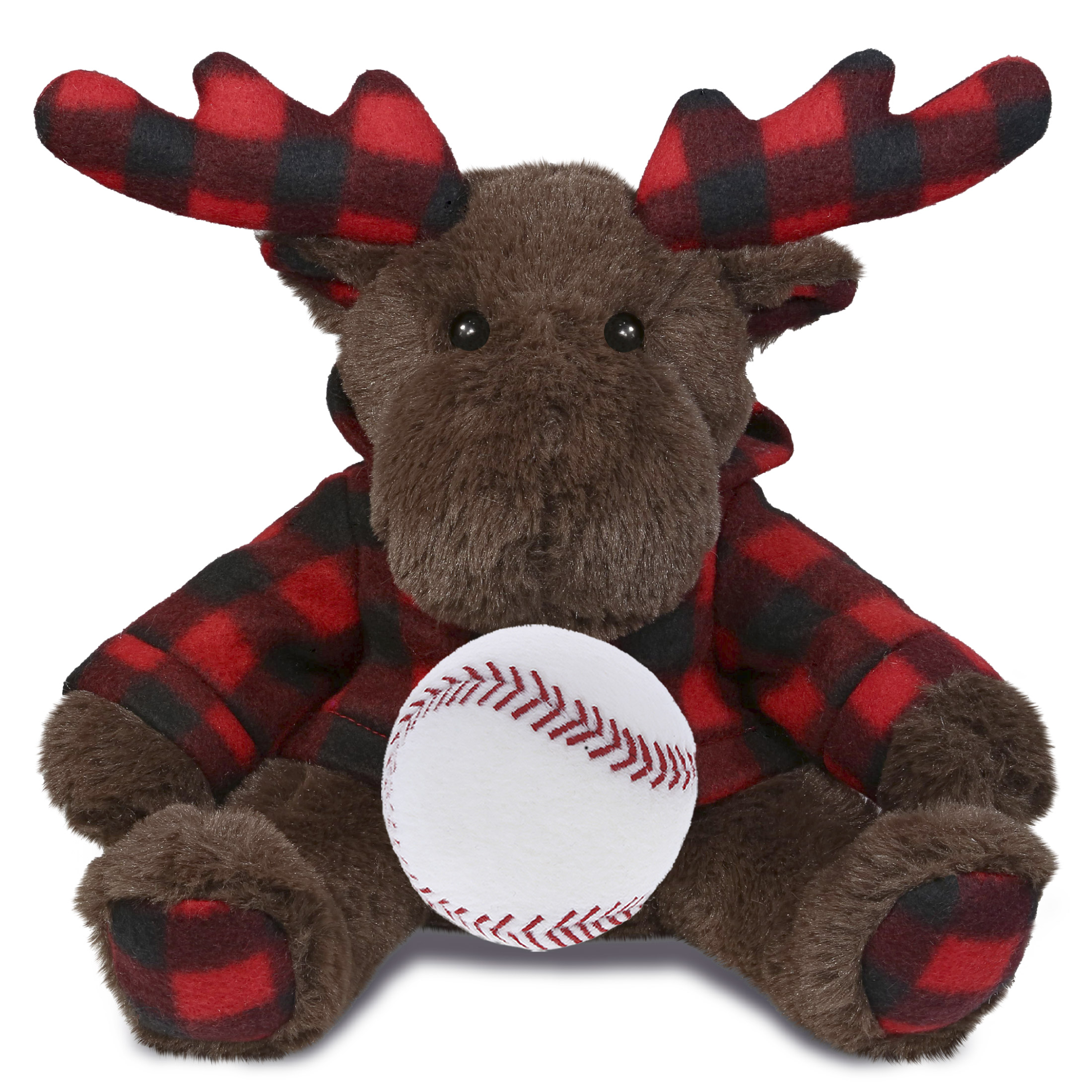 - Included with The Purchase of Brown Moose Plush with Baseball Ball – Includes 1 DolliBu Plaid Brown Moose with Hoodie Super Soft Stuffed Animal with baseball plush, decorated with realistic features. The baseball sports ball is attached to the moose’s body, making it perfect for cuddles. The plush toy features realistic details. The moose’s eyes make the critter so charming. The cute plush toy buddy measures 10Lx8Wx9H inches.