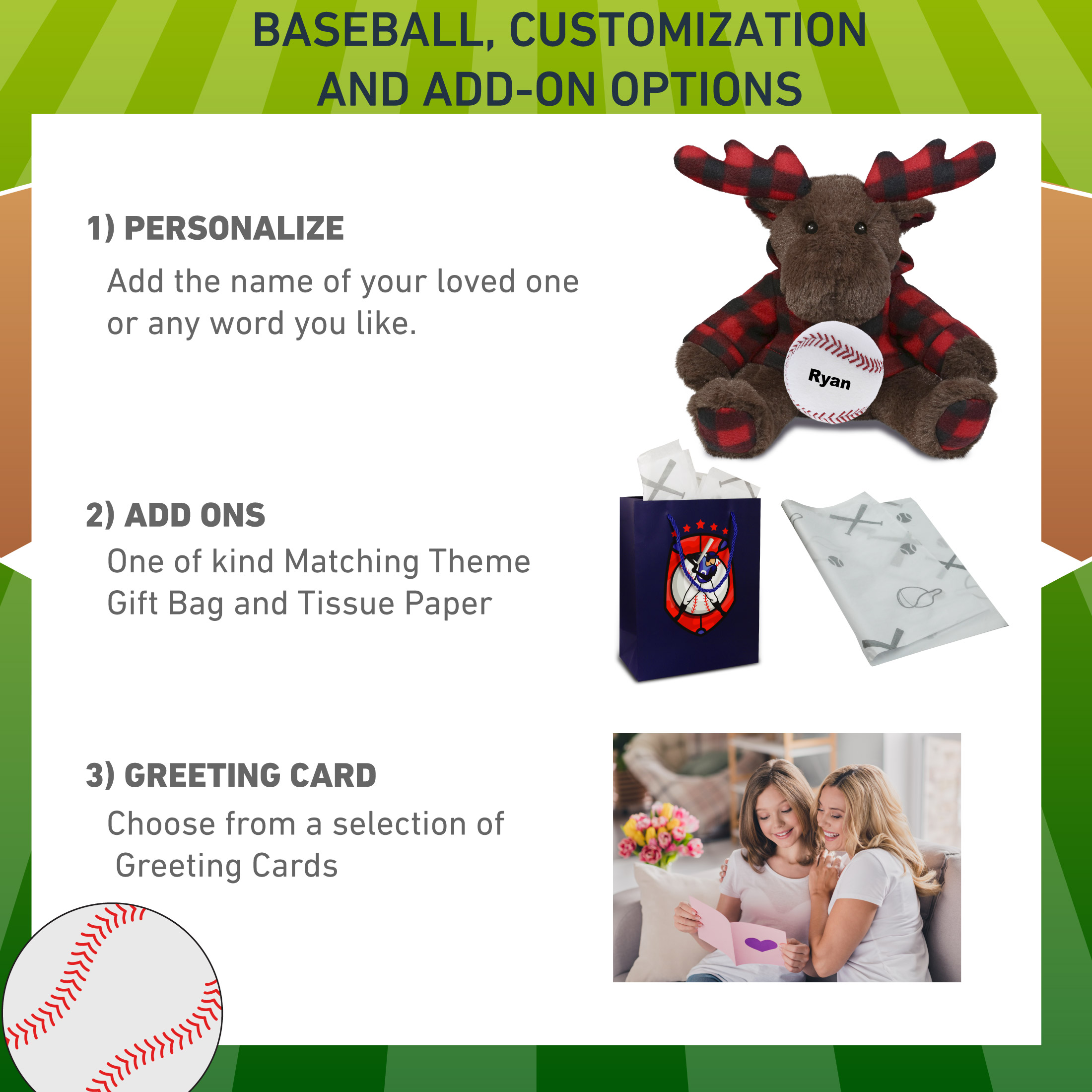 - Personalization, Customization, and Add-On Options – The Super Soft Sports Plaid Brown Moose with Hoodie comes customized with a small baseball plush. You can personalize your stuffed animal moose with the name of your loved one which we will imprint on the item. You also have the option to add some or all of the cool add-ons to make your gift extra special: 1) Gift Bag; 2) Tissue Paper; 3) Greeting Card.