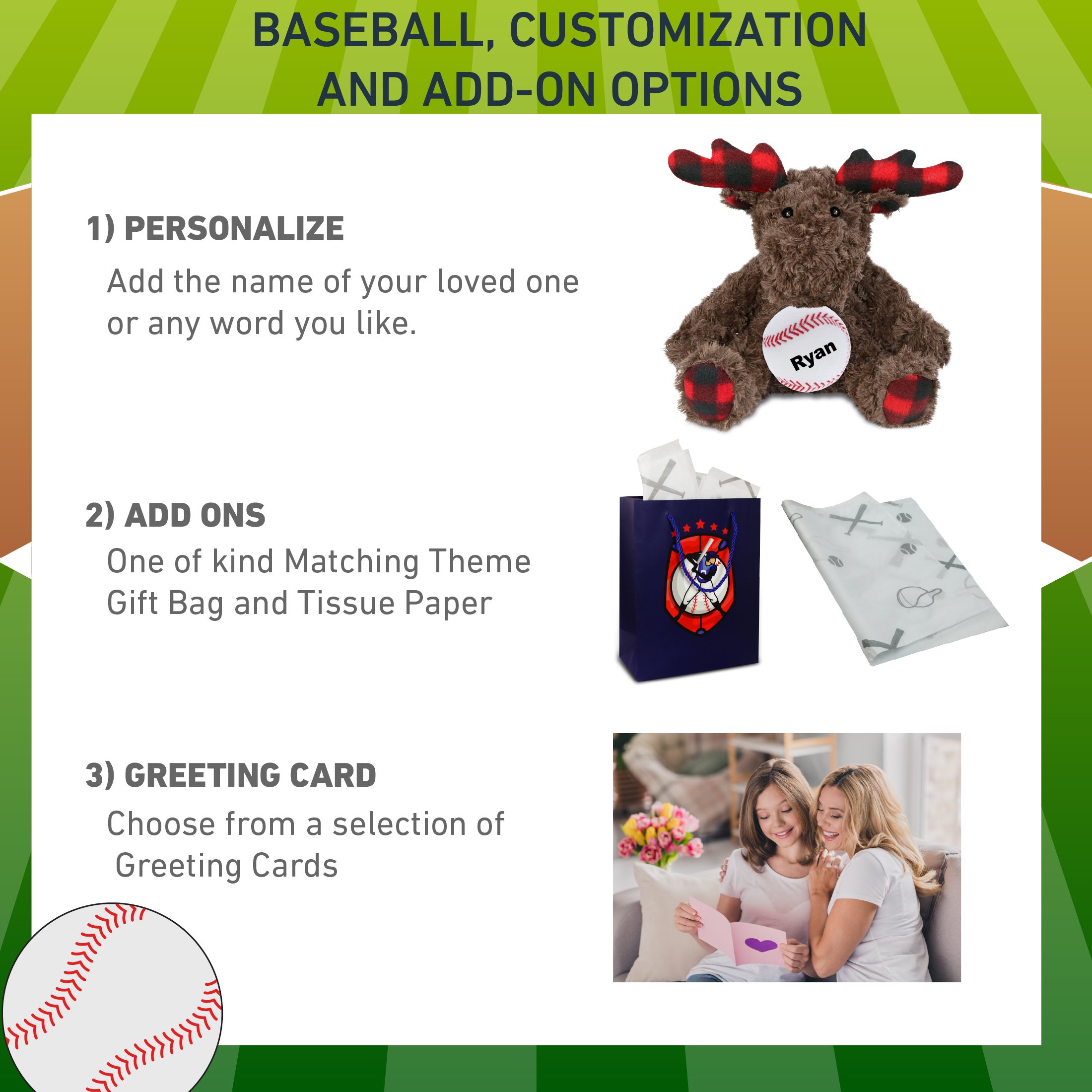 - Personalization, Customization, and Add-On Options – The Super Soft Sports Plaid Curly Moose comes customized with a small baseball plush. You can personalize your stuffed animal moose with the name of your loved one which we will imprint on the item. You also have the option to add some or all of the cool add-ons to make your gift extra special: 1) Gift Bag; 2) Tissue Paper; 3) Greeting Card.