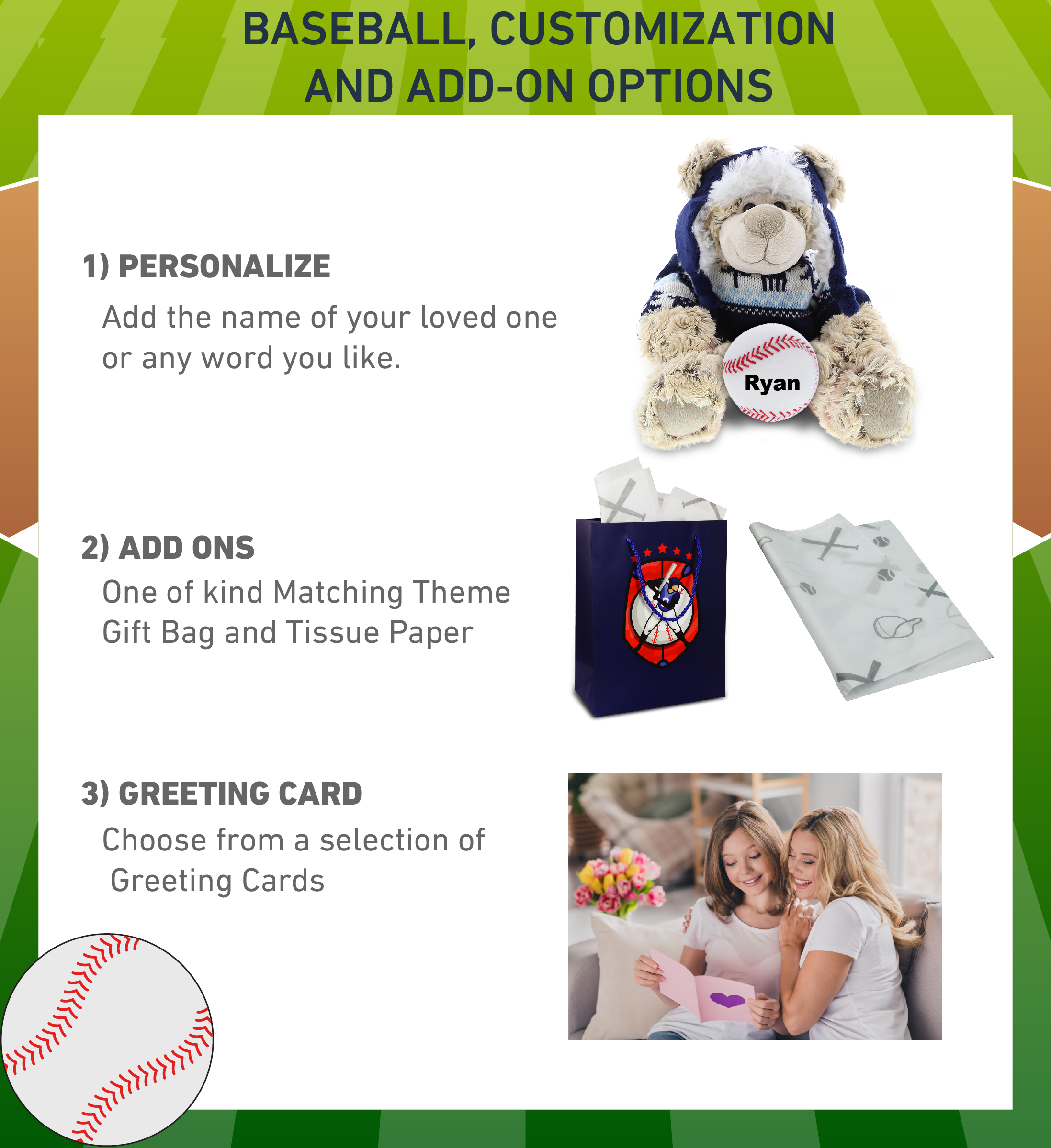 - Personalization, Customization, and Add-On Options – The Super Soft Sports Stuffed Animal Polar Bear with Clothes comes customized with a small baseball plush. You can personalize your stuffed animal polar bear with the name of your loved one which we will imprint on the item. You also have the option to add some or all of the cool add-ons to make your gift extra special: 1) Gift Bag; 2) Tissue Paper; 3) Greeting Card.