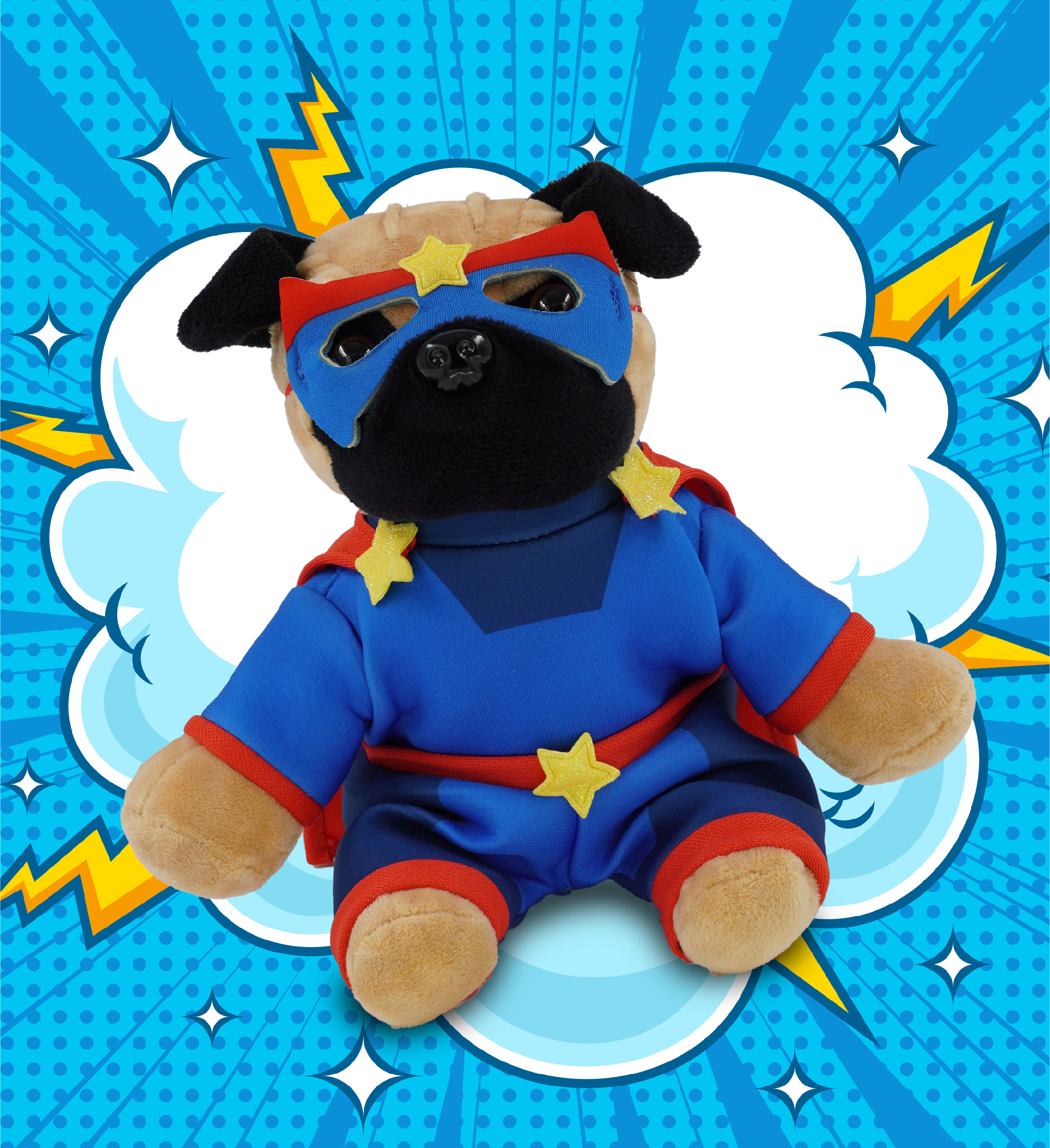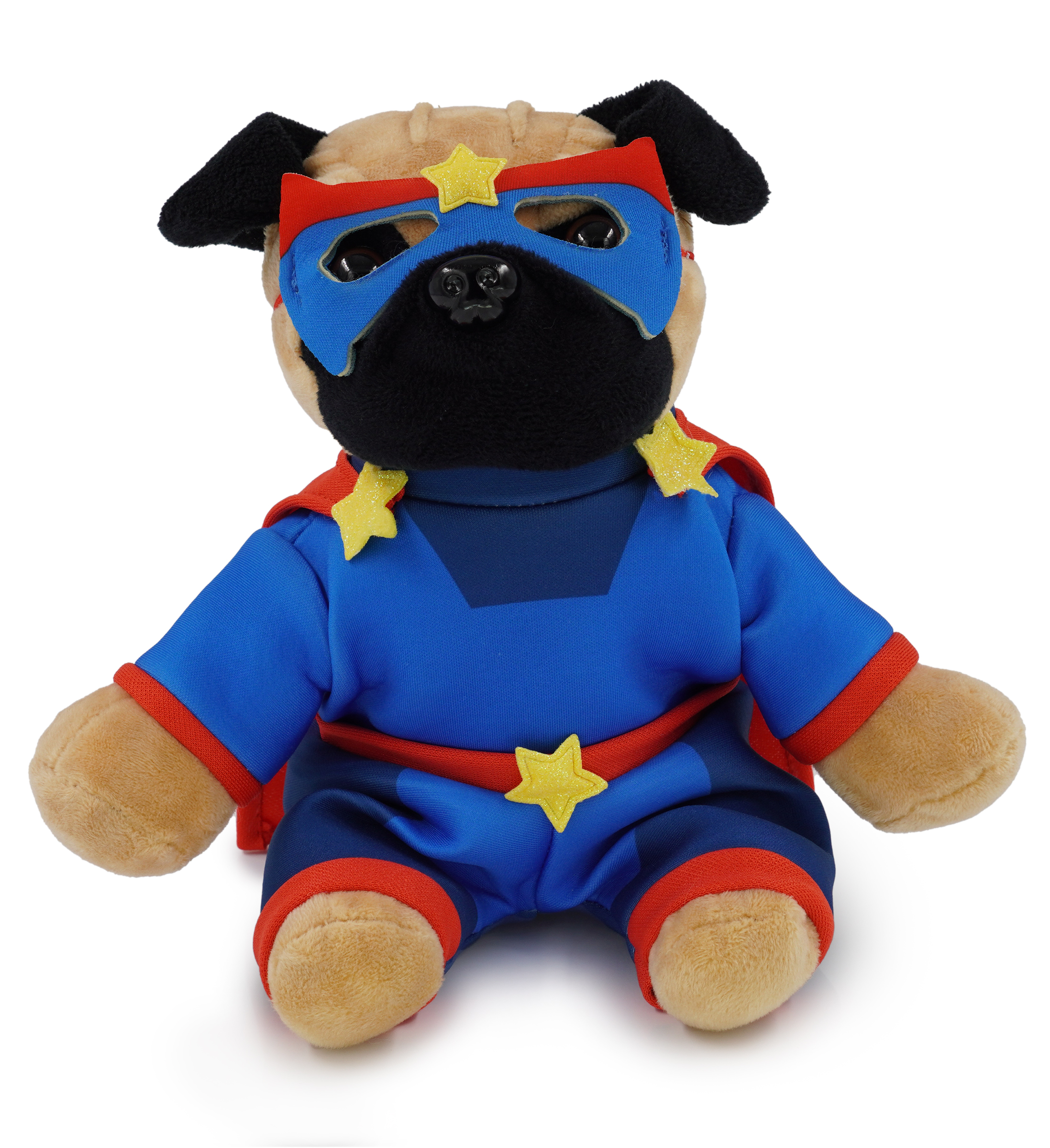 - Personalization, Customization, and Add-On Options – The pug dog stuffed animal comes dressed in a full superhero outfit, complete with eye mask, suit with cape, and star details. Make your super hero pug dog toy special by adding a personalized name, which we will imprint onto the plush. You can also customize your plush hero toy by adding any of our add-ons to create the perfect gift: 1) Gift Bag 2) Tissue Paper 3) Greeting Card.