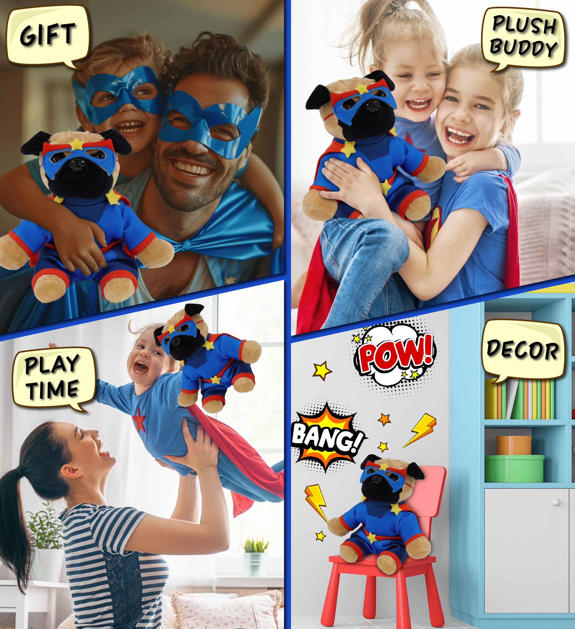 - Perfect for Everyone Who Loves Superheroes – Everyone who loves customizable stuffed animal toys will be thrilled to have a super hero stuffed pug dog. Whether it’s a cute stuffed animal gift or a superhero teddy for a super hero themed room, this plush makes a thoughtful surprise. Ideal for birthdays, Halloween, or everyday fun. Perfect to bring along on pretend-play save-the-day adventures.