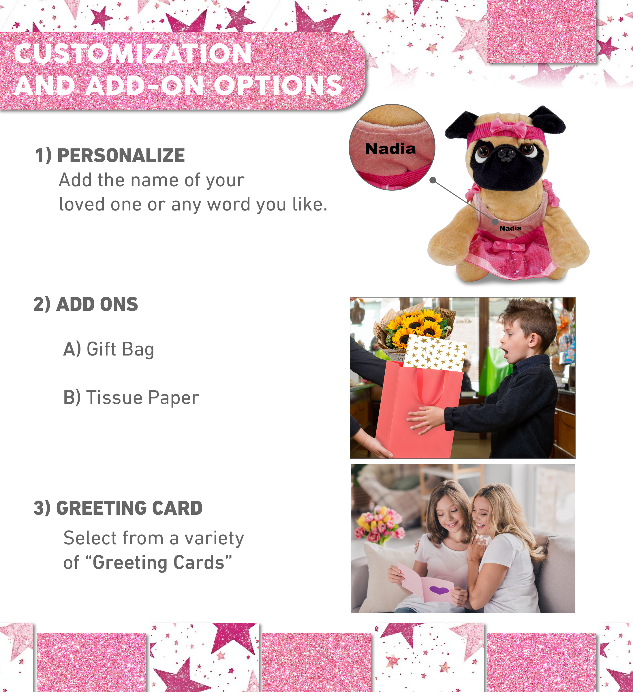• Personalization, Customization, and Add-On Options – The pug dog stuffed animal plush comes dressed in a pink ballerina outfit, complete with tutu skirt, headband, and shirt. Make it meaningful by personalizing it with the name, which we will imprint directly onto the plush. You can also customize your ballerina pug dog stuffed animal doll by adding any of our add-ons to create the perfect gift: 1) Gift Bag 2) Tissue Paper 3) Greeting Card.