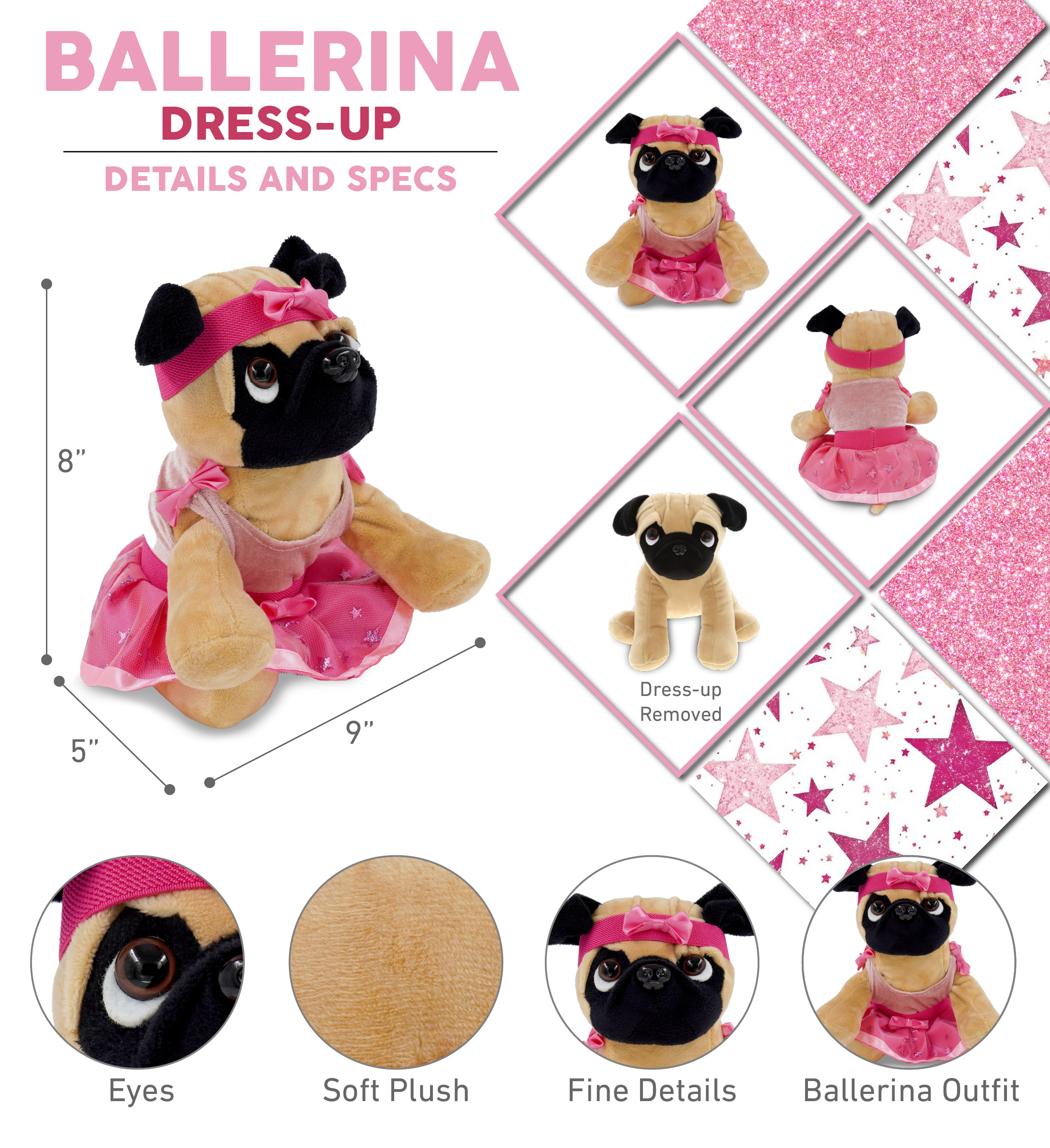 DolliBu Pug Dog Stuffed Animal with Ballerina Dress Up and Name Personalization – Dog Plush Toy in Ballet Costume with Tutu Skirt, Headband, and Shirt for Kids and Adults – 8 Inches
