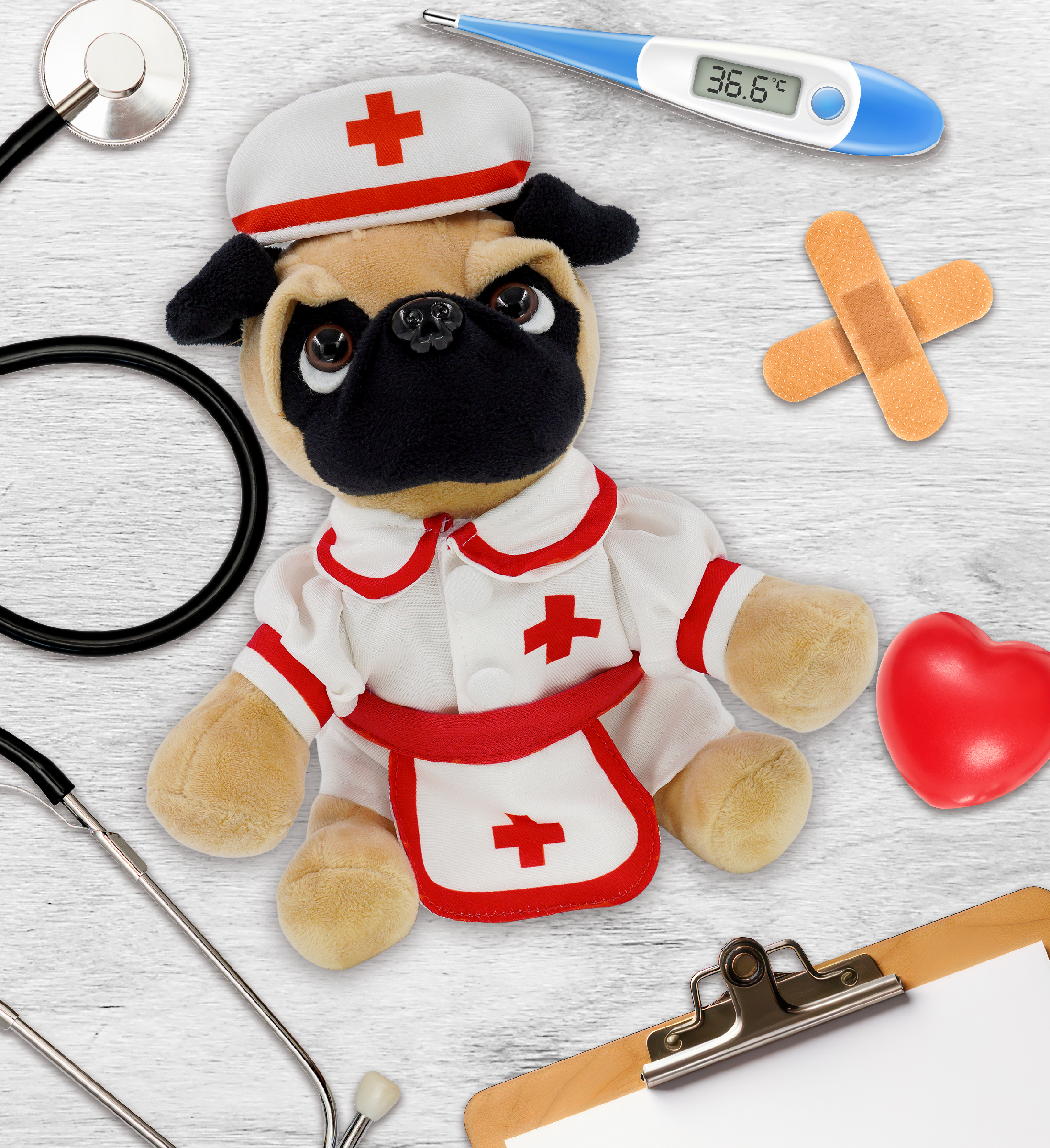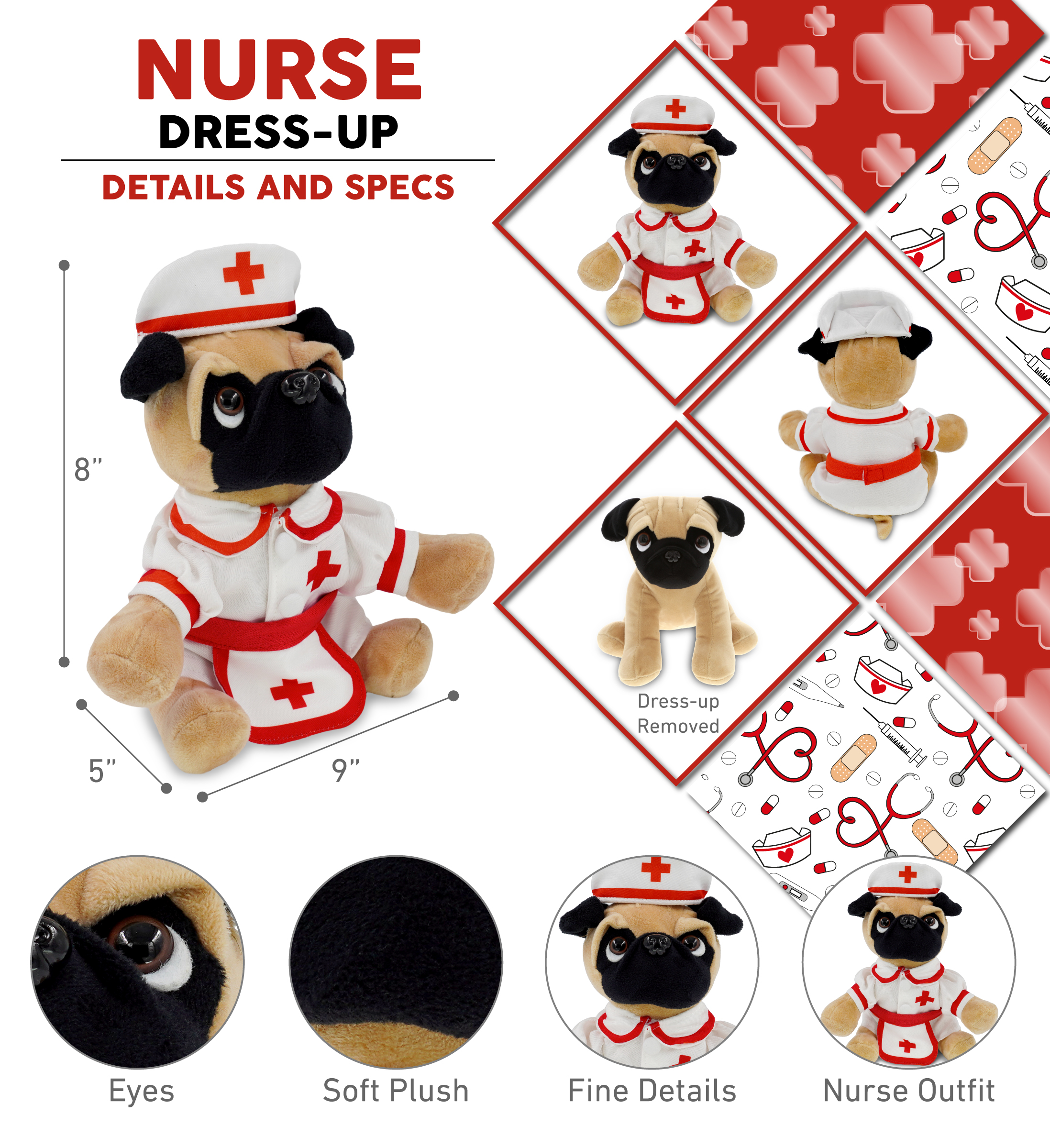 - Pug Dog with Nurse Stuffed Animal Clothes Features a Classic Nurse Outfit – Designed with red lining and a cross against the white nurse dress and the nurse cap and apron. The pug dog stuffed animal plush has soft plush, perfect for everyday snuggles. This stuffed animal with clothes makes the perfect addition to your collection of character teddy bear with clothes or giveaway hospital toys to give to sick children.