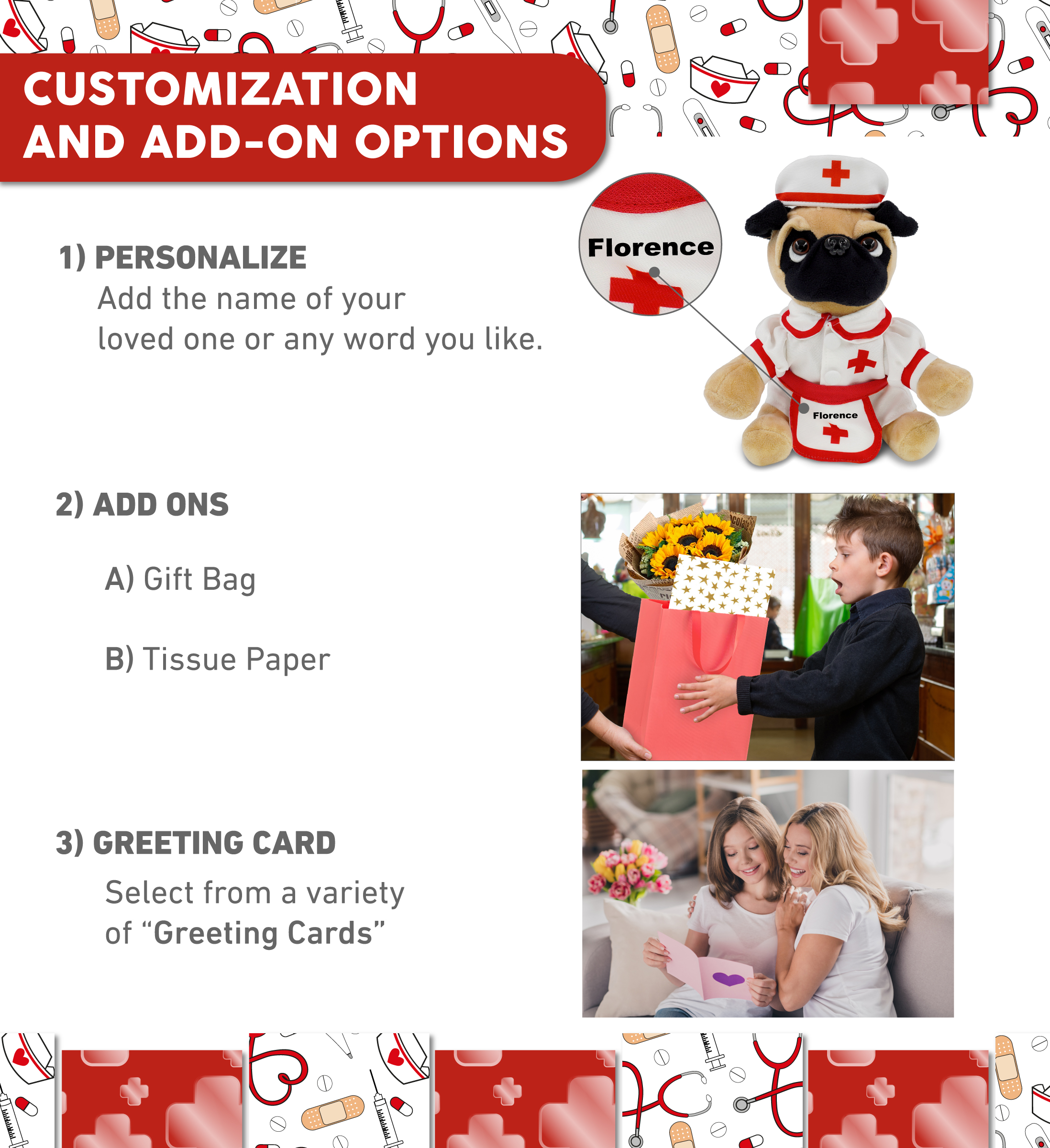 - Personalization, Customization, and Add-On Options – The stuffed pug dog comes dressed in a cute nurse costume, complete with nurse cap, nurse dress, and apron. Make your nurse teddy bear stuffed animal plush special by adding a personalized name, which we’ll imprint onto the plush. You can also customize your nurse pug dog plush by adding any of our add-ons to create the perfect gift: 1) Gift Bag 2) Tissue Paper 3) Greeting Card.