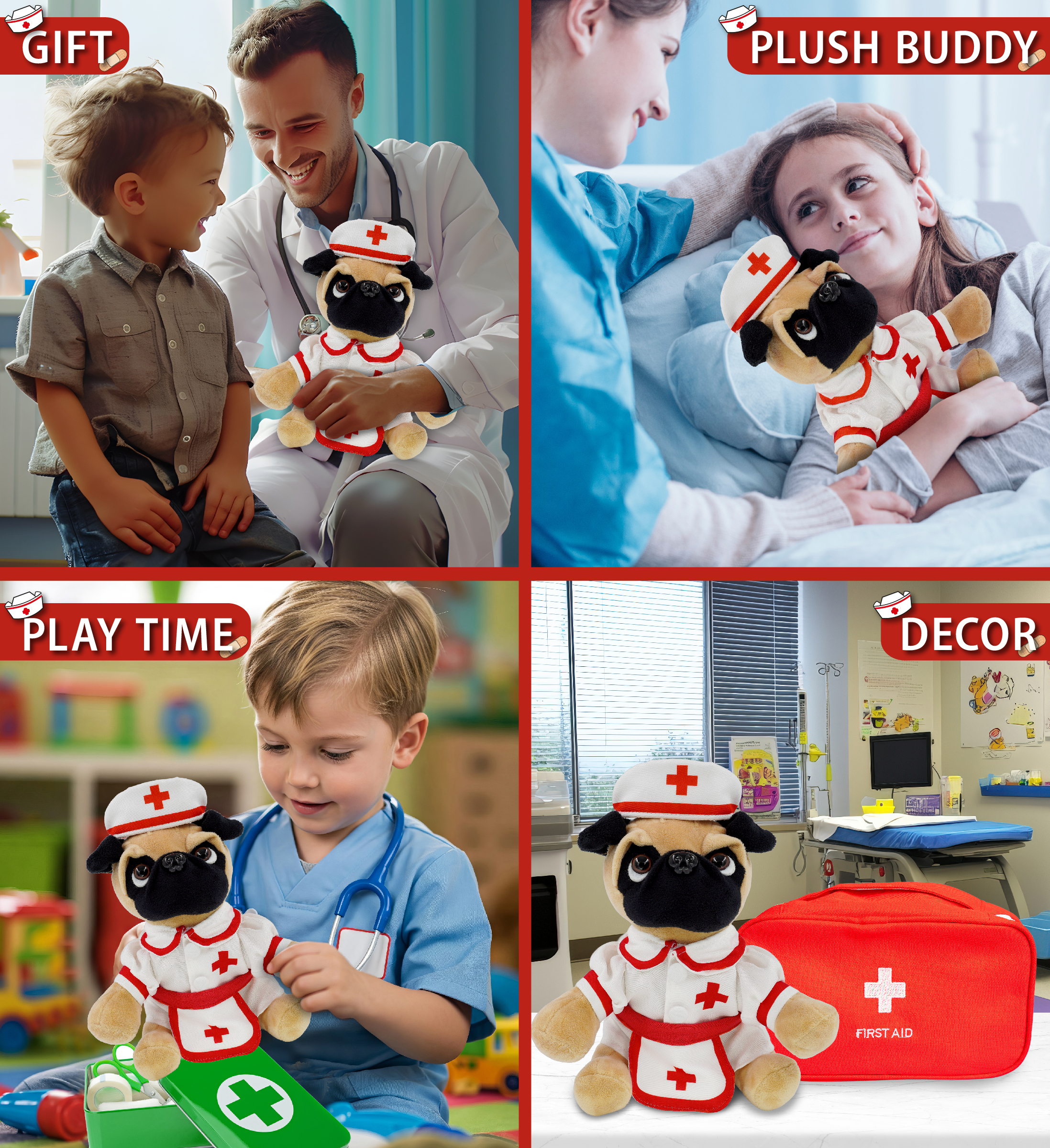 - Perfect Pet Animal Stuffed Toy Nurse Plush for Those Who Appreciate Health Care Workers – If you’re looking for a gift for nurse graduate, a get well teddy bear for your sick friend. The stuffed nurse pug dog brings a comforting and playful vibe to any occasion. Ideal hospital gifts for children to make them feel safe or as medical toys for kids to inspire them at a young age. The perfect stuffed animal pug for nurses and for cool storytelling.