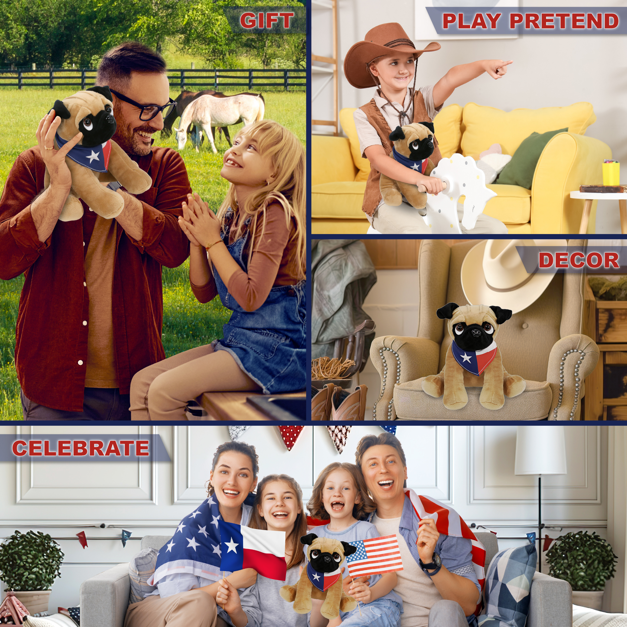 - Perfect Pet Animal Pug Dog Plush Toy for Those Who Love Texas – Looking for Texas souvenirs, bear plush toys, or western gifts? This pug dog with a red, blue, and white Texas flag bandana is a fun choice. Ideal for gifting to cowboy fans, decor for Texas holidays or Memorial Day, or adding to a cowboy teddy bear collection. Great for collectors of cowboy stuff and stuffed animal clothing to show their Texan pride.