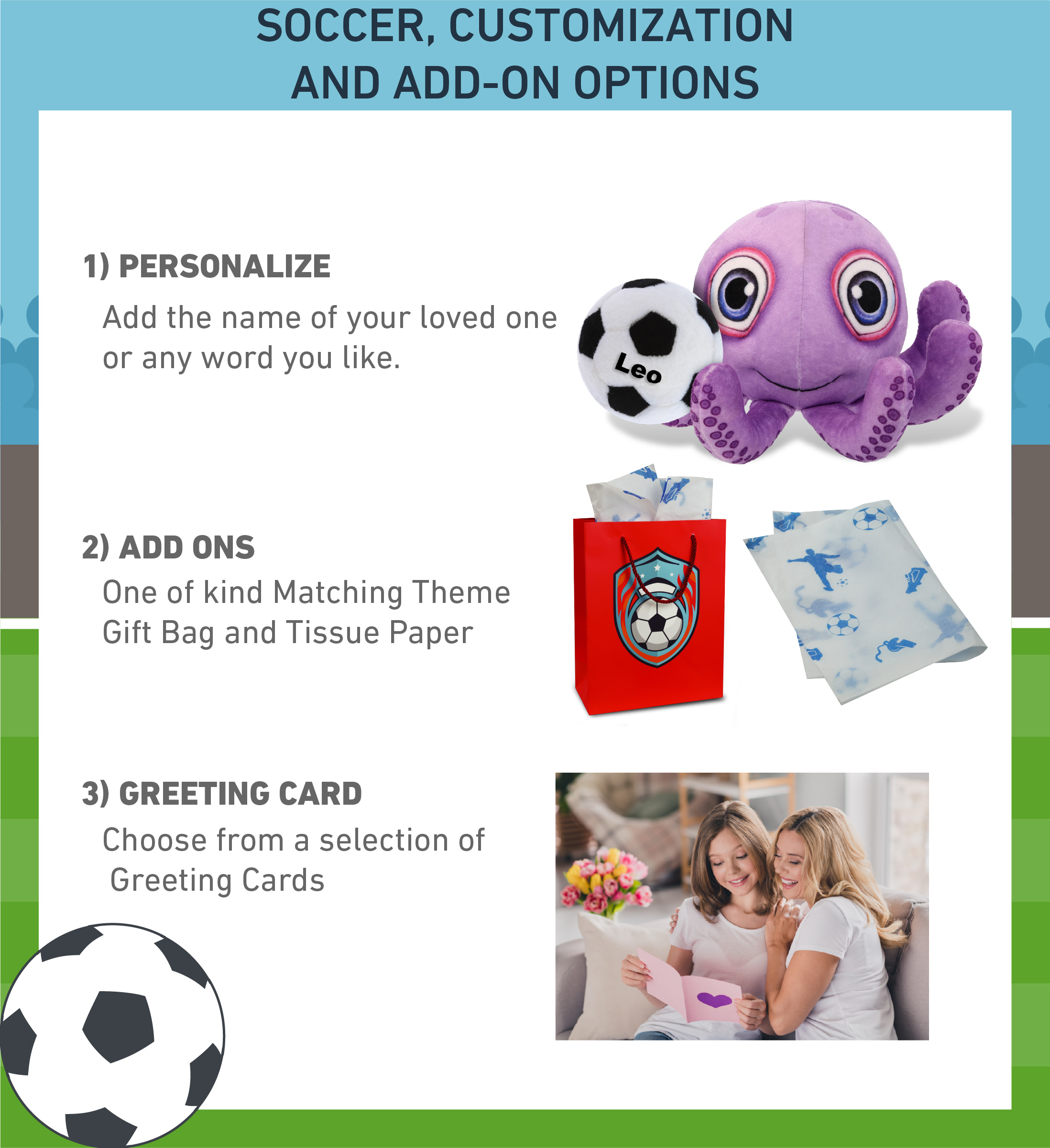 - Personalization, Customization, and Add-On Options – Plush Buddies Purple Octopus sports stuffed animal comes customized with a Soccer Ball Plush. You can personalize your octopus plush with the name of your loved one imprinted on the item. You also have the option to add some or all of the cool add-ons to make your gift extra special: 1) Gift Bag; 2) Tissue Paper; 3) Greeting Card.