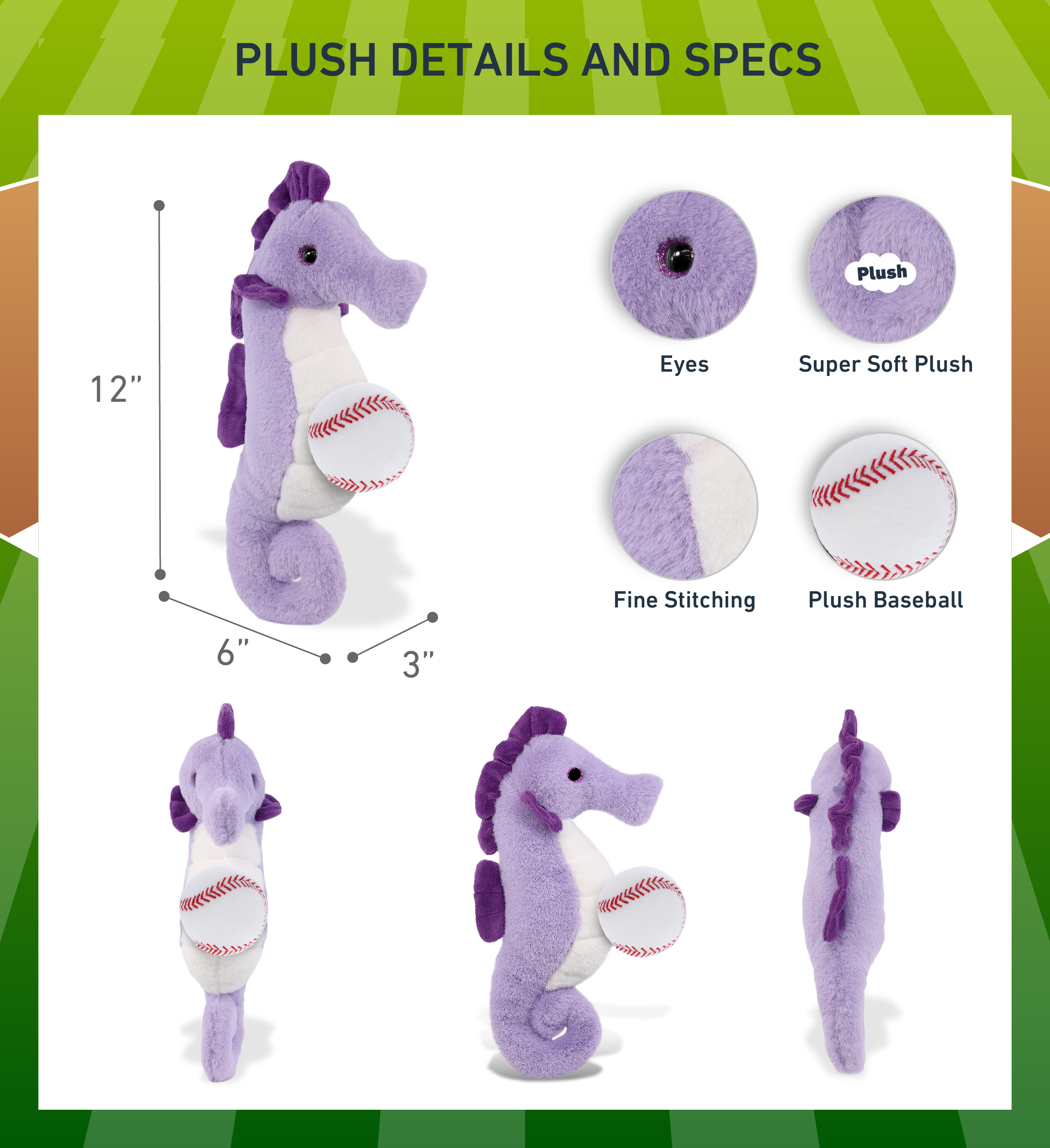 - Included with The Purchase of Purple Seahorse Plush with Baseball Ball – Includes 1 DolliBu Purple Seahorse Super Soft Stuffed Animal with a baseball plush, decorated with realistic features of a seahorse. The baseball sports ball is attached to the seahorse’s body, making it perfect for cuddles. The seahorse plush toy features realistic details. The seahorse’s eyes make the critter so charming. The cute plush toy buddy measures 6Lx3Wx12H inches.