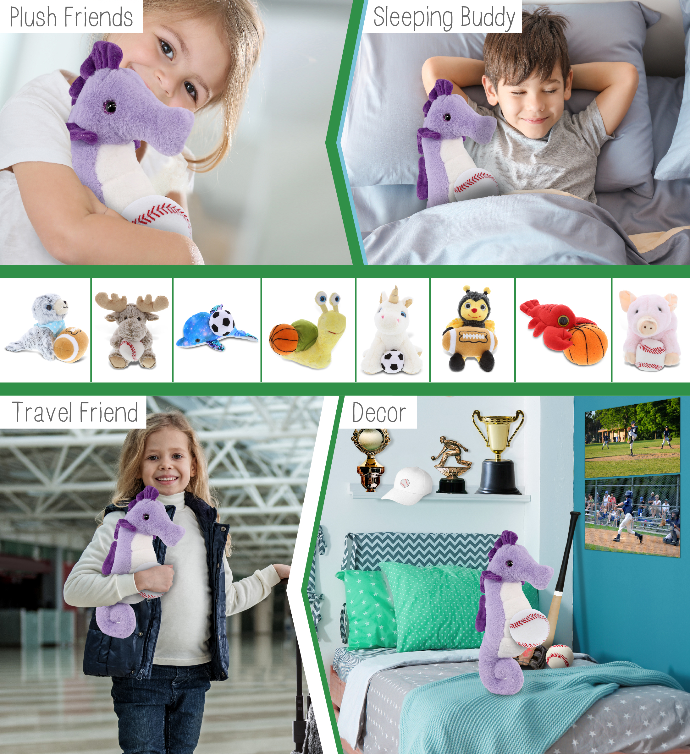 - Ideal Use for the Kids Baseball Plush and Stuffed Seahorse – The seahorse baseball stuffed animal makes a great addition to your kids baseball stuff for boys collection. Great gifts for boys who love sports and plush dolls. If you’re looking for the perfect baseball gift ideas for kids, then this stuffed seahorse with baseball plush is the perfect choice. It’s the perfect stuffed animal baseball birthday gifts to give on any special occasion.