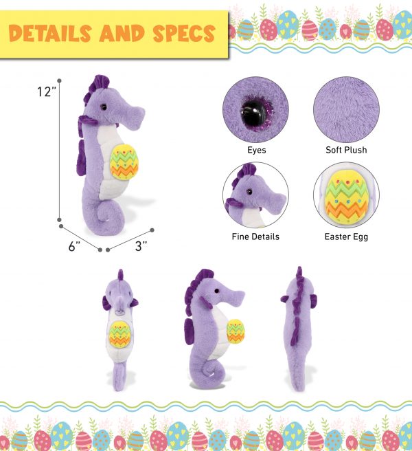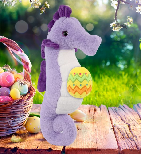- HIGH-QUALITY EASTER PLUSH FOR GIRLS AND BOYS – Super Soft Seahorse is a stuffed animal Easter plush made of premium 100% polyester. The seahorse is covered with purple plush, the Easter egg is yellow featuring zig zags and dots in spring color. Cute stuffed animals for girls and boys crafted with durable materials designed to deliver a Welcome Spring and Easter message. To maintain the seahorse plush, wash with cold water and allow to air dry.