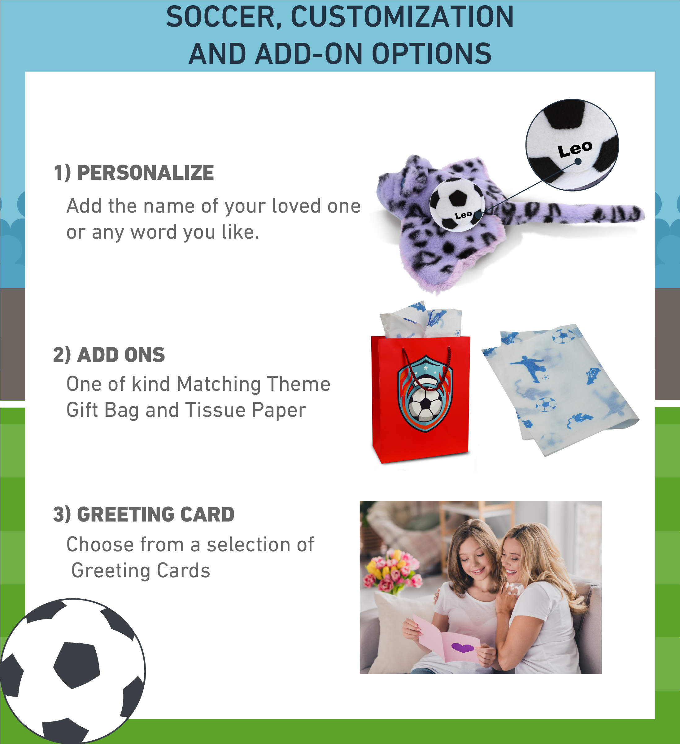 - Personalization, Customization, and Add-On Options – Super Soft Purple Stingray sports stuffed animal comes customized with a Soccer Ball Plush. You can personalize your stingray plush with the name of your loved one imprinted on the item. You also have the option to add some or all of the cool add-ons to make your gift extra special: 1) Gift Bag; 2) Tissue Paper; 3) Greeting Card.