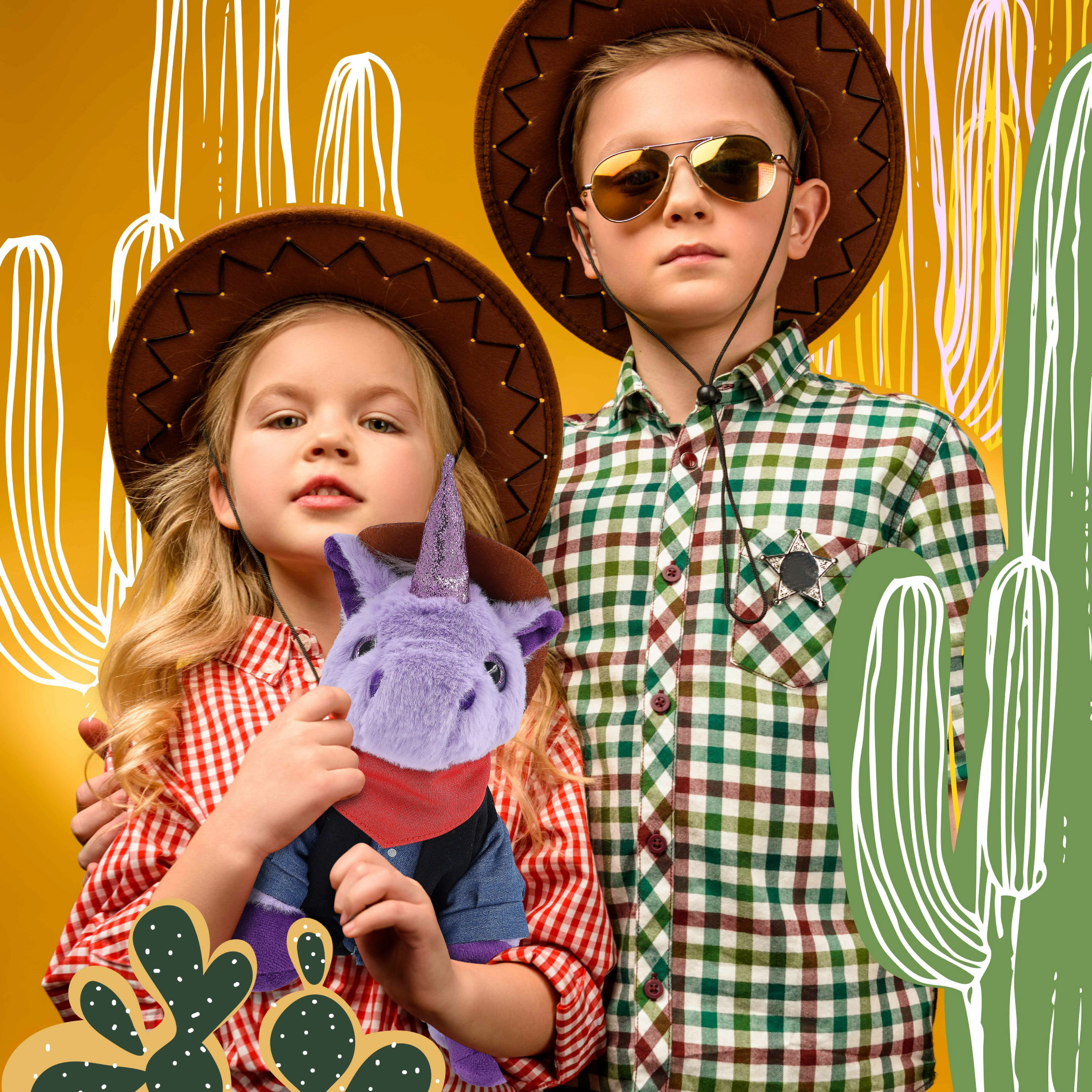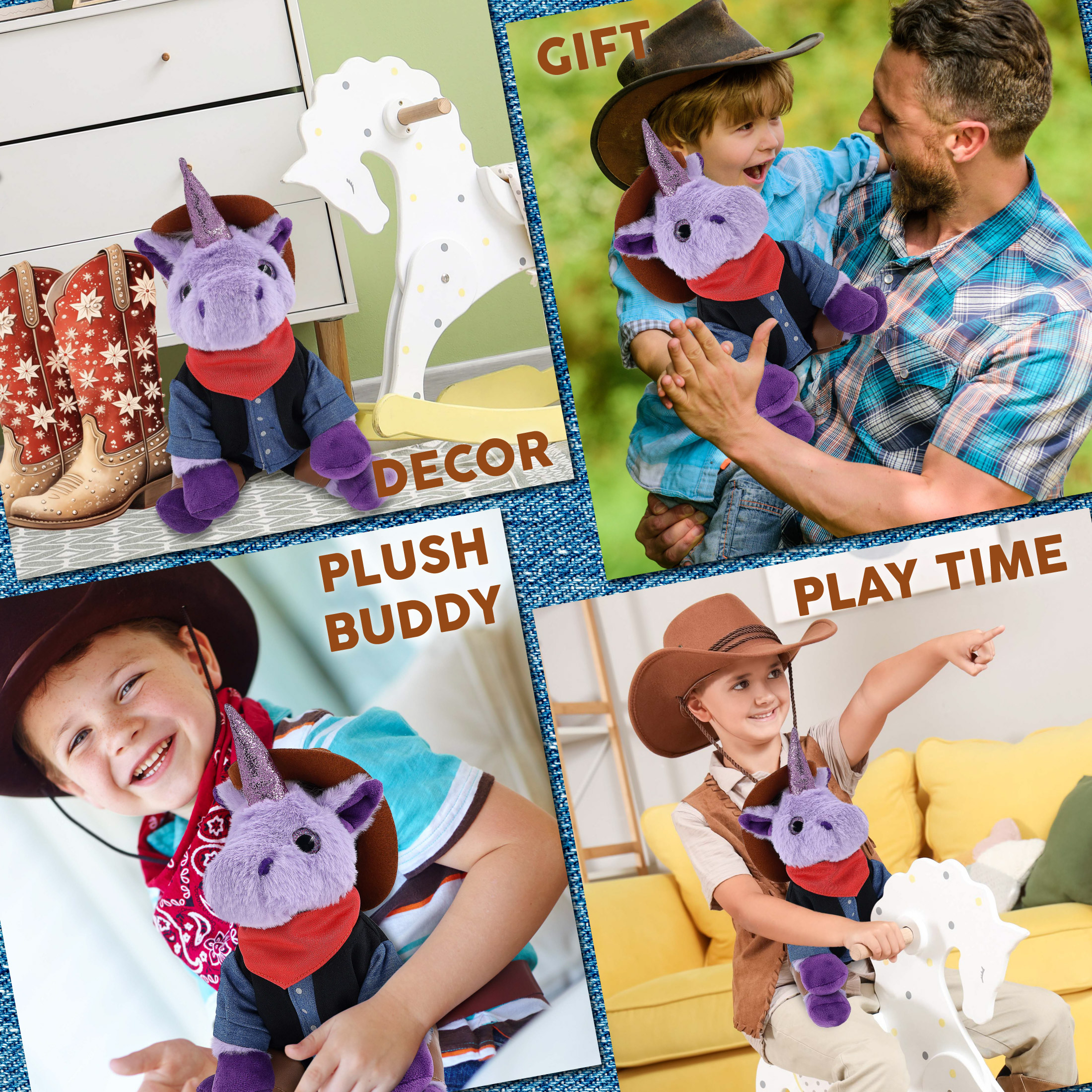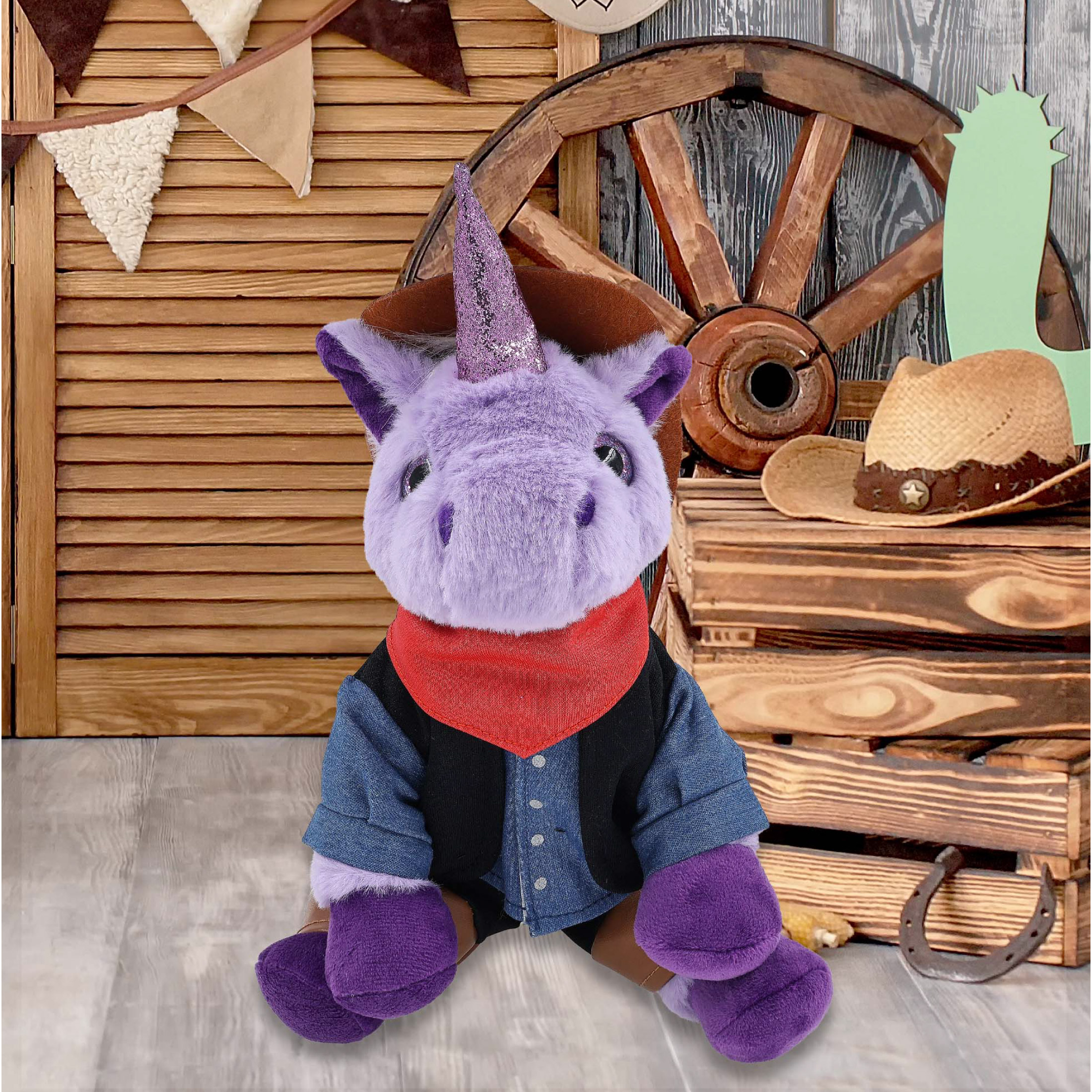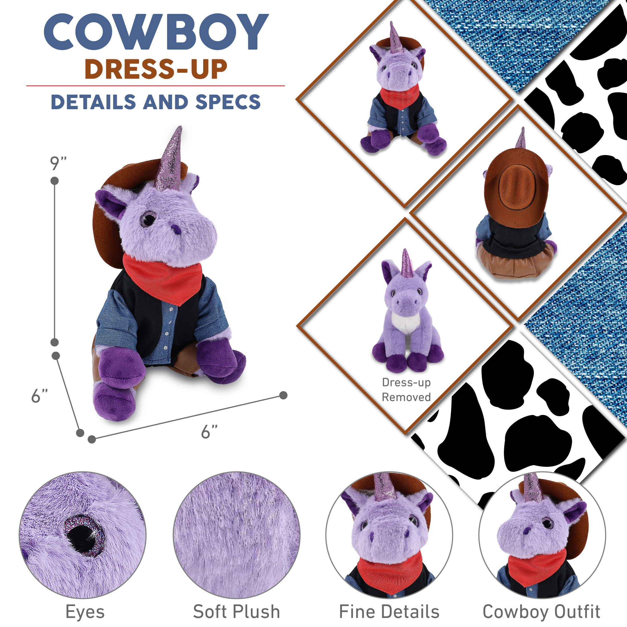 - Includes 1 DolliBu Purple Unicorn Toy with Cowboy Dress Up Set – The unicorn plush arrives with cowboy plush clothes. The cute stuffed toy features a cowboy costume hat, vest costume shirt, red handkerchief and brown chaps. Whether you collect adorable stuffed animals or gifts for cowboys with cowboy stuffed animal clothes and accessories, this plush toy is the perfect cowboy gift. It measures 6Lx6Wx9H inches. Best for kids ages 3 and up.