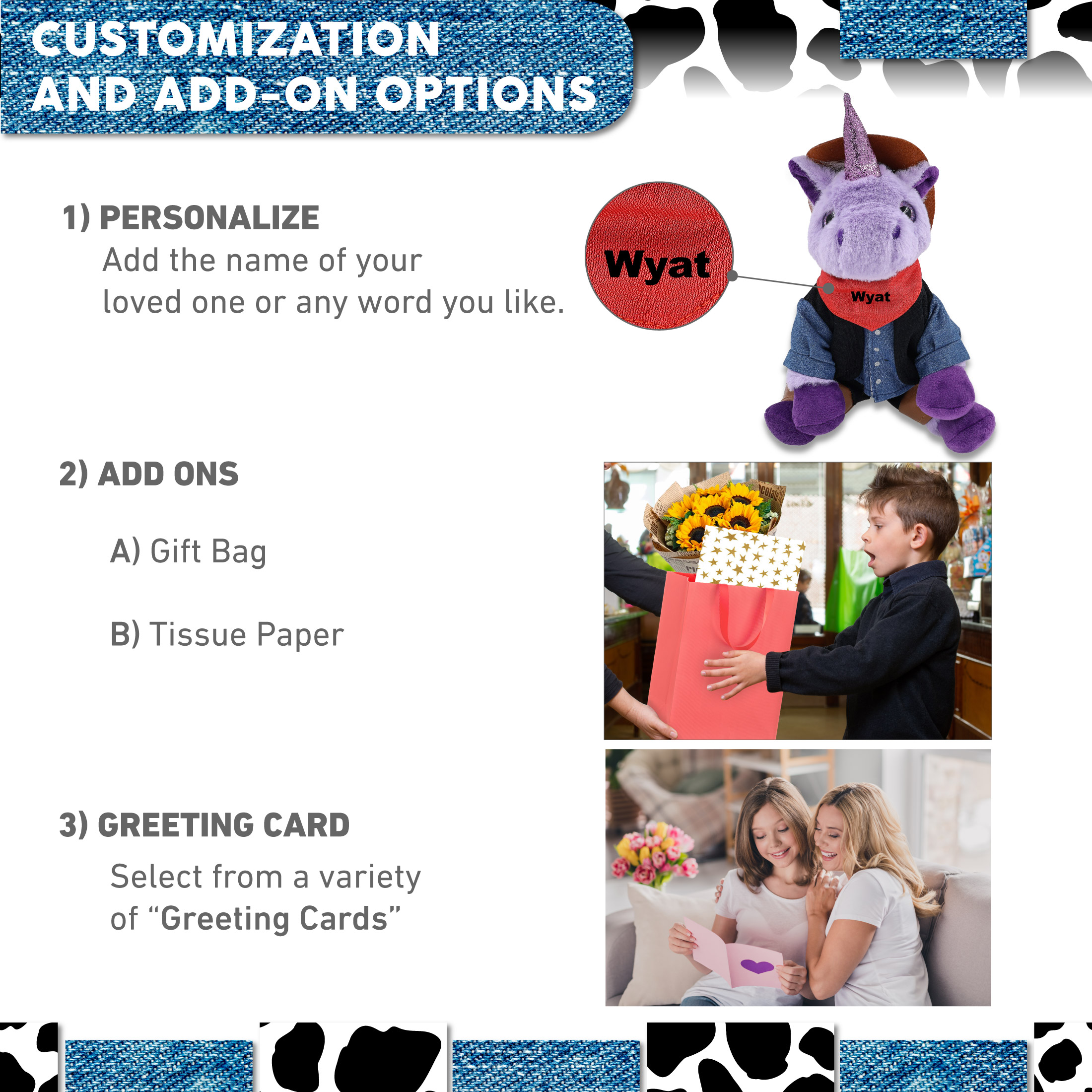 - Personalization, Customization and Add-On Options – The unicorn stuffed animal plush comes dressed in a cowboy outfit, complete with cowboy vest shirt, pants, bandana, and cowboy hat. Make it cool by personalizing it with the name, which we will imprint directly onto the stuffy plush. You can also customize your cowboy plush unicorn by adding any of our add-ons to create the perfect gift: 1) Gift Bag 2) Tissue Paper 3) Greeting Card.