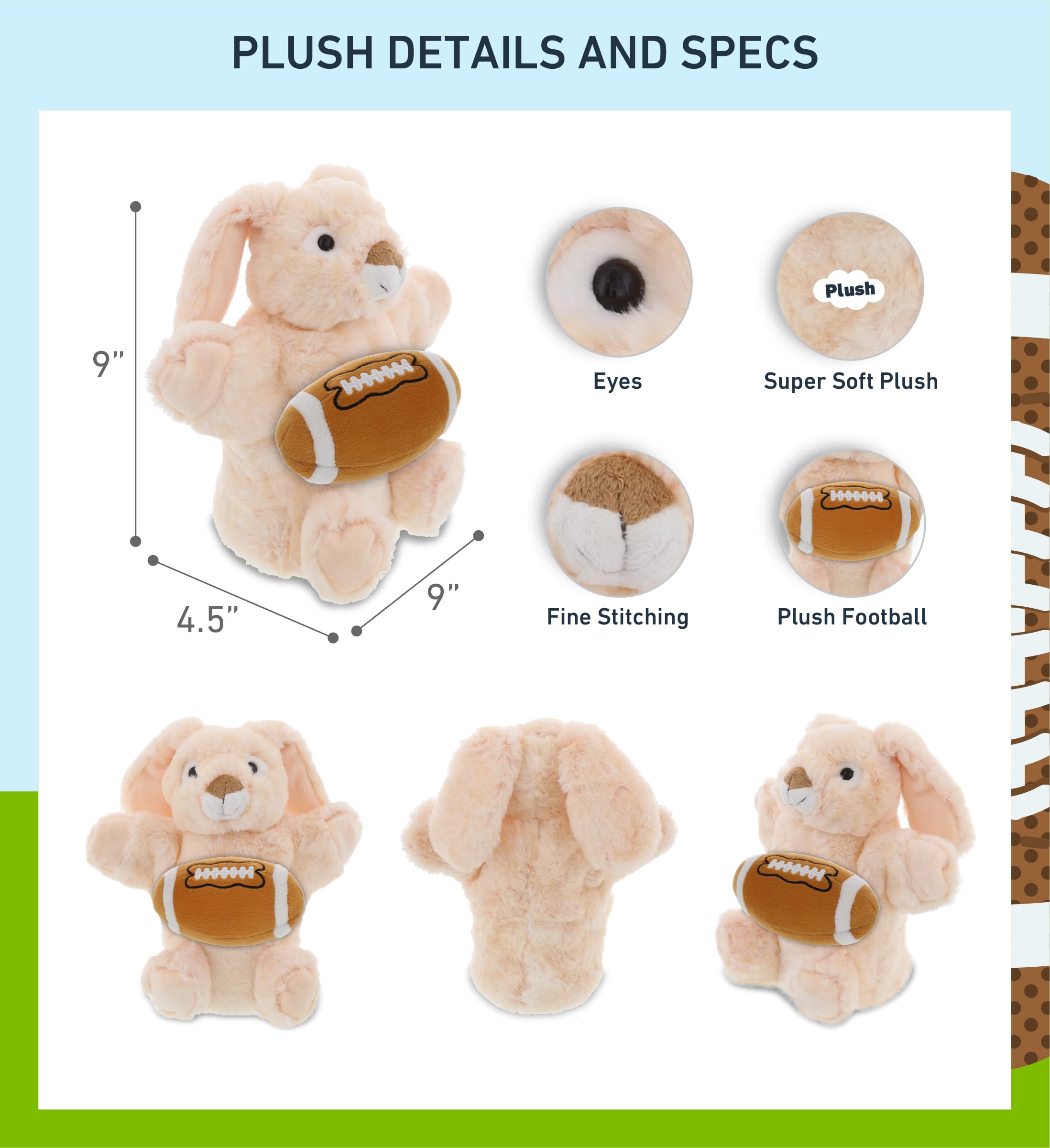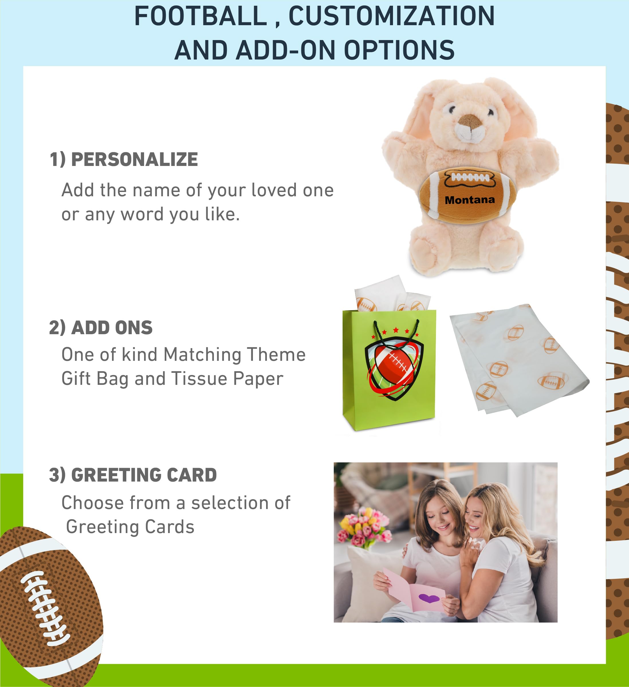 - Personalization, Customization, and Add-On Options – This Super Soft Sports Stuffed Animal Rabbit Hand Puppet Plush comes customized with a football plush. You can personalize it with the name of your loved one imprinted on the item. You also have the option to add some or all of the cool add-ons to make your gift extra special: 1) Gift Bag; 2) Tissue Paper; 3) Greeting Card.