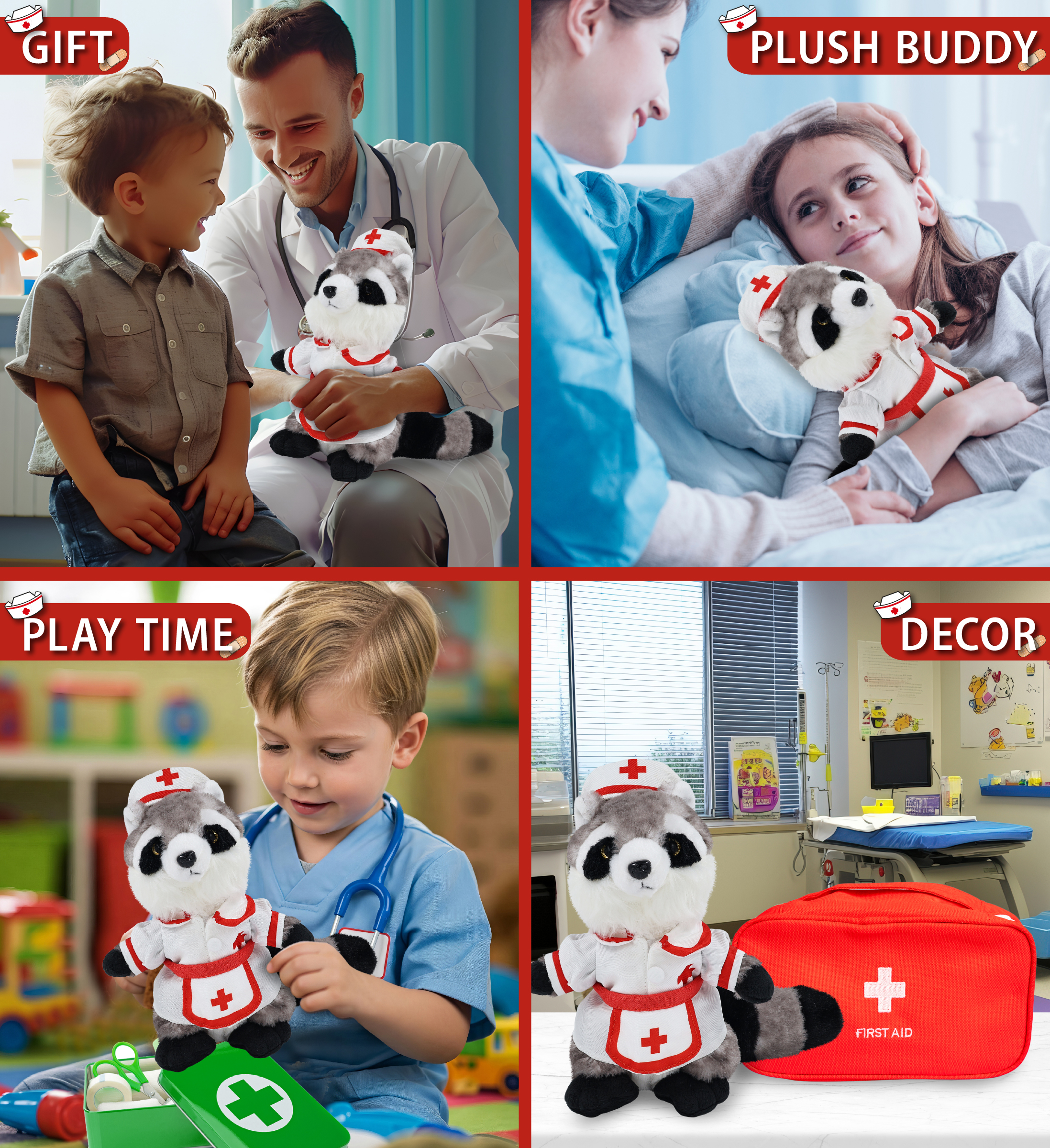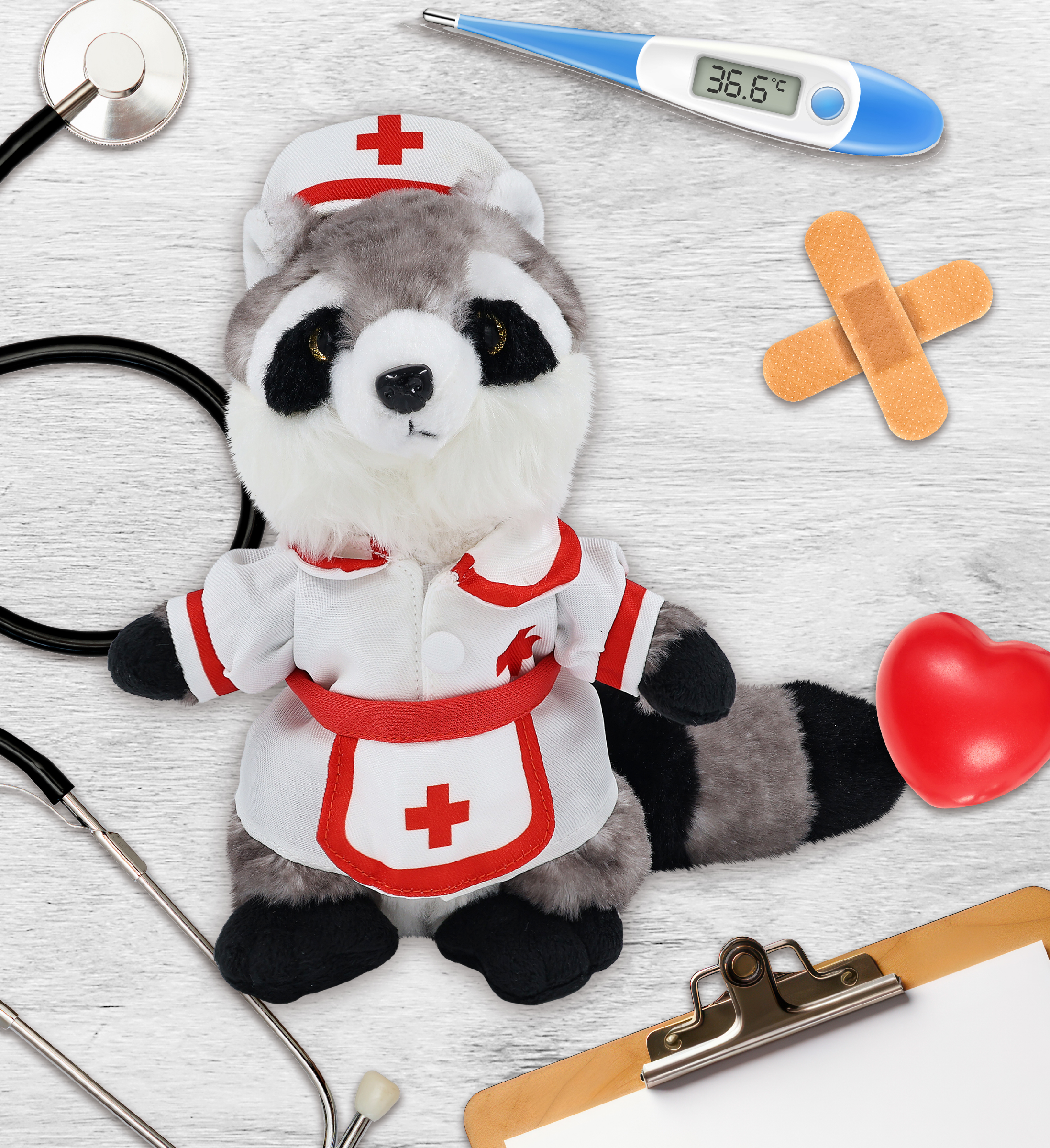 - Plush Raccoon with Nurse Stuffed Animal Clothes Features a Classic Nurse Outfit – Designed with red lining and cross against the white nurse dress and the nurse cap and apron. The nurse raccoon plush has soft and fluffy plush, perfect for everyday snuggles. This plush raccoon stuffed animal with clothes makes the perfect addition to your collection of character teddy bear with clothes, and cool medical-themed stuffed toys.