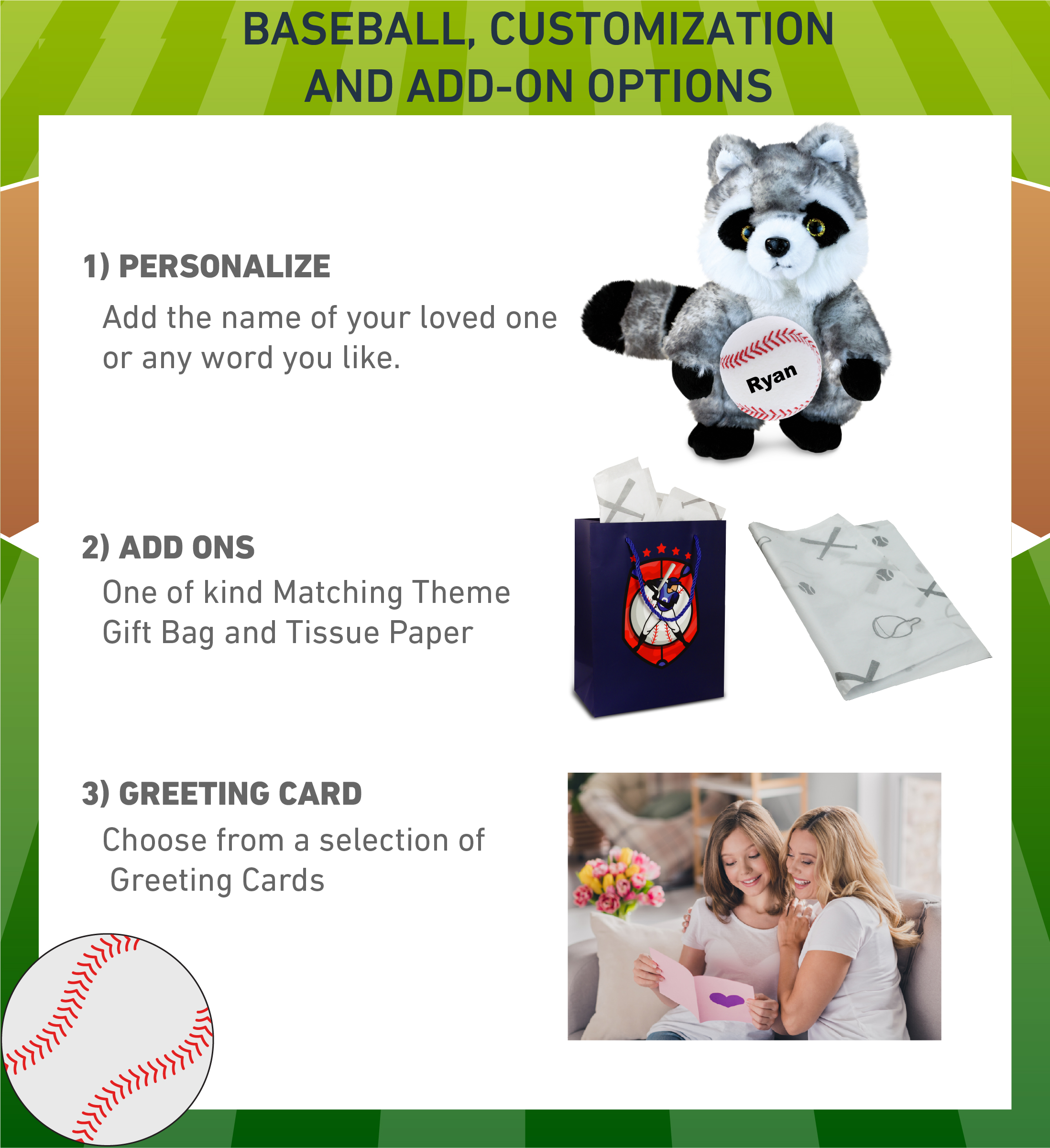 - Personalization, Customization, and Add-On Options – The Super Soft Sports Stuffed Animal Raccoon comes customized with a small baseball plush. You can personalize your stuffed animal raccoon with the name of your loved one which we will imprint on the item. You also have the option to add some or all of the cool add-ons to make your gift extra special: 1) Gift Bag; 2) Tissue Paper; 3) Greeting Card.