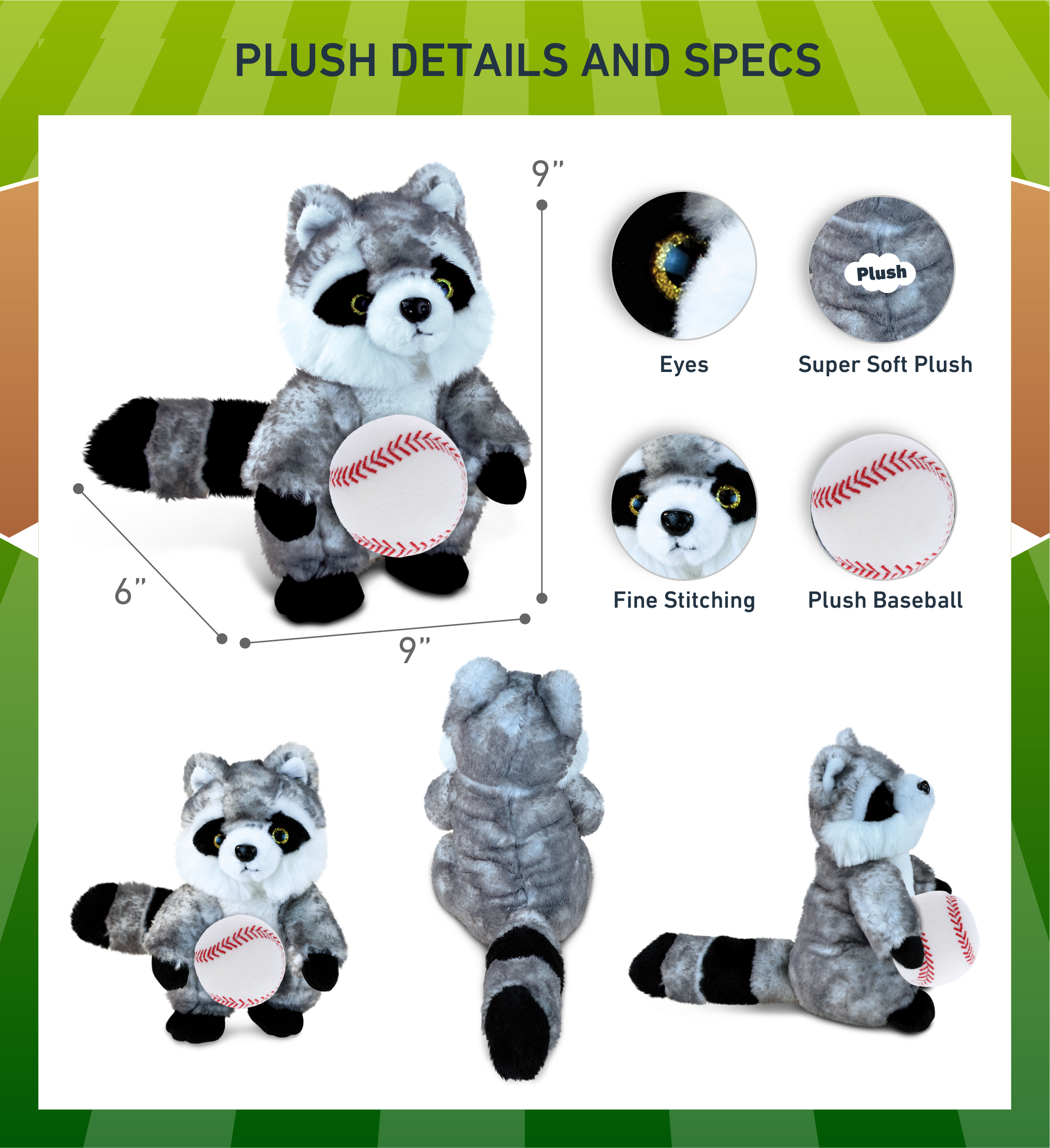- Included with The Purchase of Raccoon Plush with Baseball Ball – Includes 1 DolliBu Raccoon Super Soft Stuffed Animal with a baseball plush, decorated with realistic features of a raccoon. The baseball sports ball is attached to the raccoon’s body, making it perfect for cuddles. The raccoon plush toy features realistic details. The raccoon’s eyes make the critter so charming. The cute plush toy buddy measures 9Lx6Wx9H inches.