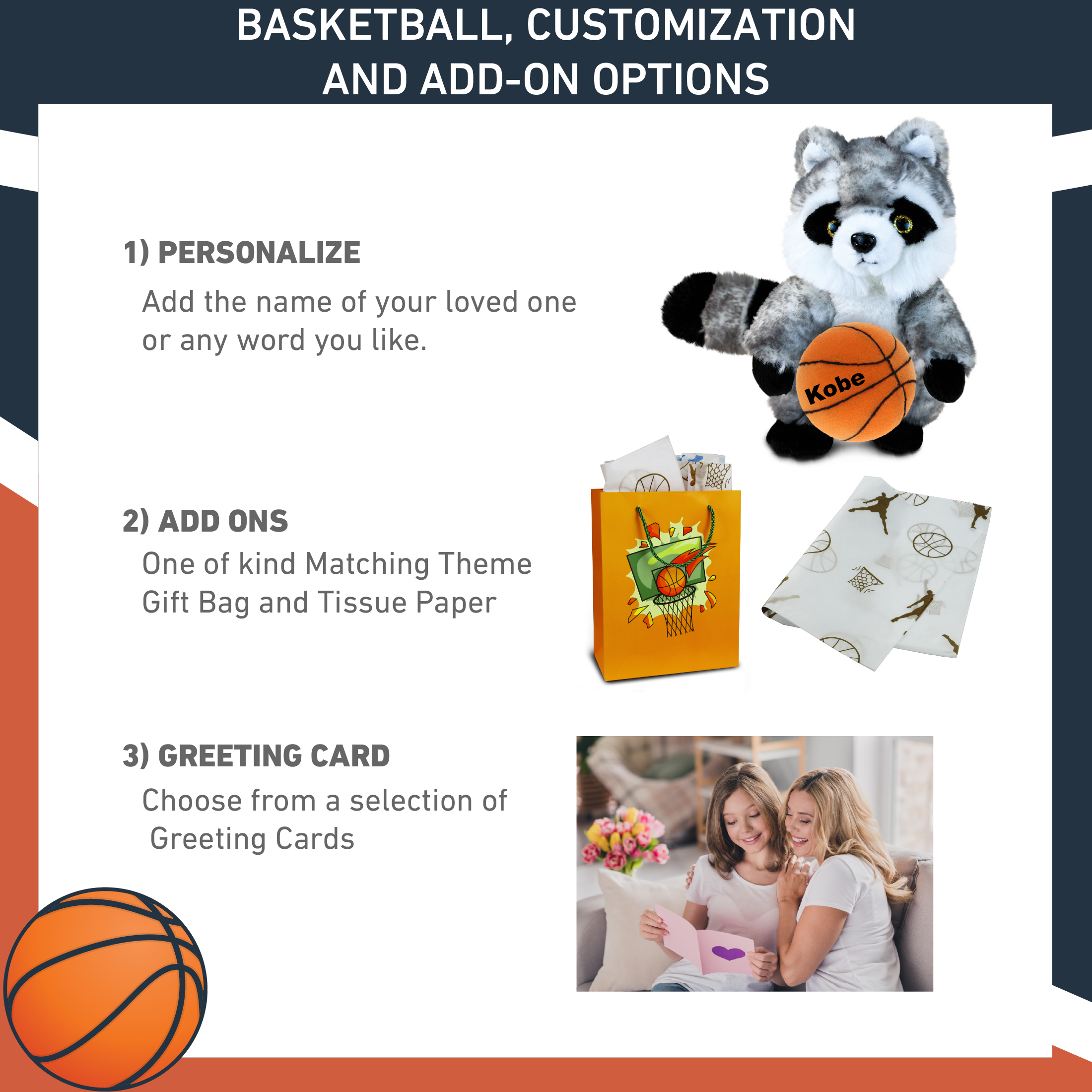 - Personalization, Customization, and Add-On Options – The Super Soft Sports Stuffed Animal Raccoon comes customized with a Basketball Plush. You can personalize your raccoon plush toy with the name of your loved one, which we will imprint on the item. You also have the option to add some or all of the cool add-ons to make your plush gift extra special: 1) Gift Bag; 2) Tissue Paper; 3) Greeting Card.