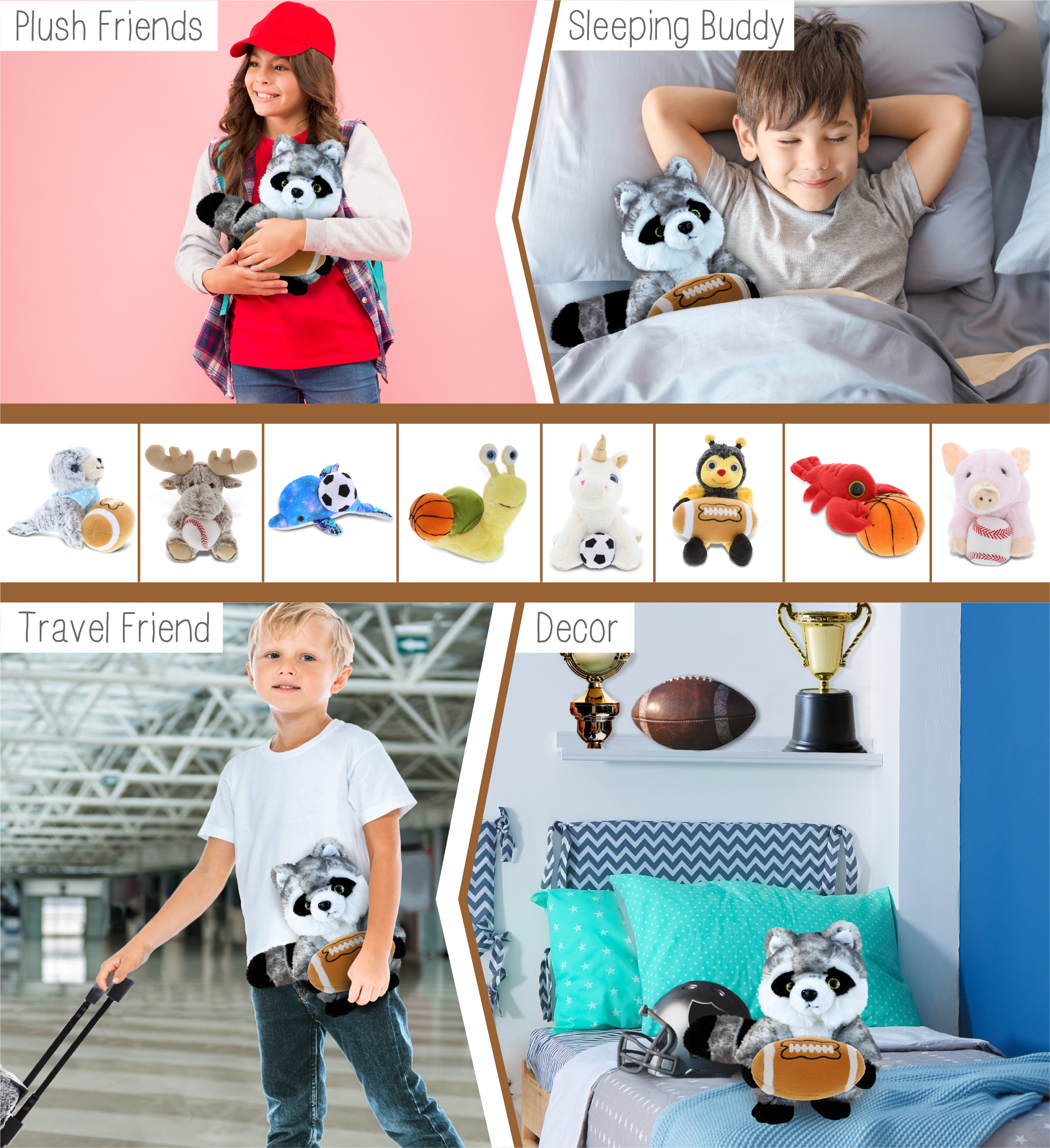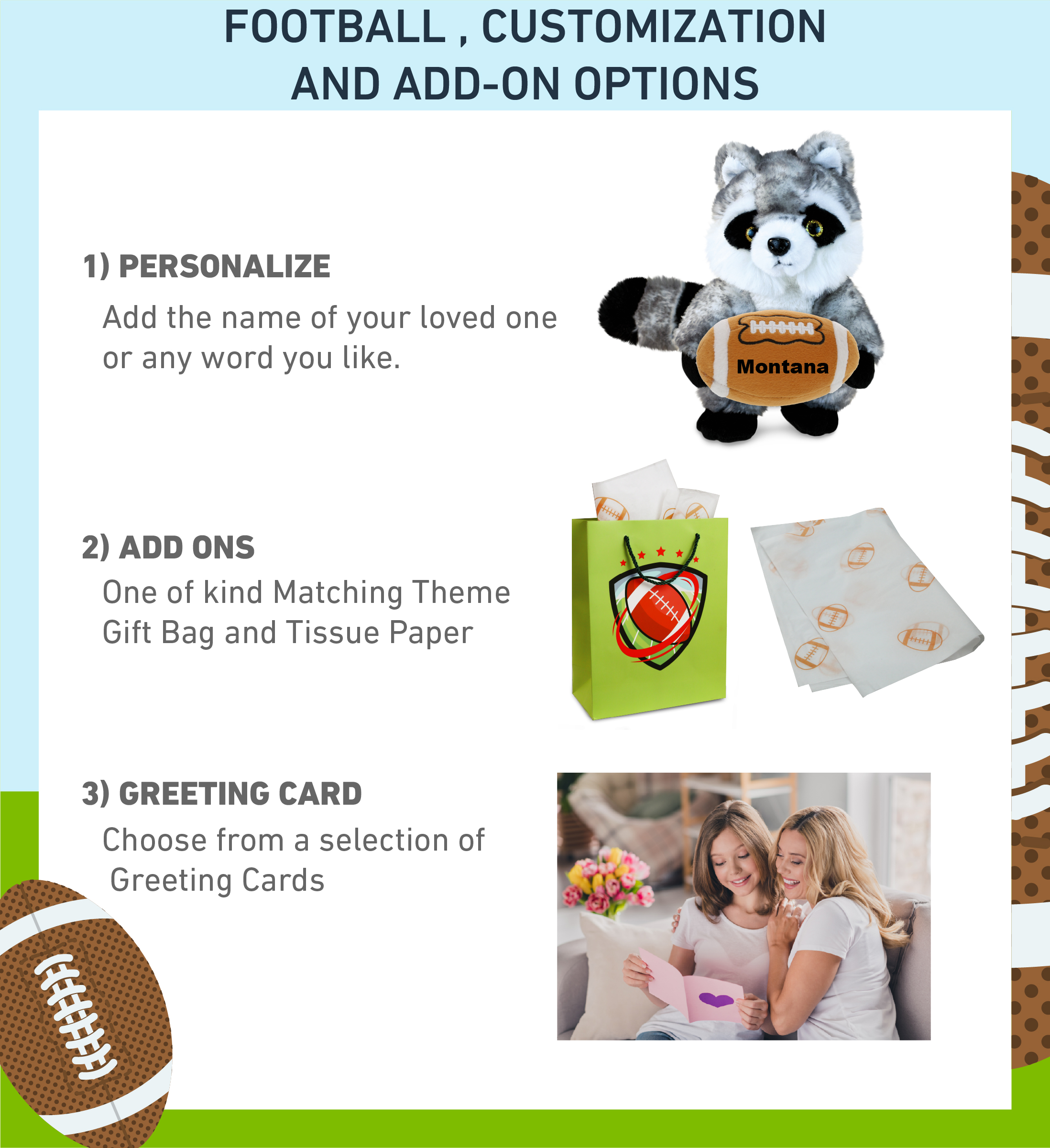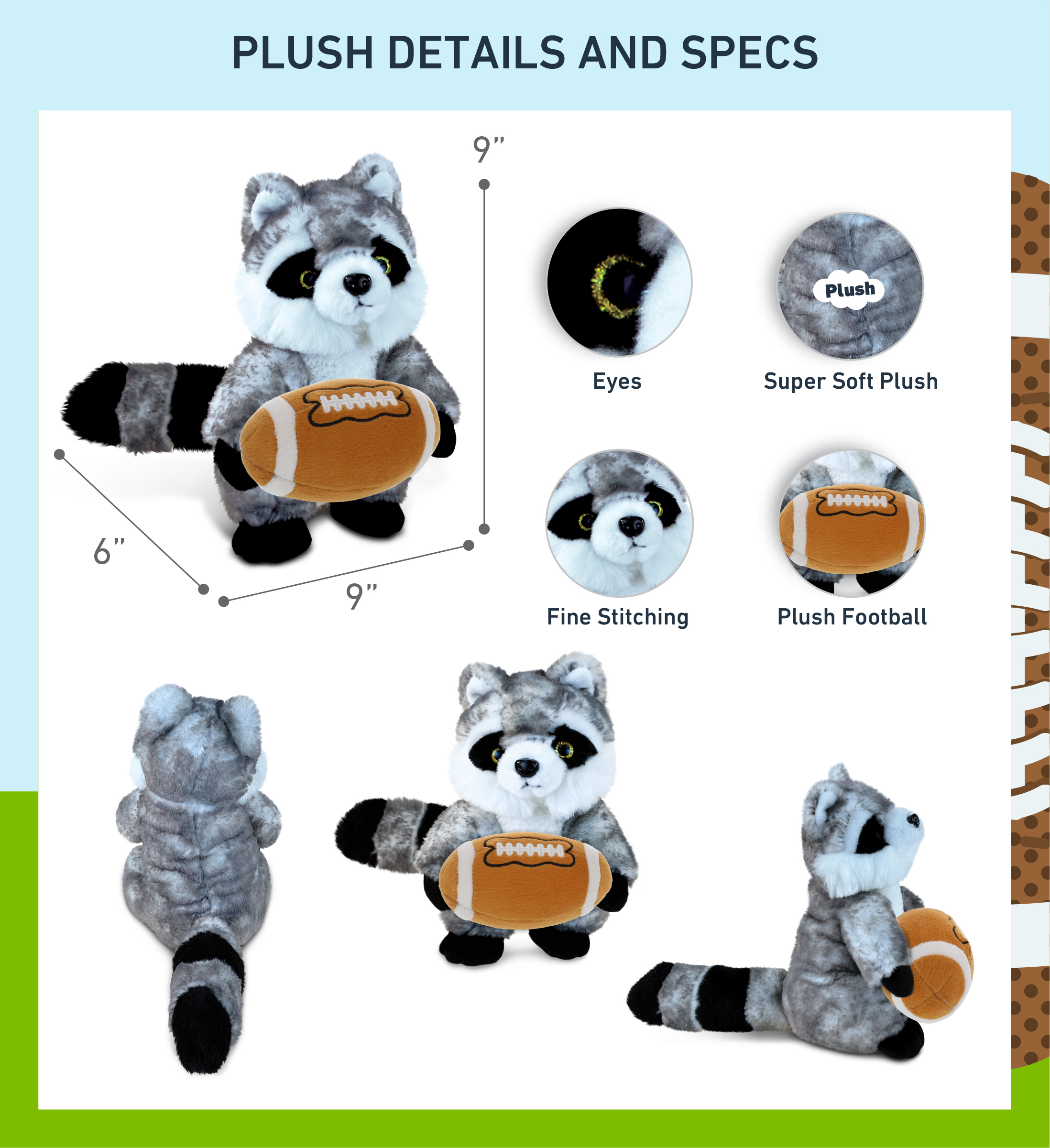 - Personalization, Customization, and Add-On Options – This Super Soft Sports Stuffed Animal Raccoon Plush comes customized with a football plush. You can personalize it with the name of your loved one imprinted on the item. You also have the option to add some or all of the cool add-ons to make your gift extra special: 1) Gift Bag; 2) Tissue Paper; 3) Greeting Card.