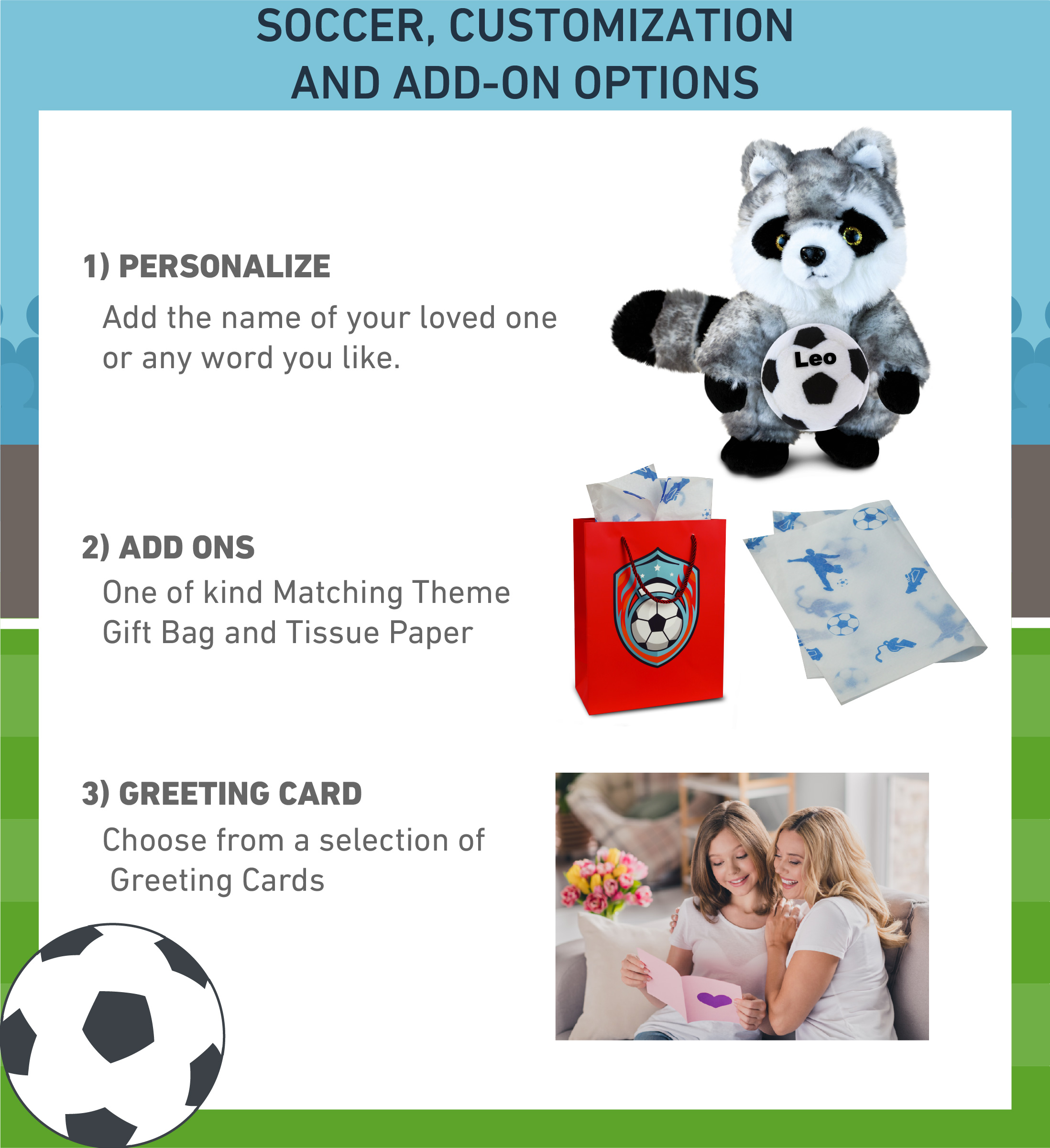 - Personalization, Customization, and Add-On Options – Super Soft Sports Stuffed Animal Raccoon comes customized with a Soccer Ball Plush. You can personalize it with the name of your loved one imprinted on the item. You also have the option to add some or all of the cool add-ons to make your gift extra special: 1) Gift Bag; 2) Tissue Paper; 3) Greeting Card.