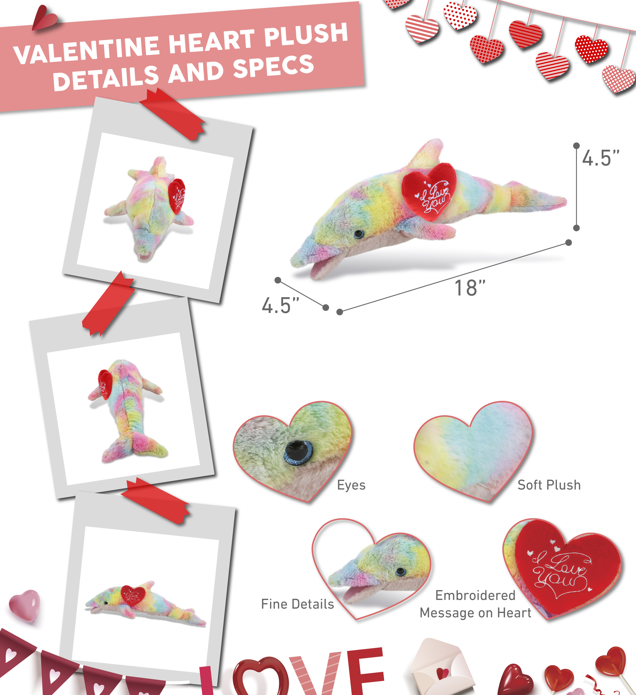 • INLUDED WITH THE PURCHASE OF VALENTINE PLUSH – Includes 1 DolliBu Rainbow Dolphin Valentines Day Stuffed Animal Plush with a romantic message embroidered on the red stuffed heart plush. Make this Valentine’s Day plush a sweet stuffed animal Valentine gift for boyfriend or girlfriend. husband, wife, or a cute dolphin plush surprise for your kids who love playing with stuffed dolphins. The stuffed dolphin plush measures 18LX4.5WX4.5H inches.