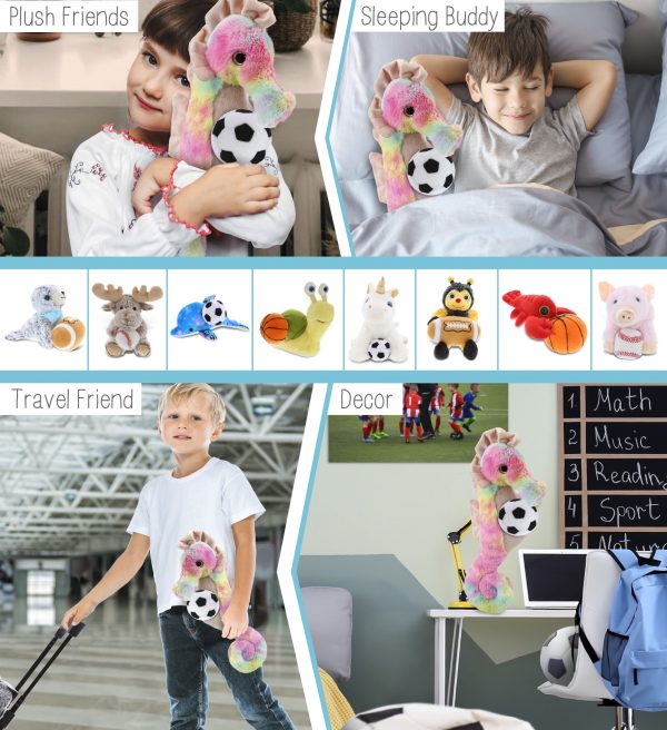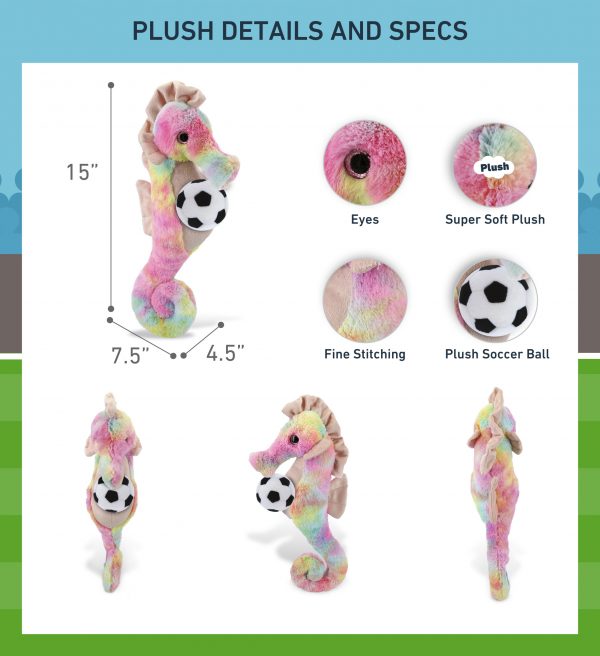 - HIGH QUALITY SUPER SOFT PLUSH RAINBOW SEAHORSE STUFFED ANIMAL – The machine-sewn seahorse toy plush and soccer ball is made of premium-quality polyester, stuffed with soft fluffy polyester fillings. Made with durable and child-friendly features. Cute seahorse standing upright. Cute soft toys designed to be your little one’s best buddies. To maintain fluffy stuffed animals, wash seahorse plush toys with cold soapy water and allow it to air dry.