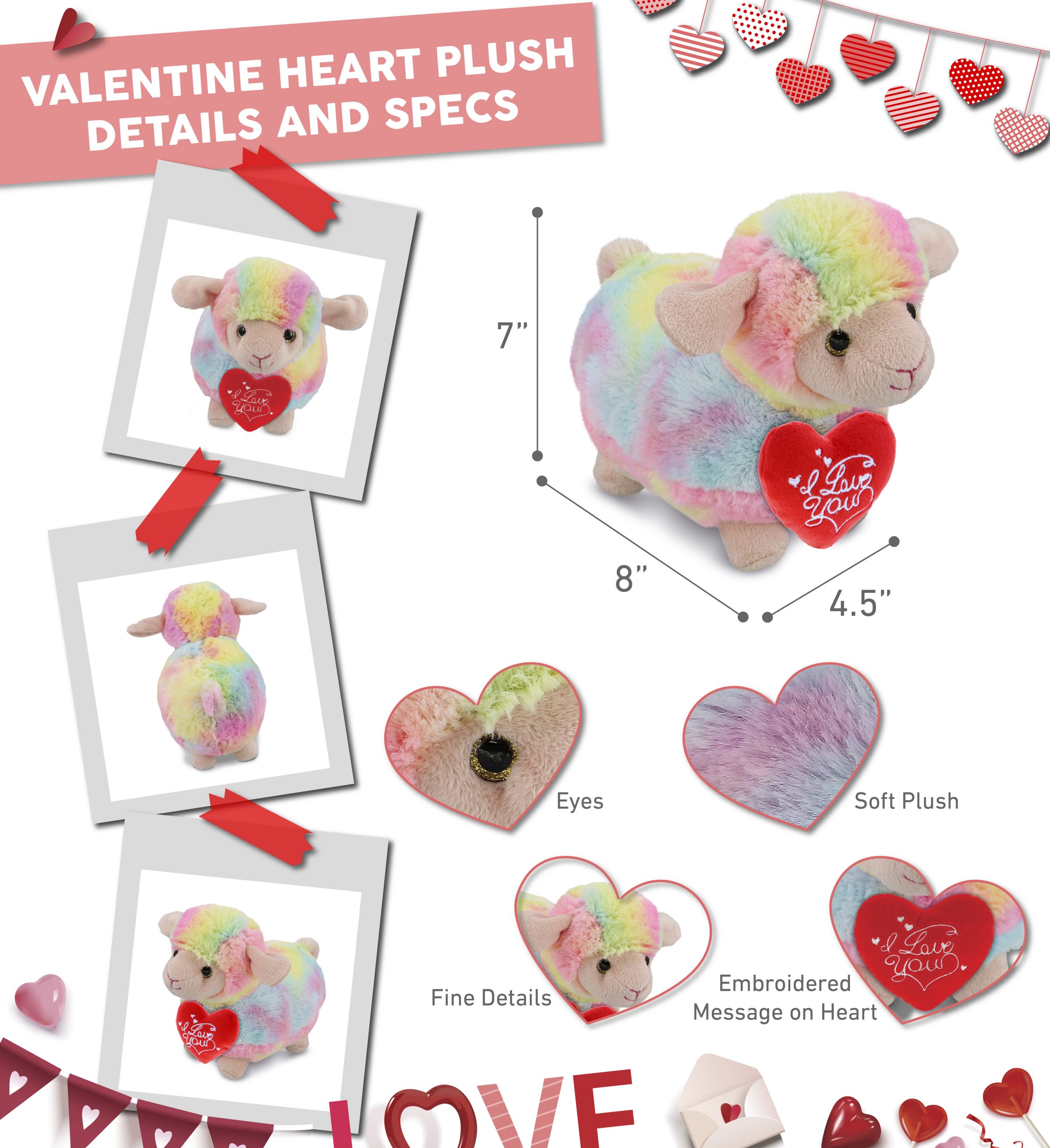 - INLUDED WITH THE PURCHASE OF VALENTINE PLUSH – Includes 1 DolliBu Rainbow Sheep Valentines Day Stuffed Animal Plush with a romantic message embroidered on the red stuffed heart plush. Make this Valentine’s Day plush a sweet stuffed animal Valentine gift for boyfriend or girlfriend. husband, wife, or a cute sheep plush surprise for your kids who love playing with stuffed sheep. The stuffed sheep plush measures 8LX4.5WX7H inches.