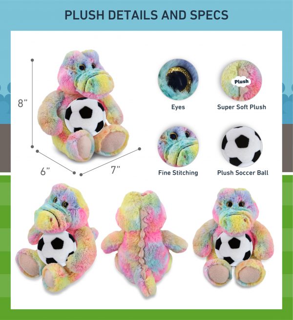 - INCLUDED WITH THE PURCHASE OF ADORABLE CUTE ALLIGATOR PLUSH – Includes 1 DolliBu Rainbow Sitting Alligator – Super Soft Plush with a soccer ball plush, decorated with realistic features of a cute alligator. The alligator’s body with a sports gift ball plush makes the plush perfect for cuddles. The plush toy displays the realistic features of an alligator. The eyes make the critter so charming. The cute plush toy buddy measures 7LX4.5WX8H inches.