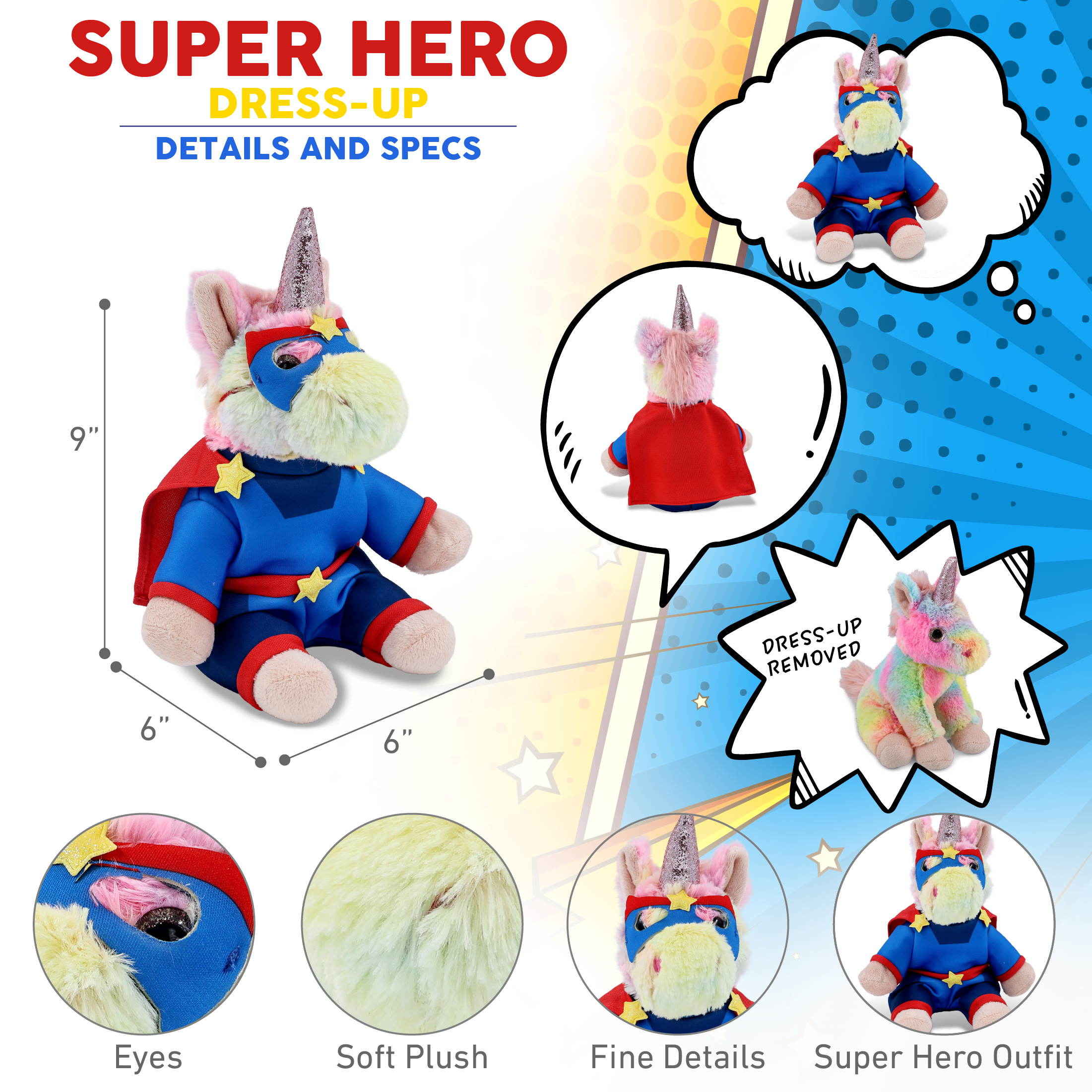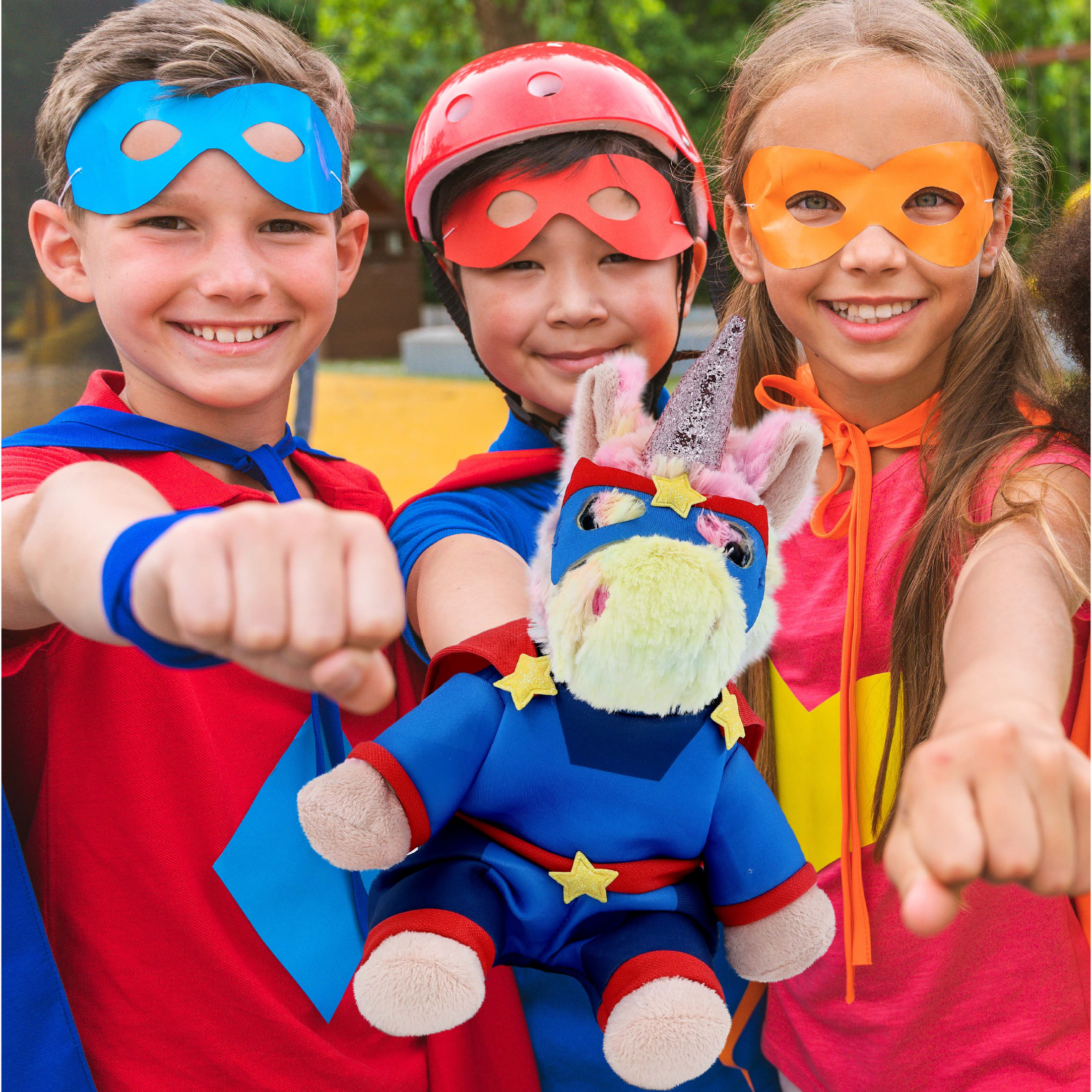 • Features a Cute Teddy Bear Plush with Superhero Cape Outfit – With a mask, suit, and cape, this unicorn stuffed plush toy comes with a playful and stylish look that results in two fun themes: fantasy and superheroes! Great teddy bear stuffed animal for adventure plush storytelling, animal toy kid playtime, or as a classroom buddy. A unique addition to any stuffed superhero lineup or plush animal kid collection with dressed stuffed animals.
