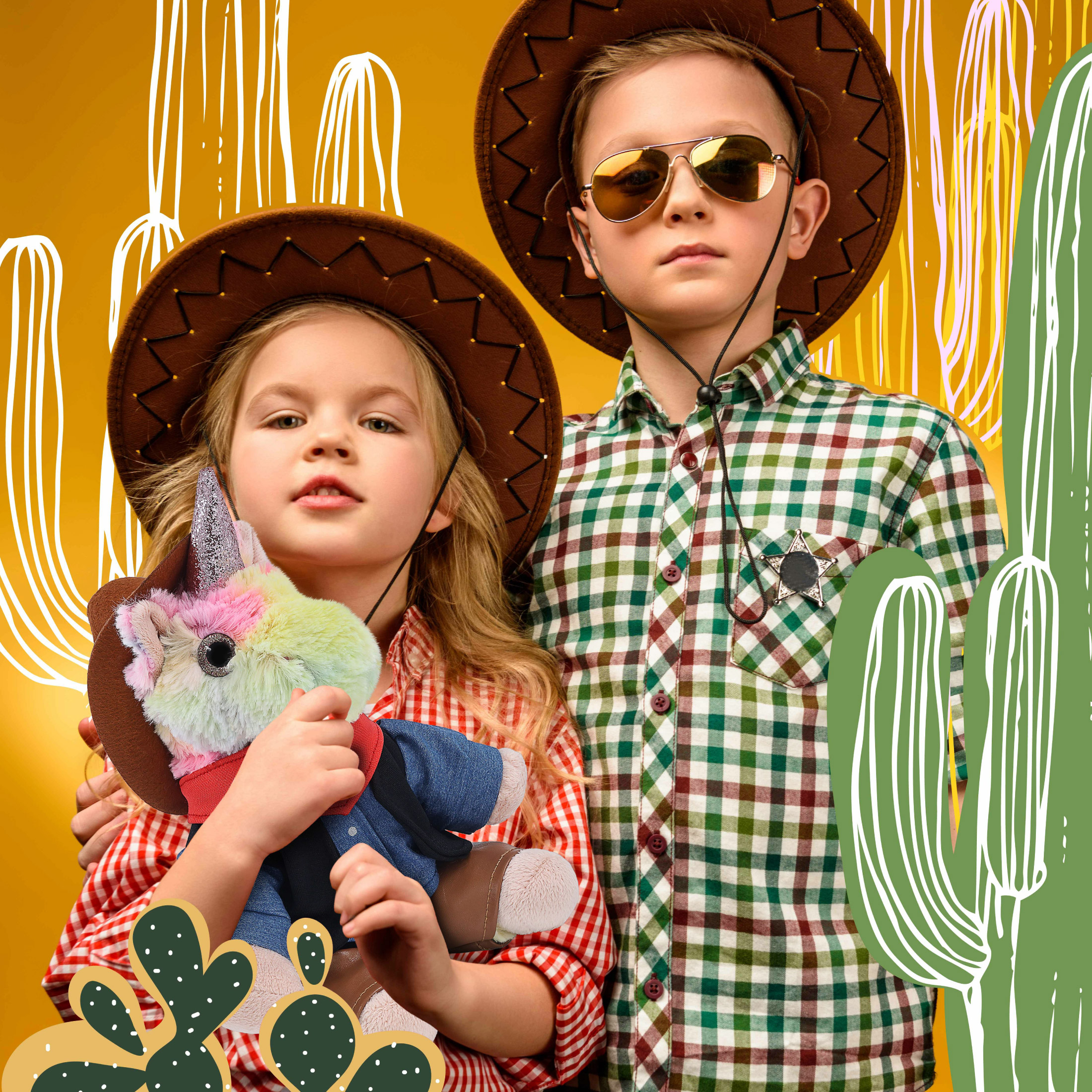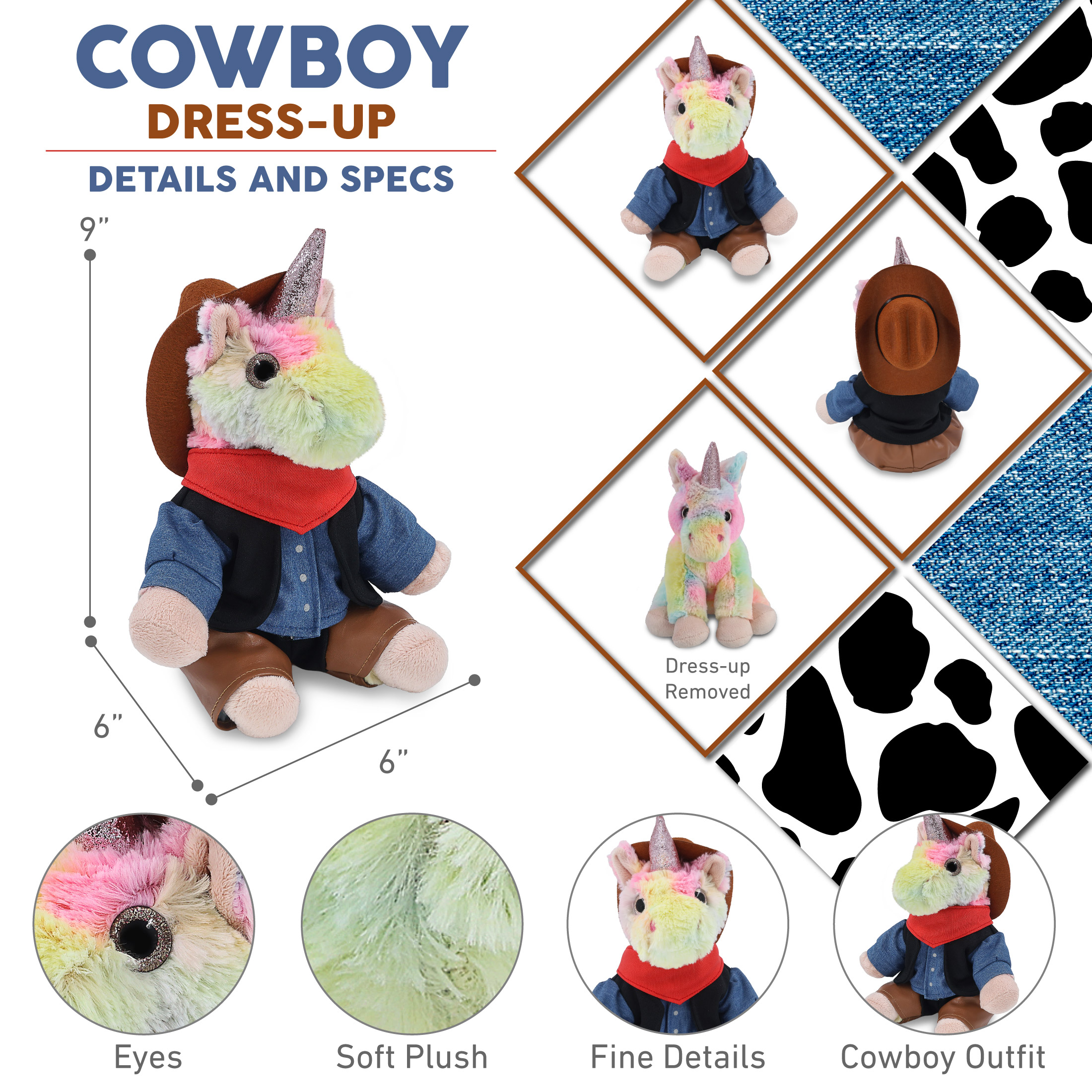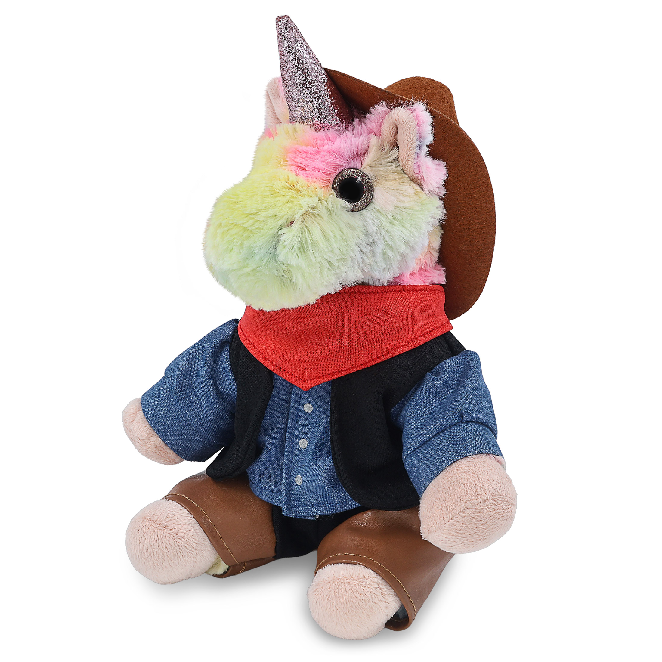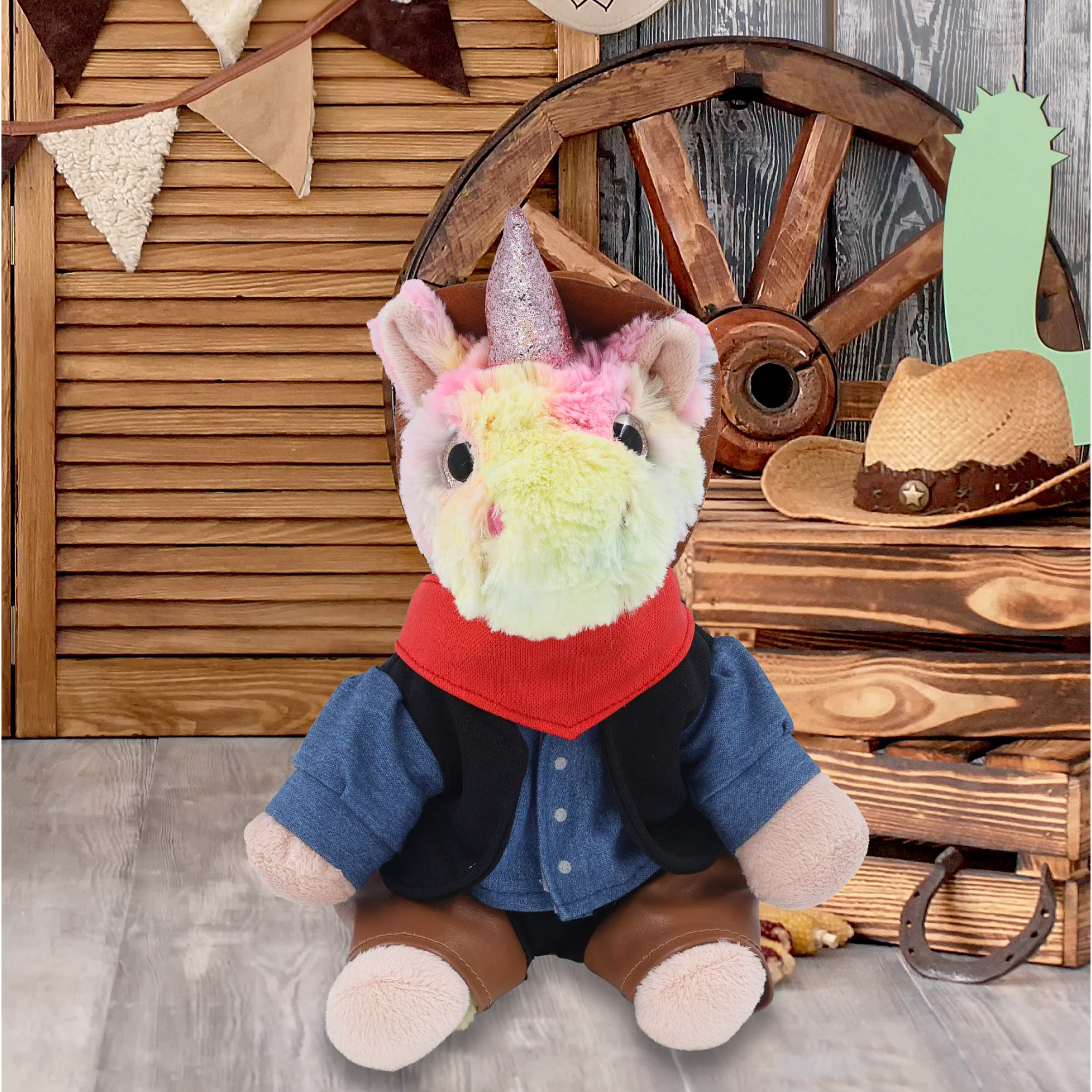 - Rainbow Unicorn with Western Outfit Features Realistic Details from its Cowboy Hat to Leather Chaps – From its doll cowboy hat to detailed outfit, this unicorn figure rocks a look that’s both fun and stylish. The combo of unicorn toy and cowboy accessories creates two playful themes, fantasy and the Wild West. The plush unicorn with cowboy bear outfit makes the perfect addition to your collection of plush toys and cool stuffed animal clothing.